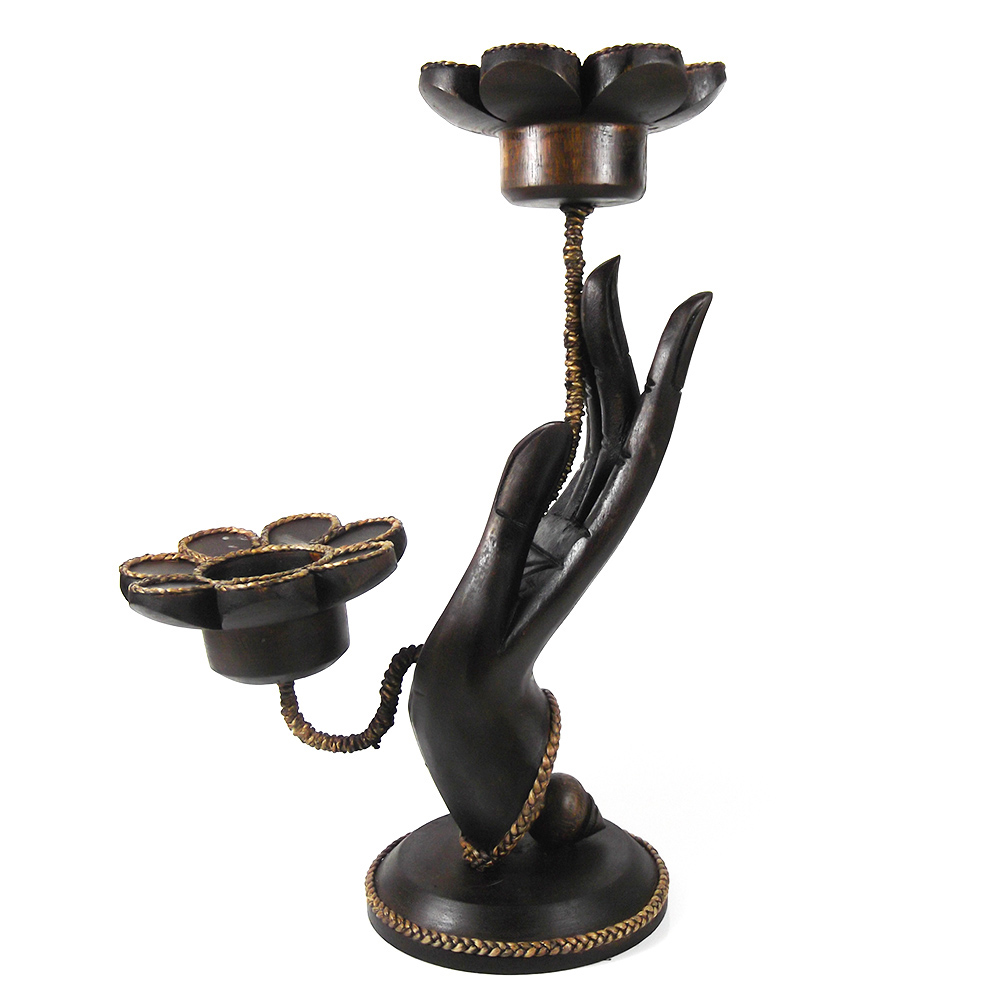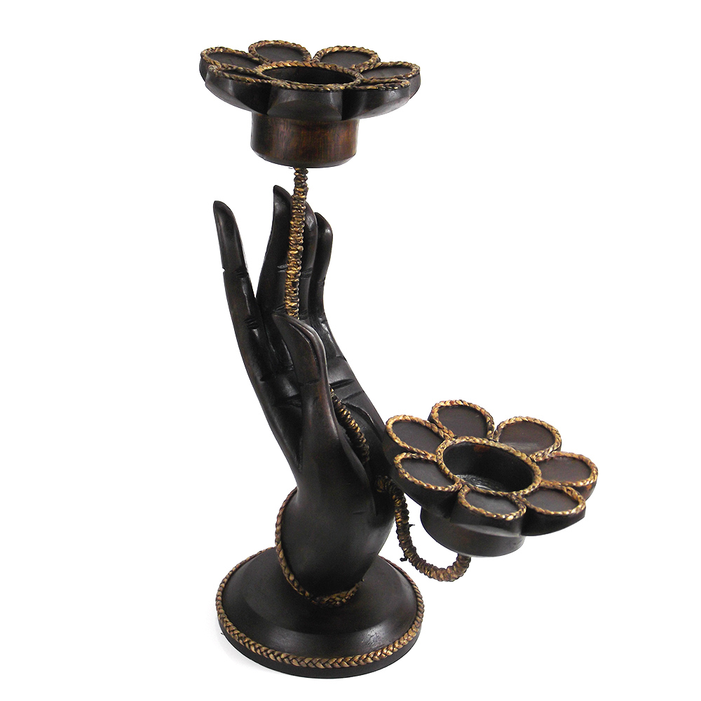 Add a touch of Artisan craftsmanship to any setting with a beautiful hand mudra candle holder. This candle holder is carved of rain tree wood by Artisan Aree and showcases the hand pose known as "Gesture of Blessing."