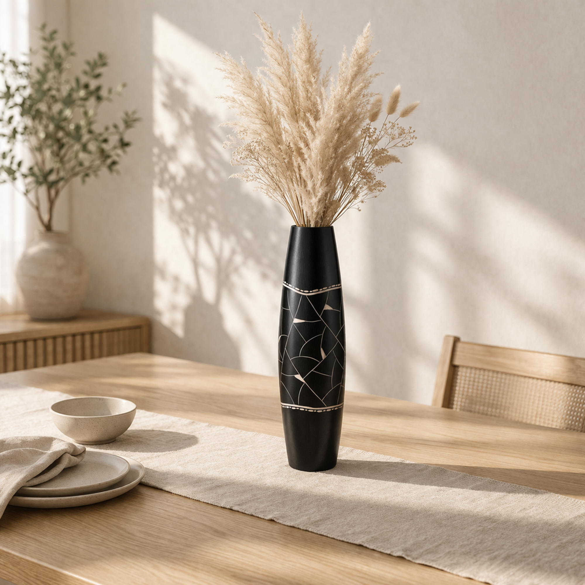 A creative combination of modern design with natural materials results in this beautiful vase from Thai artisan Saranya. For this design, she uses mango wood, which is a sustainable wood that grows abundantly in Thailand. A modern chic tiled mosaic pattern decorates this piece, giving it a unique touch of style. A beautiful color scheme graces the wood color while adding a stunning contrast. This versatile vase measures in with a height of 14 inches and would make an absolutely wonderful addition to any room in your home.