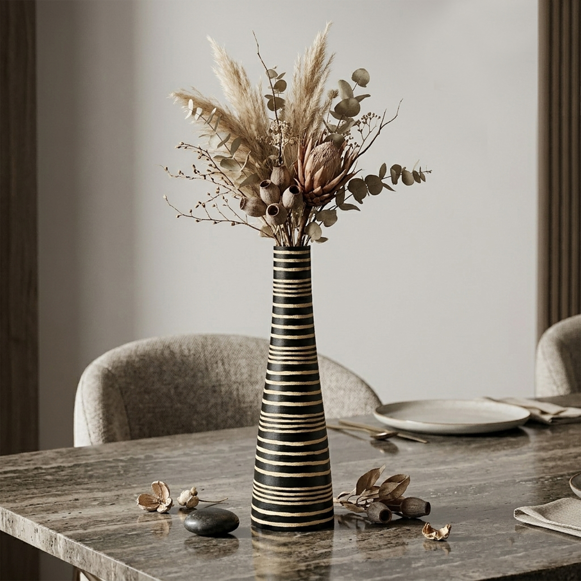 A beautiful combination of modern design with natural materials results in this beautiful vase from Thai artisan Thanat. For this design, he uses mango wood, which is a sustainable wood that grows abundantly in Thailand. A horizontal striped pattern decorates this piece, giving it a trendy vibe. A beautiful 2-tone color scheme uses the natural wood color while the dark black stain adds a stunning contrast. This bottle-shaped vase measures in with a height of 14 inches and would look absolutely amazing in any room in your home.