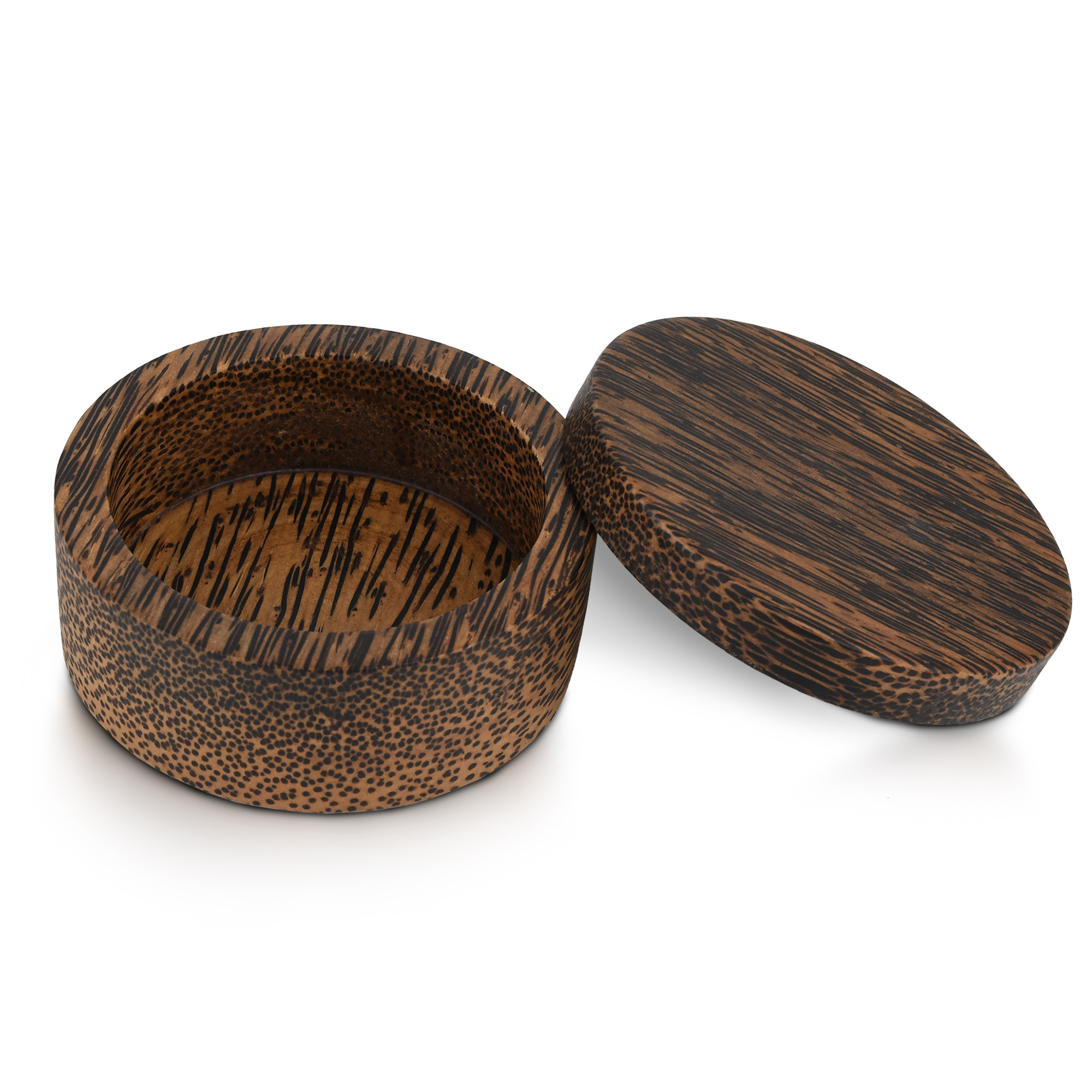 A stylish and unique place to store your jewelry, this beautifully crafted storage container will look amazing wherever you decide to put it. Using sustainable sugar palm tree wood, this simple design features an elegant wood grain which showcases the beauty found in nature. A great way to add a stylish and functional piece of home décor to your space, this round storage container is perfect for your nightstand. From the talented artisan Ping of Thailand, this jewelry box will add an elegant touch of Southeast Asia to you home.