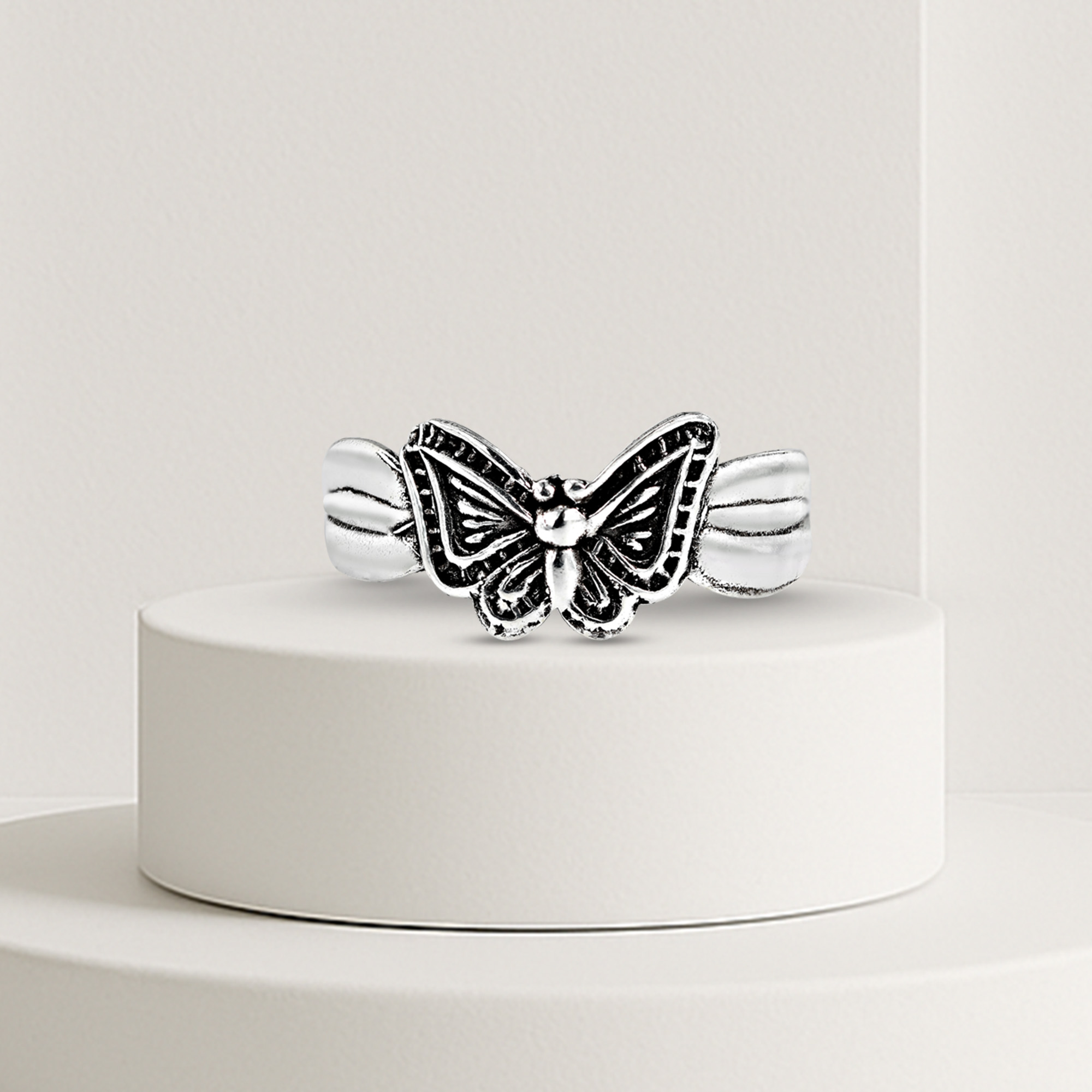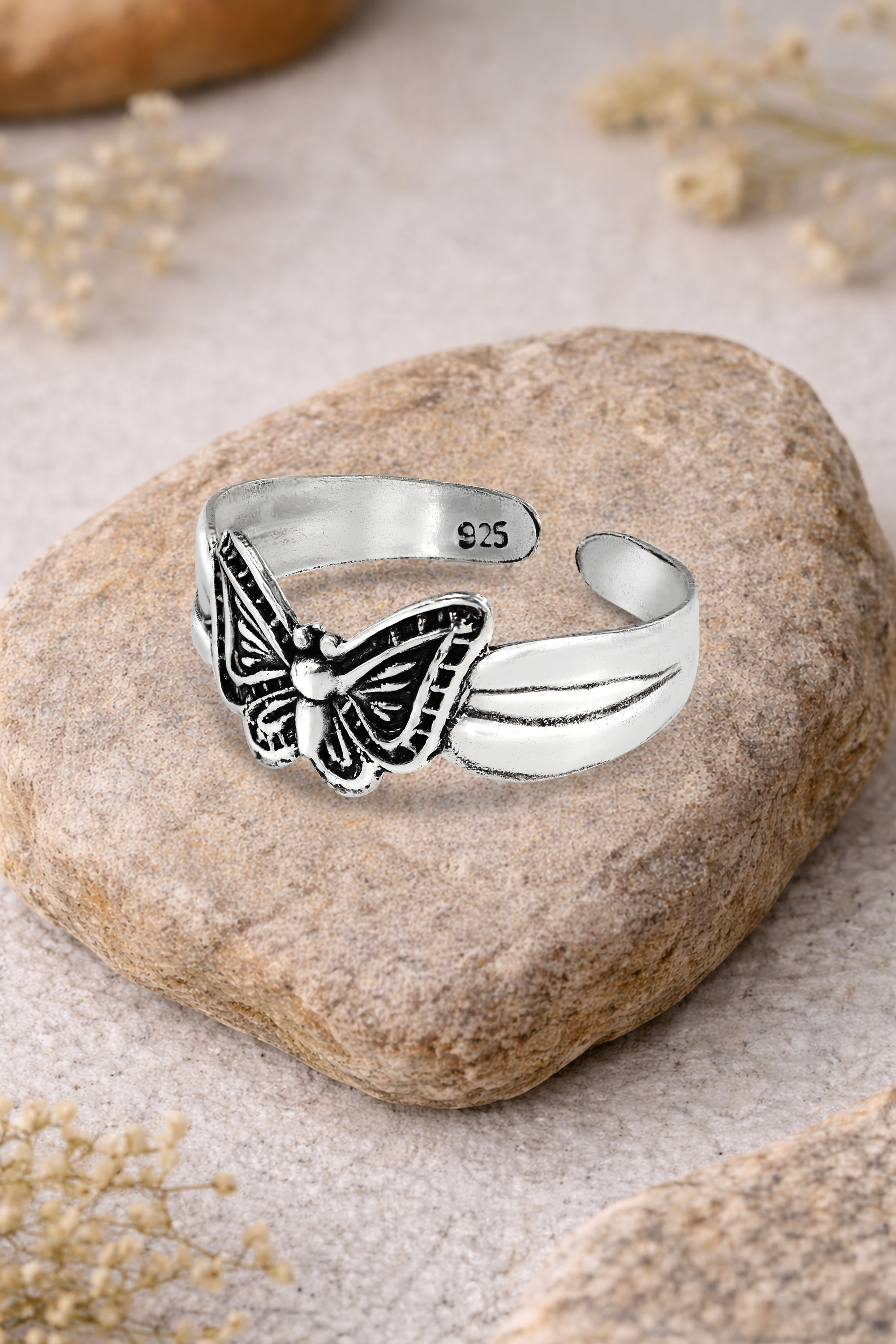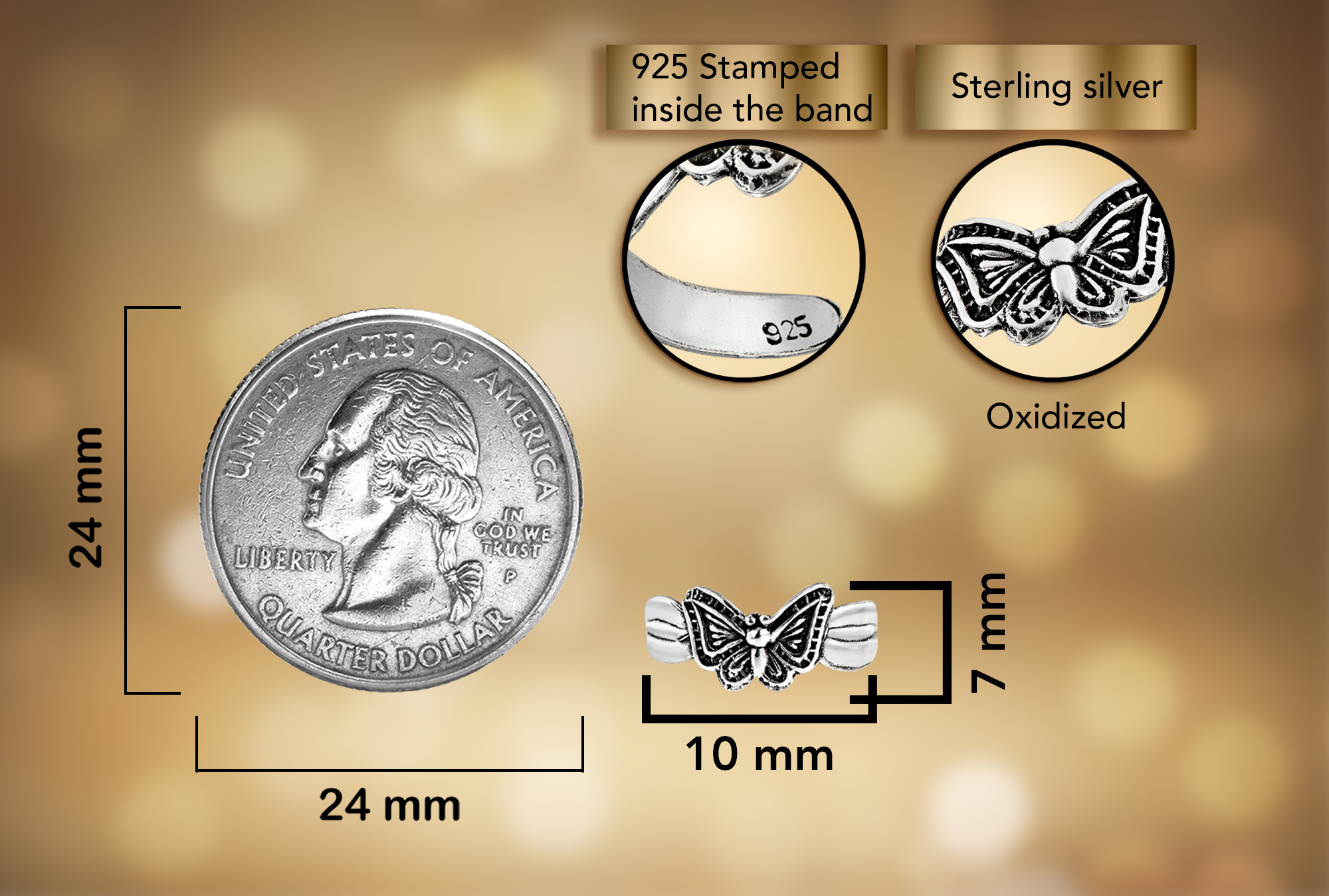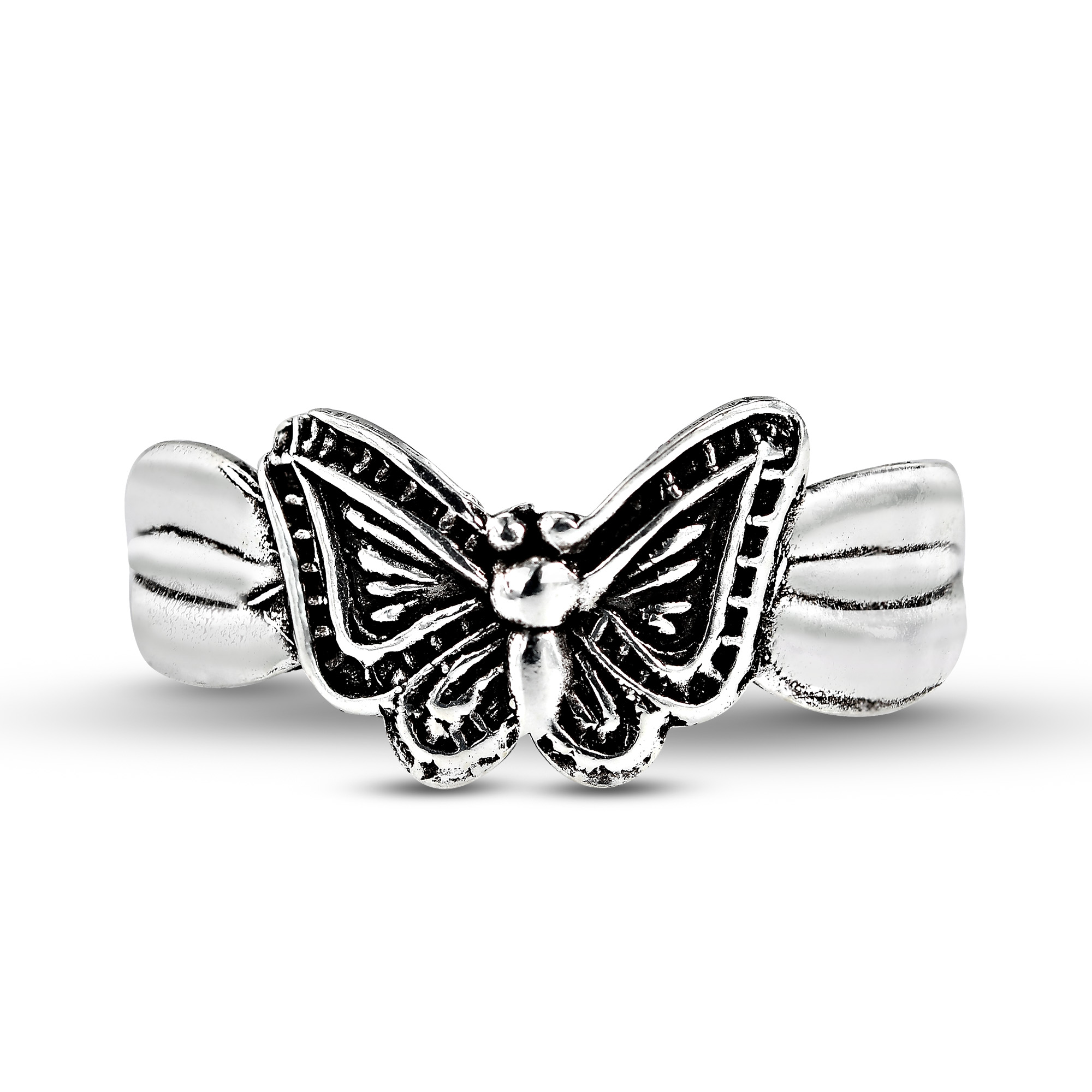 Add an exceptional and sweet charm to your everyday styling with this toe or pinky ring featuring a charm of a magical 3D butterfly in flight with an intricate and contrasted finish. Presented by artisan Watsud of Thailand, this design is both simple yet elegant at the same time set on a band of fine sterling silver metal. An adjustable design allows for a perfect fit either way you wear it. Add this whimsical adorable wonder to any casual or formal look.