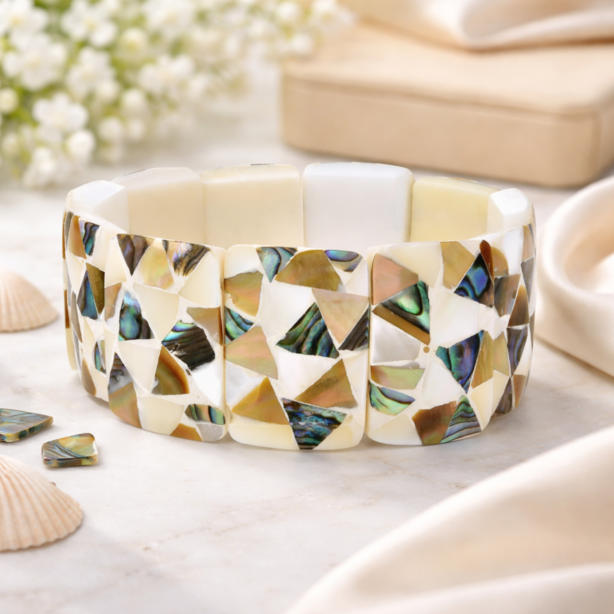 Contemporary Confetti Shards Mixed Seashell Mosaic Stretch Fit Bangle Bracelet