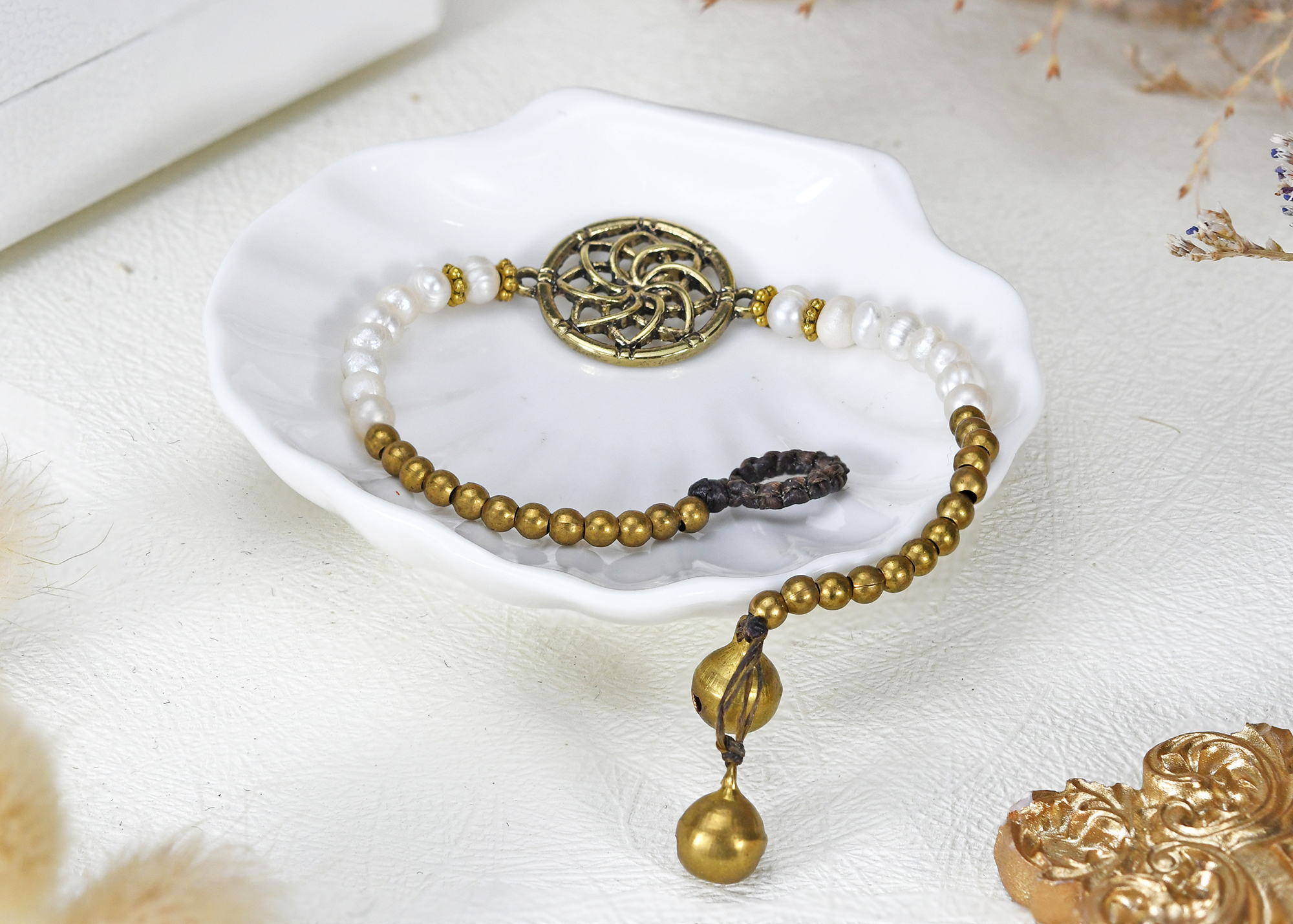 | Material: | Cotton wax rope, jingle bell brass, brass beads |