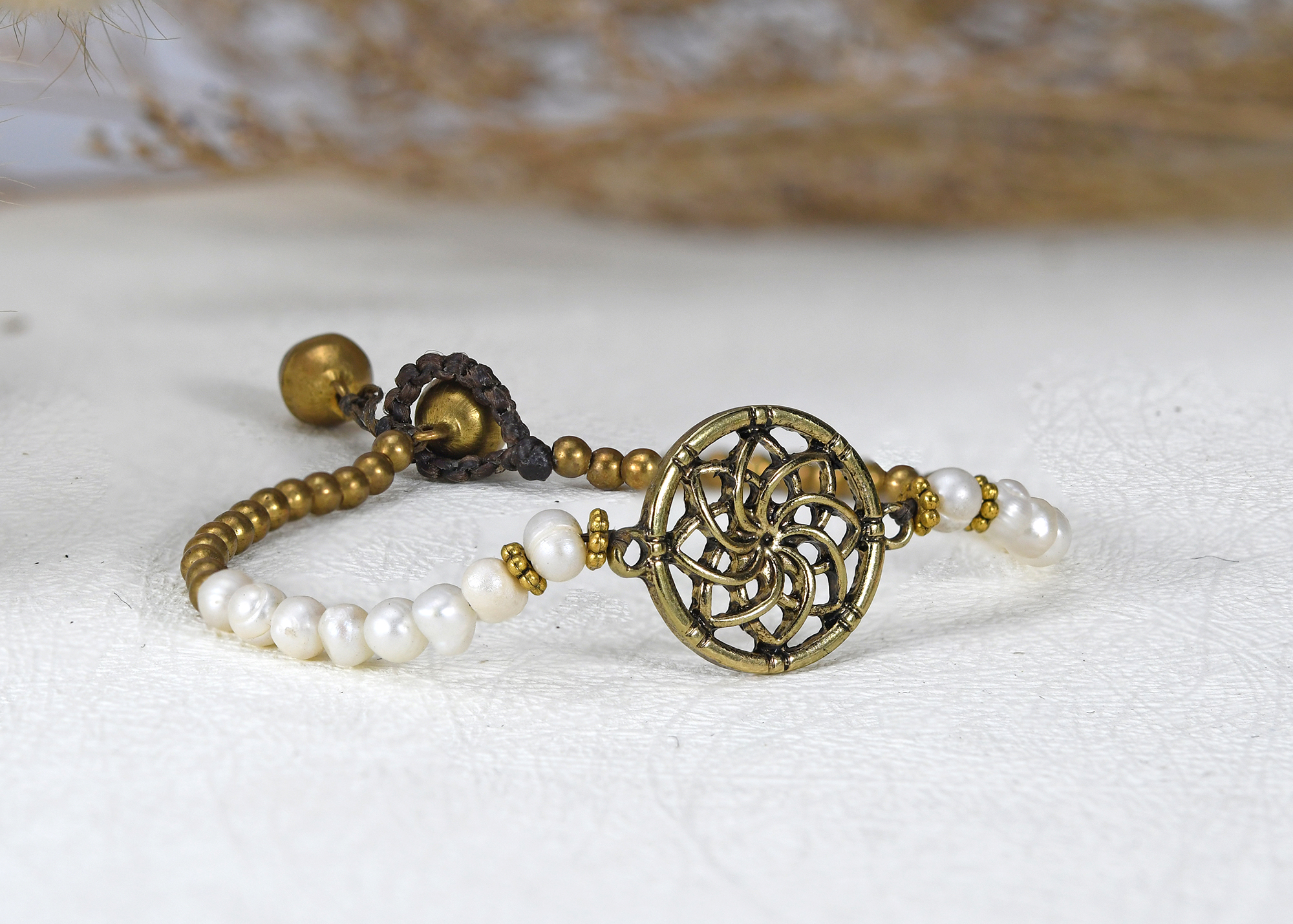The beautiful lotus blossom symbolizes purity and enlightenment, which has inspired artisan Tor of Thailand to create this stunning bracelet. For this design, he uses brass to create an intricate charm featuring a lotus blossom that is accented with iridescent pearls and brass beads. The band on this bracelet is made with cotton rope treated with wax and finished off with a jingle bell toggle clasp. Competing this trendy and versatile bracelet that will look amazing with whatever you are wearing.