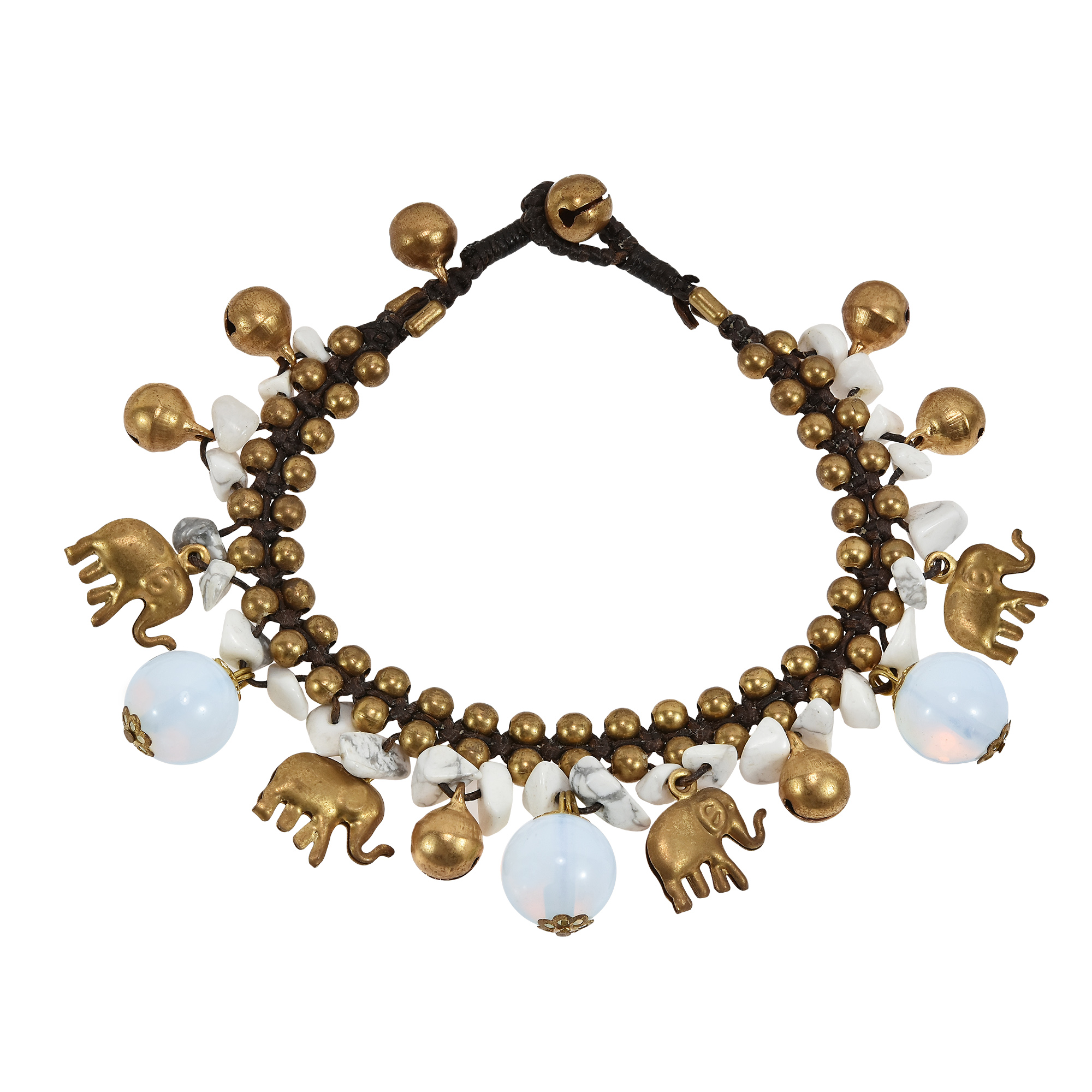 The regal elephant is a symbol of strength and wisdom in Thailand and these beautiful creatures have played an important role in the countries history. To honor this majestic animal, Thai artisan Tor transforms brass into this amazing charm bracelet. His design features an inner row of brass beads on cotton wax rope. The next layer features a row of stylish howlite stone and then a final row of lustrous moonstones and brass elephants. This bracelet is then finished off with a jingle bell clasp that will ring with every step. A truly unique and stylish accessory that will look amazing on you.