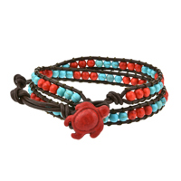 An alluring and exotic medley of tiger's eye, coral and turquoise stone describes this bracelet style handcrafted by Thai artisan Tor. Knotted individually by hand, this double wrap bracelet features a cool turtle closure.