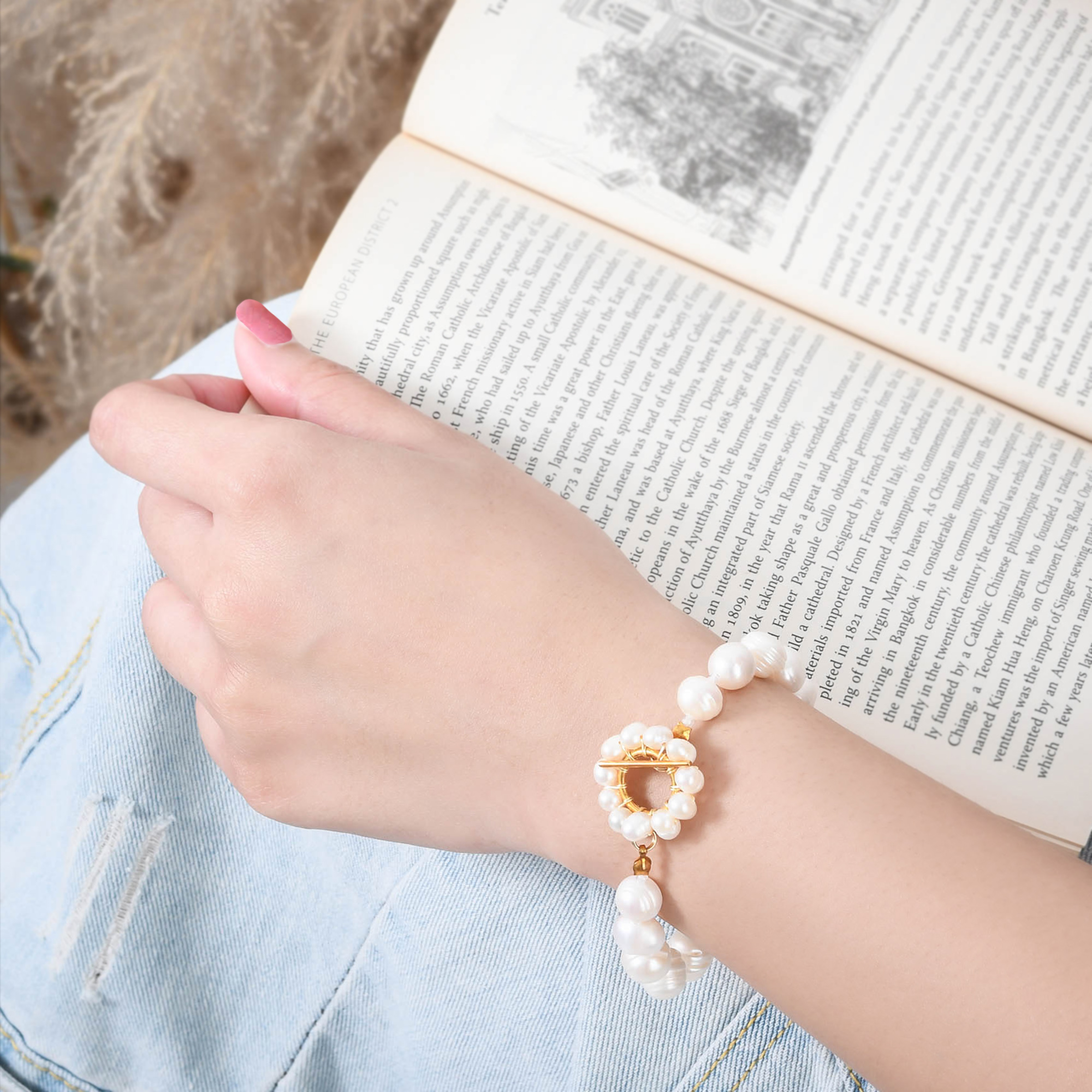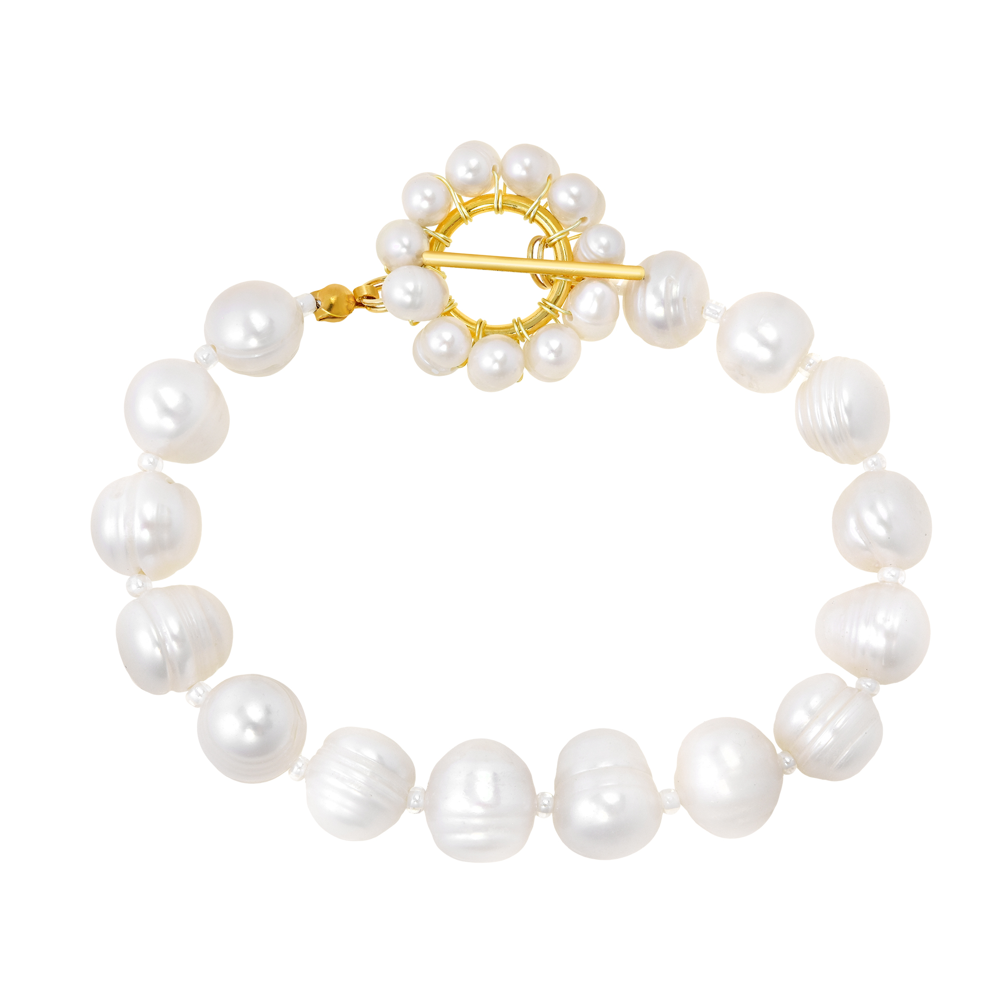 Stand out with this flawless bohemian piece crafted by the talented artisan Jib from Thailand. This stylish bracelet has a modern styling of white chunky freshwater pearls. It features a row of white pearls all around accentuated with a dramatic toggle pearl drop closure creating a luxurious classic accent. Crafted from gold-plated sterling silver, this vintage styling is a perfect addition to your jewelry collection.
