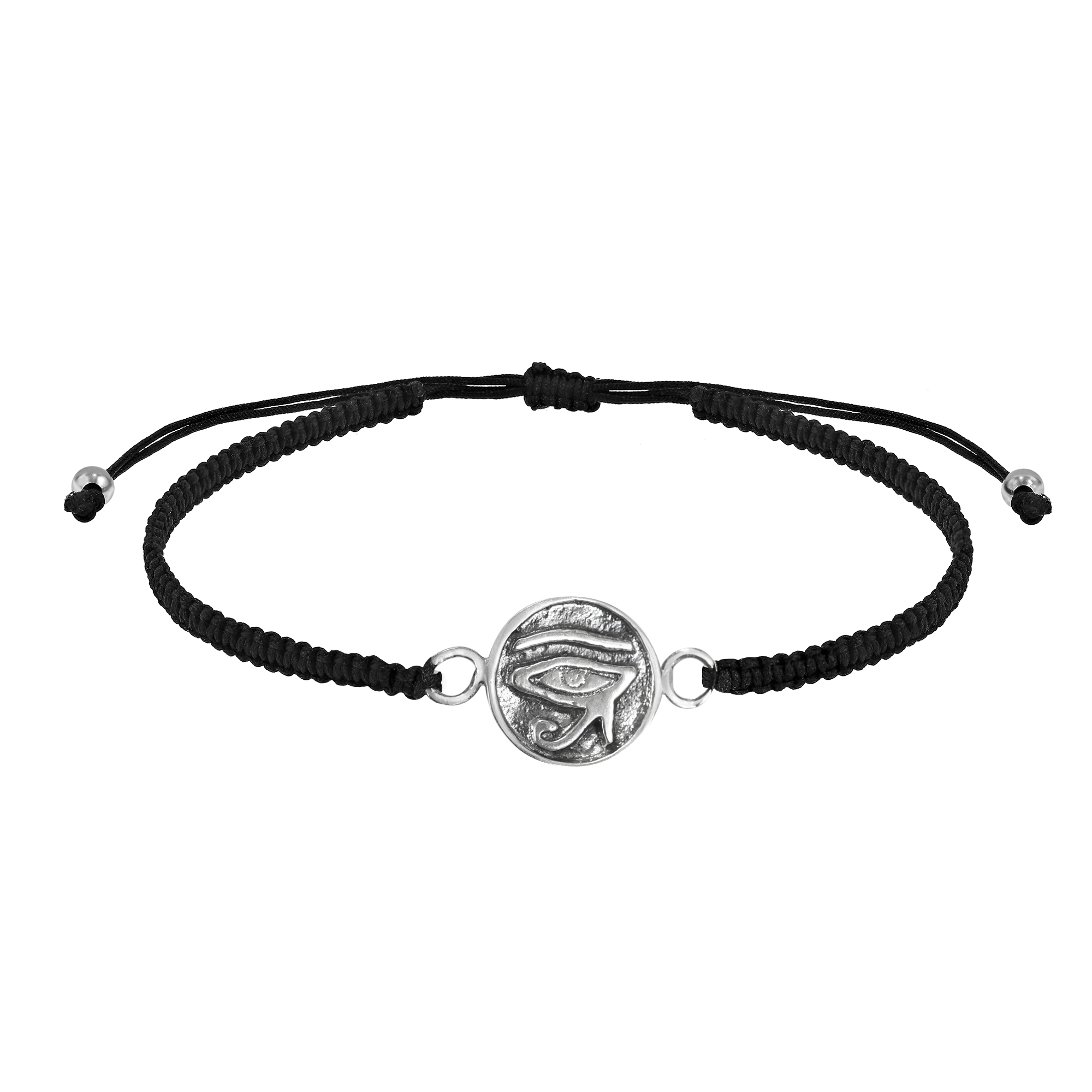 The Eye of Horus is an ancient Egyptian symbol of protection, royal power and good health. This piece features the Eye of Horus set in circle which is crafted from fine sterling silver. More Ancient Egyptian hieroglyphs create a stylish border while contrasting dark and shiny silver finishes highlight the intricate details. This meaningful charm is then set on a black silk rope and finished off with an adjustable pull slide, which ensures the perfect fit. Wear this macrame bracelet daily and add a touch of spiritual flair to any outfit.