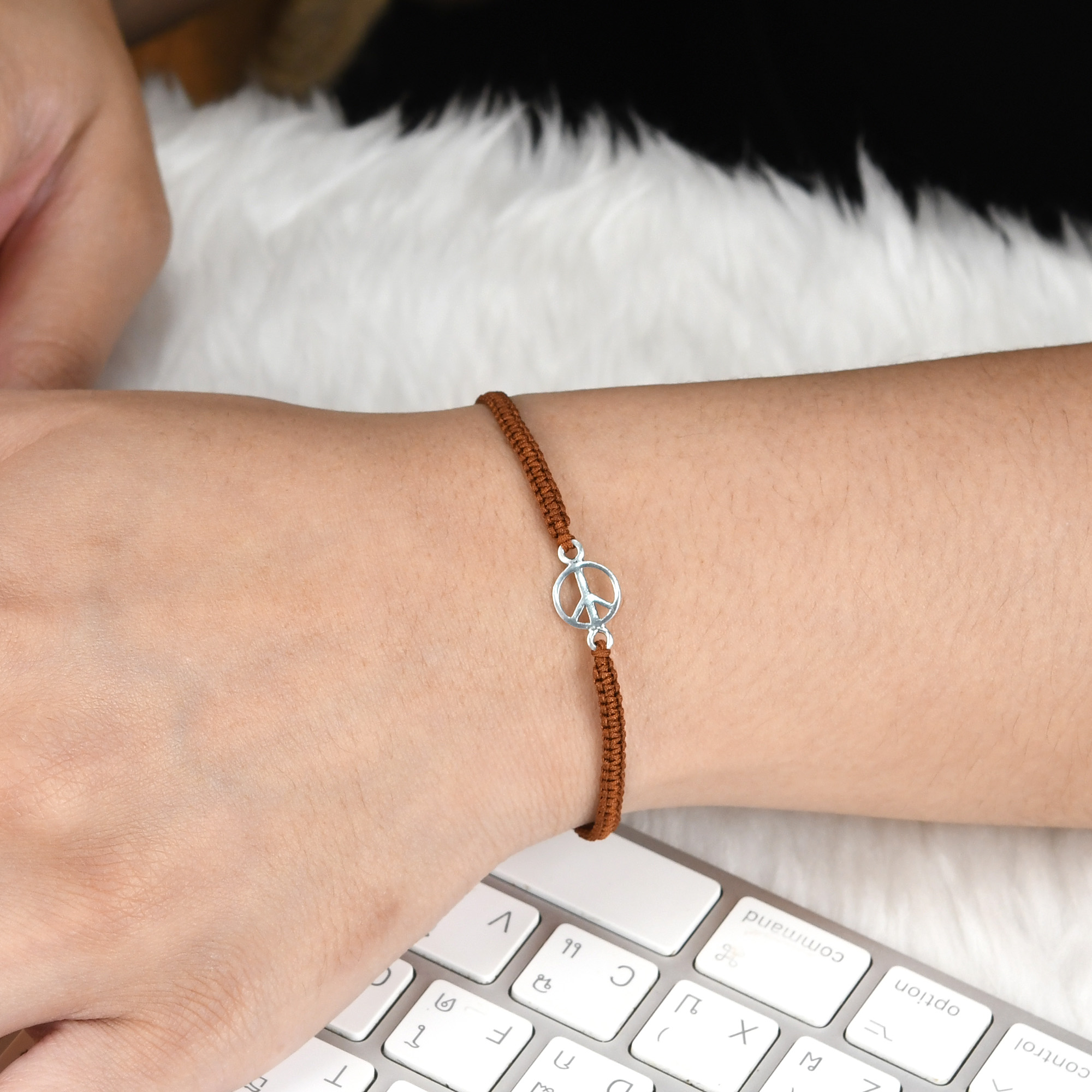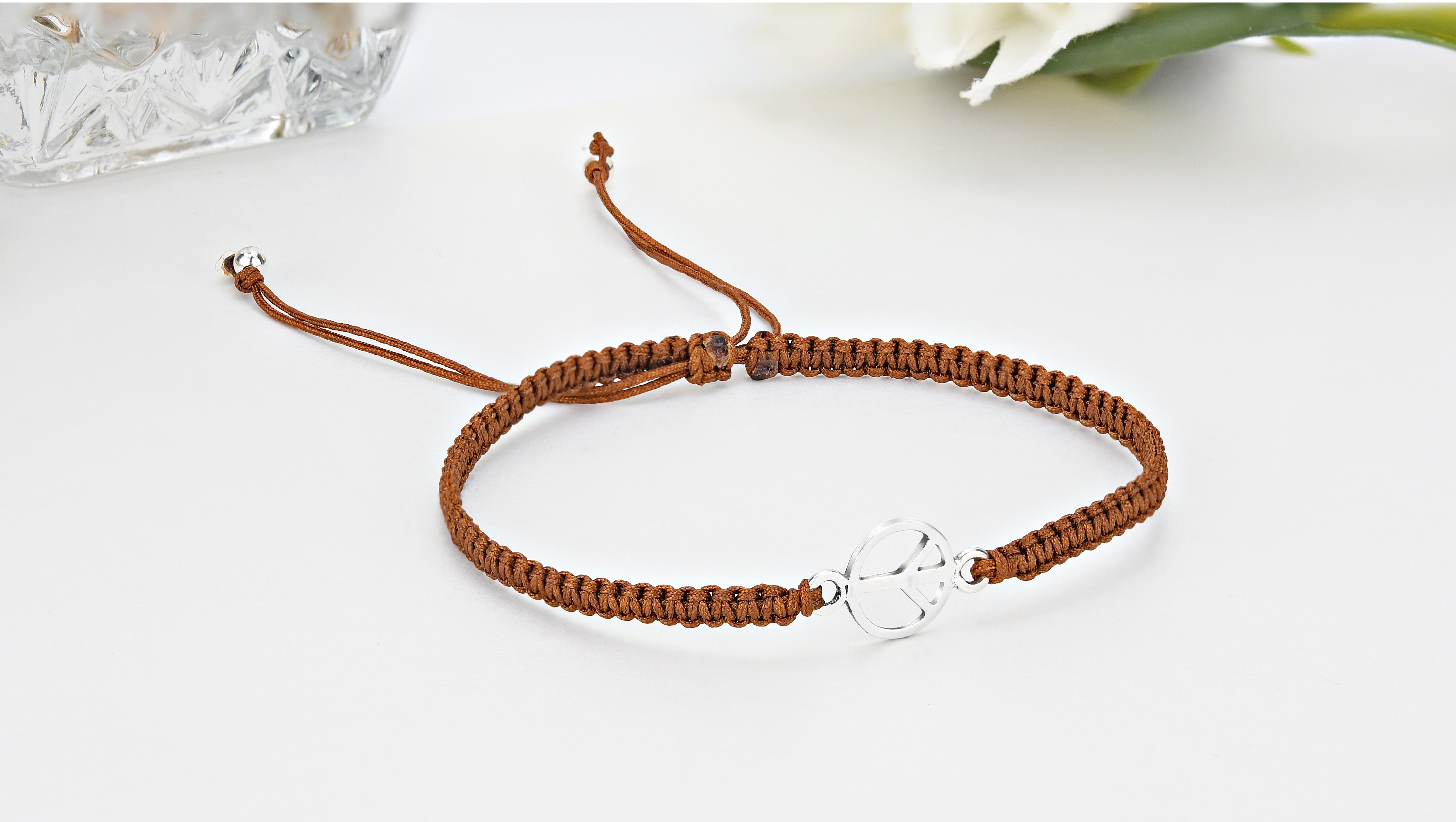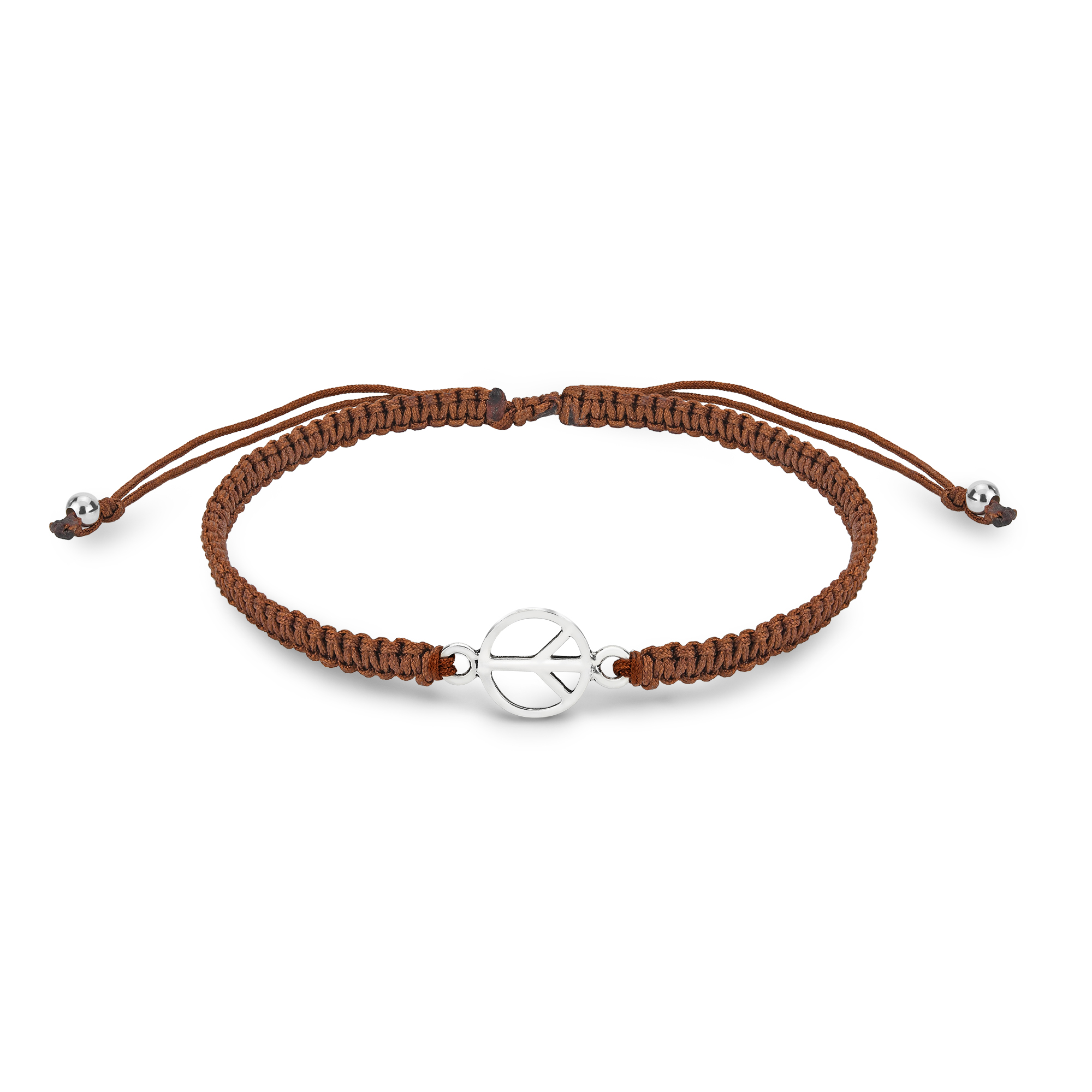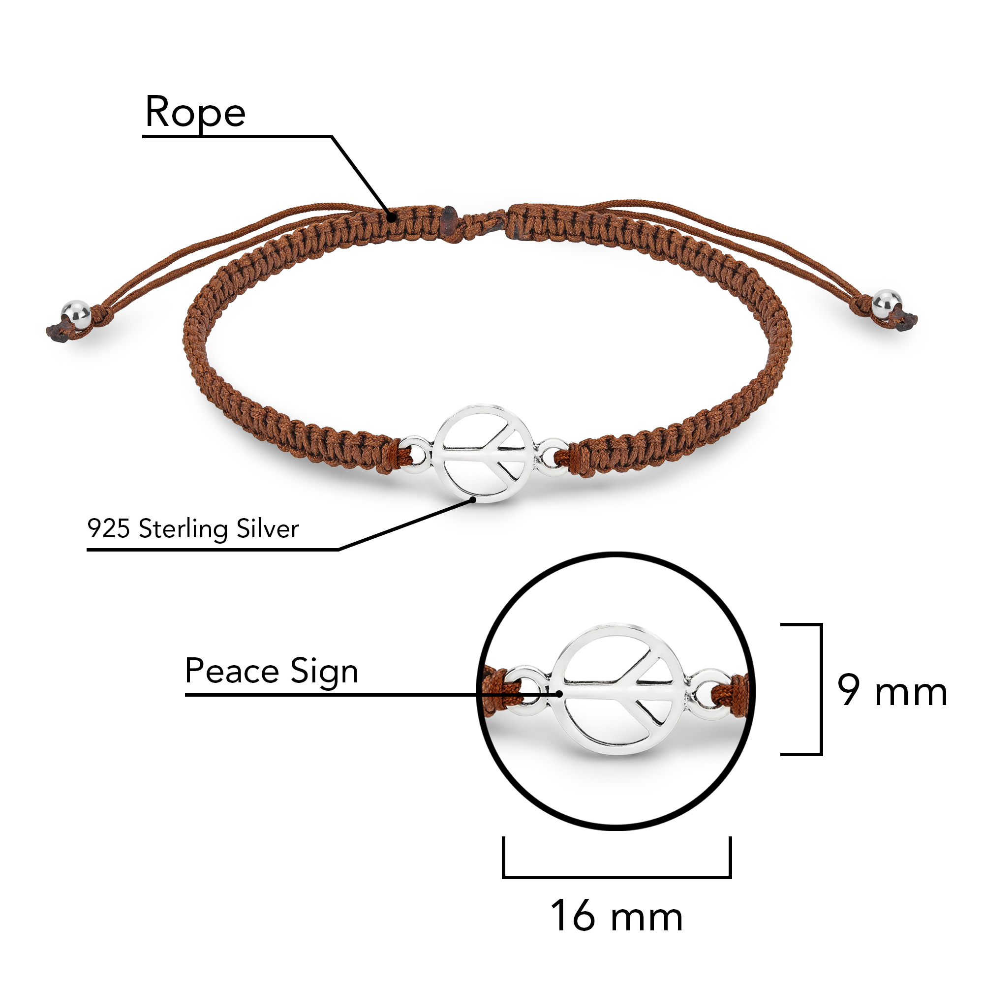 Discover serenity and style with our Minimalist Peace Sign Sterling Silver Charm Brown Rope Adjustable Bracelet. This exquisite piece effortlessly combines the timeless symbol of peace with the elegance of sterling silver, creating a meaningful accessory that beautifully captures the essence of tranquility and unity. At the heart of this bracelet is a serene peace sign charm, meticulously crafted in sterling silver. The peace sign is a universal symbol of harmony and balance, making it a perfect choice for those who value inner peace and global unity. Embrace the symbolism of peace and harmony with this bracelet, and let it become a constant reminder of the importance of tranquility and unity in our lives. NOTE: Due to the handcrafted nature of this product, minor differences in design, sizing and weight will occur from piece to piece. The exact measurements may vary slightly. Pictures may not be true to scale, please check the dimensions for the actual size.