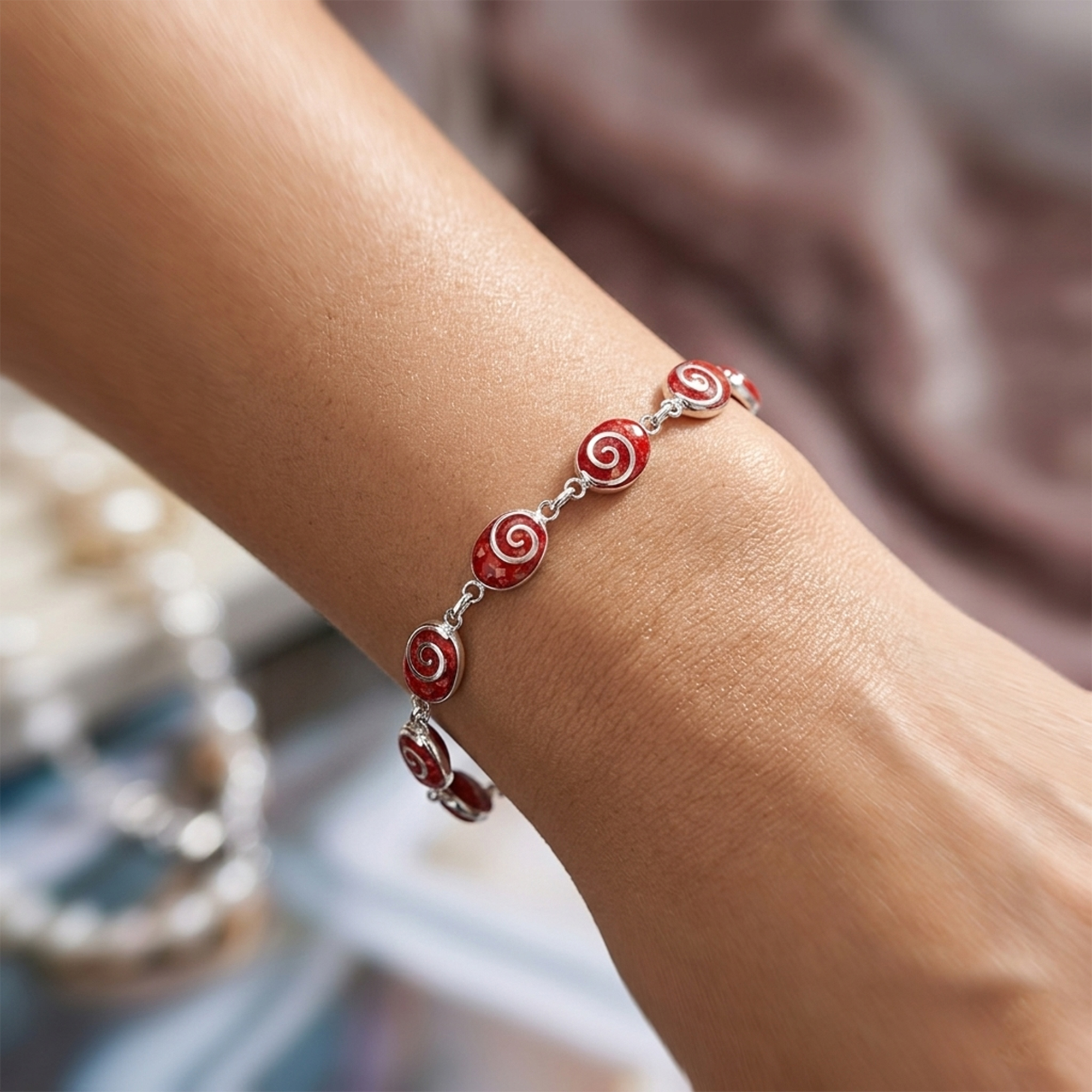 Alluring spirals laced over a round stone disc in this bracelet by artisan Yuu. The dashing bracelet is fashioned of genuine sterling silver metal. An astonishing and romantic bracelet to add to your stylish collection.