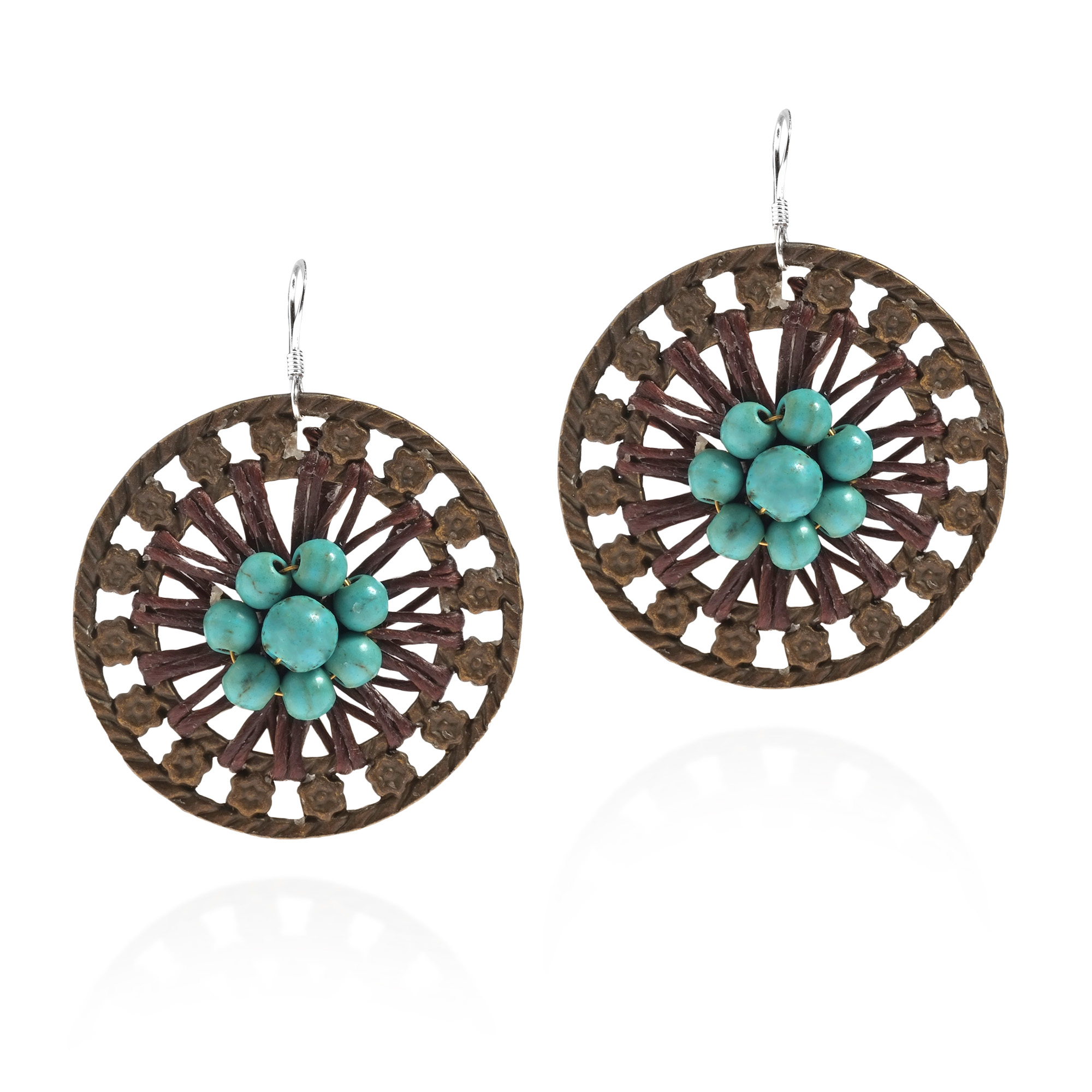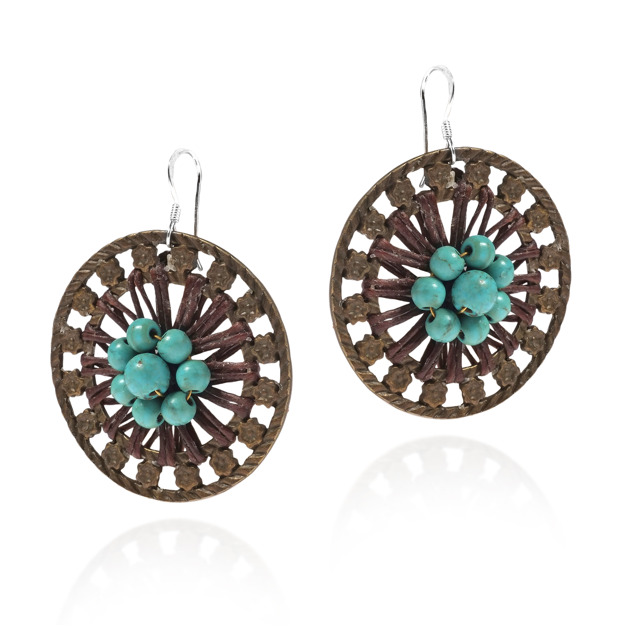 Antique Round Flower Brass Turquoise .925 Silver Earrings