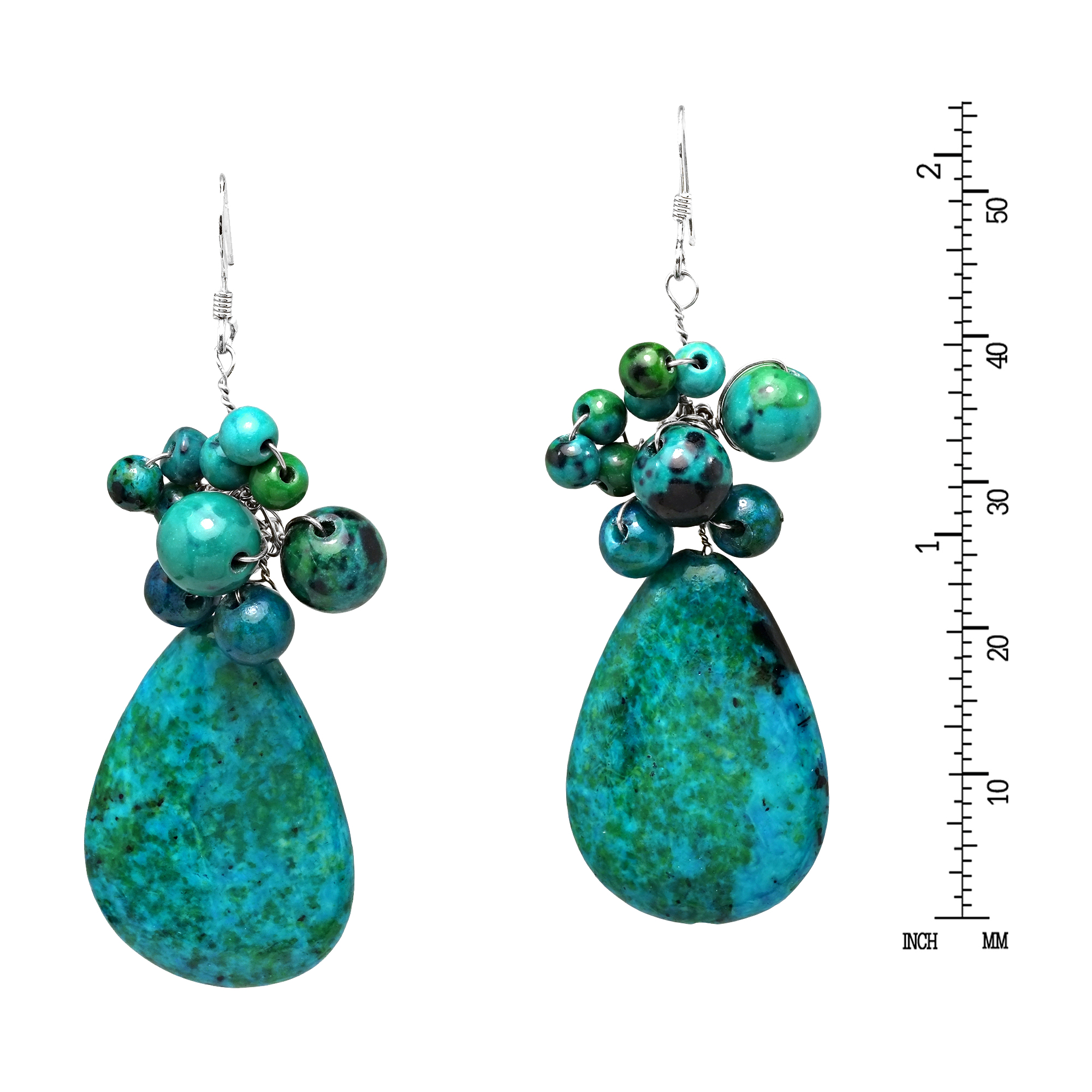 Make a beautiful fashion statement with these amazing handcrafted earrings form Thai artisan Lai. For this design, reconstructed malachite stones are clustered together to form the top half of these earrings. A teardrop shaped stone dangles below, adding drama with style to the overall design. The polished stones contain a beautiful mix of blue and green, which will add a vibrant splash of color to any outfit. These stunning dangle earrings swing from metal hooks and will look absolutely amazing with whatever you pair them with.