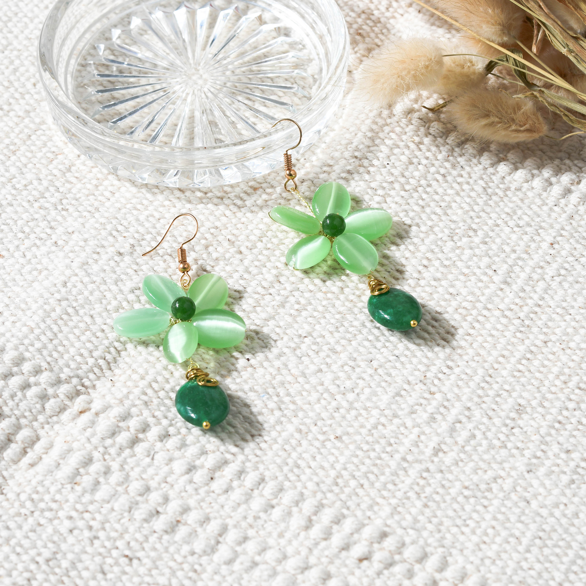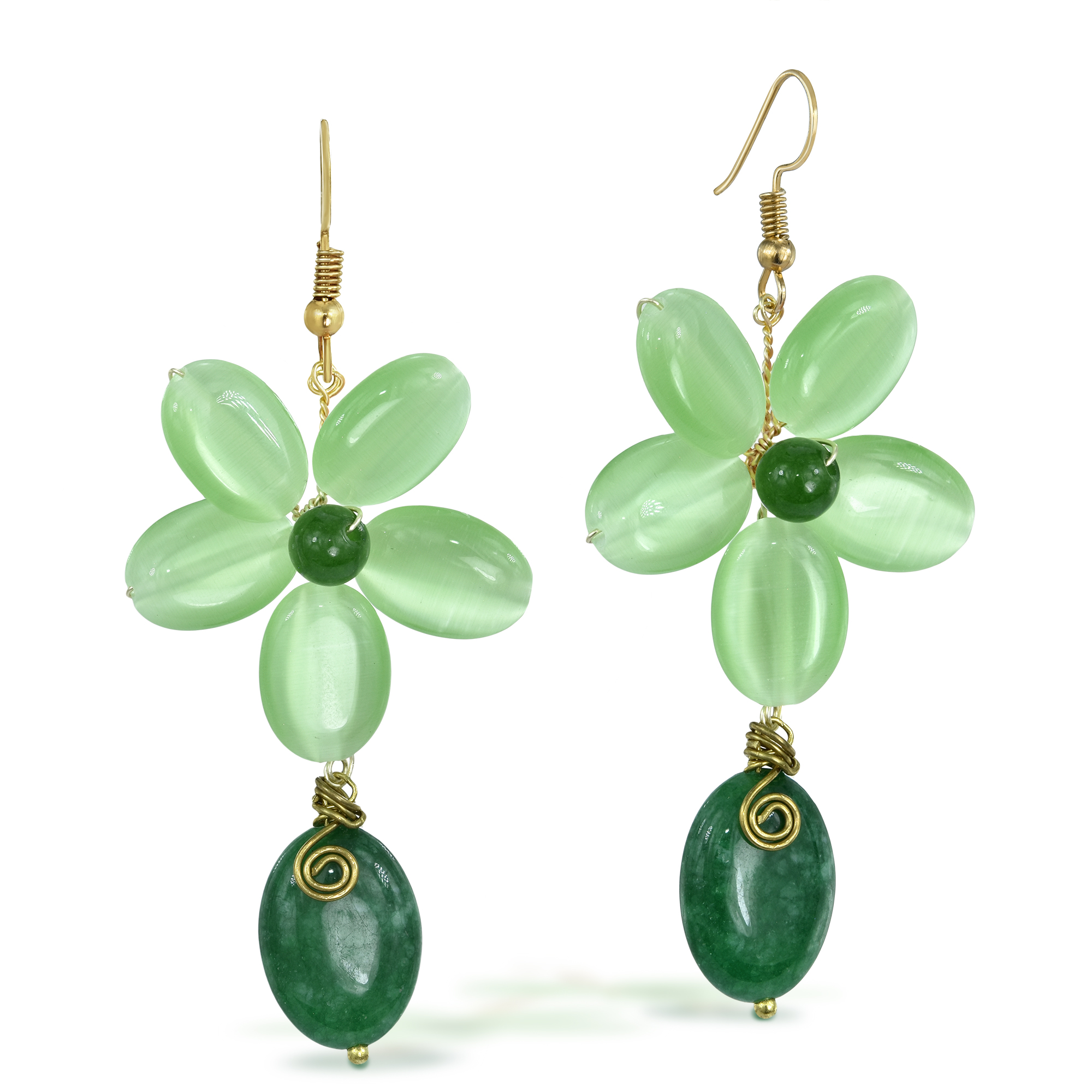 Romantic Green Quartz Floral Teardrop Brass Earrings
