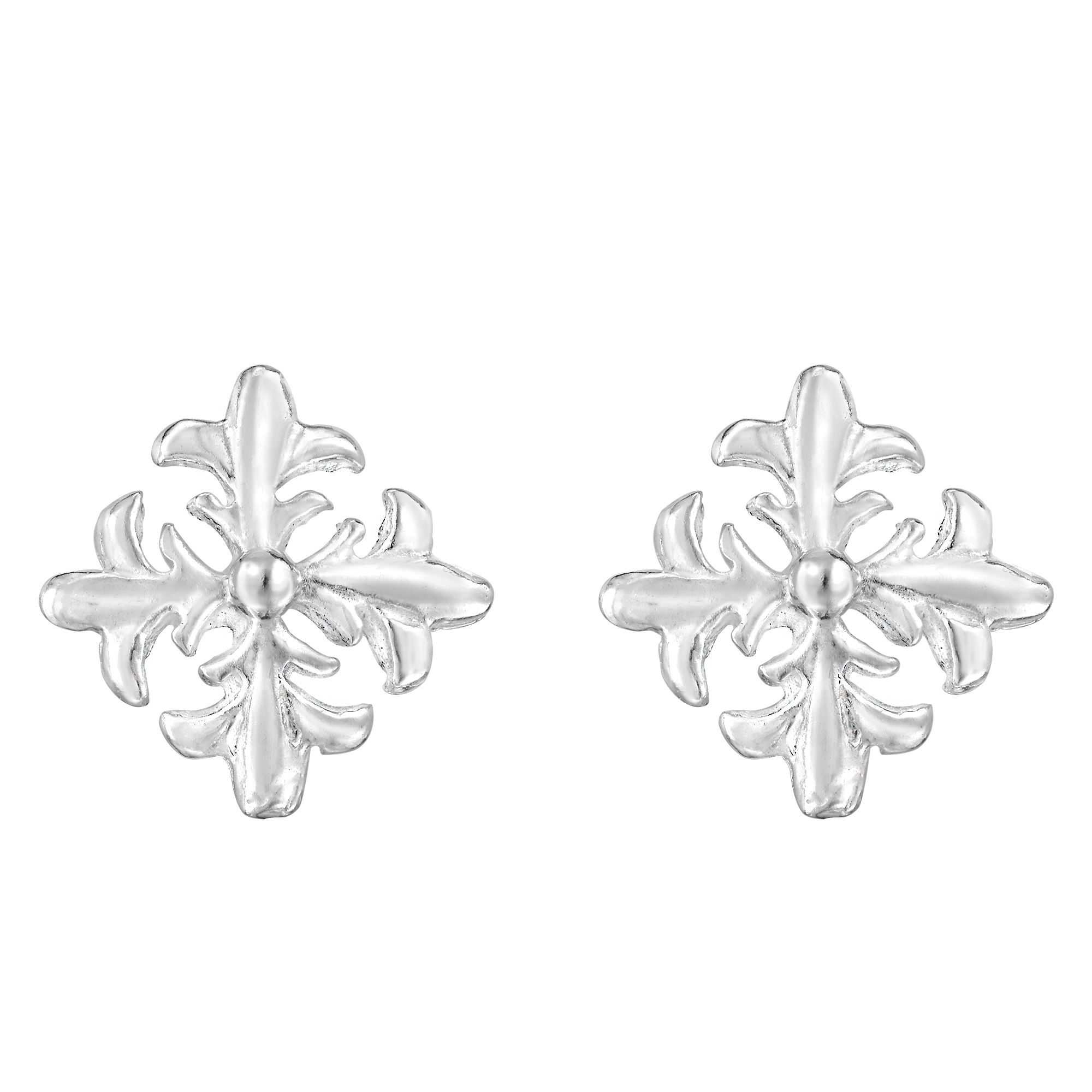 Add a versatile pair of earrings that feature an adorable four carved "Fleur de lis" charm stud terrific for everyday wear. Fleur de Lis is a French term meaning "Flower of the lily" signifying life and perfection. The significant charm is then depicted with a winter snowflake inspired pattern. The perfect fashion accessory for a casual day out, these charming studs will look amazing with whatever you pair them with.