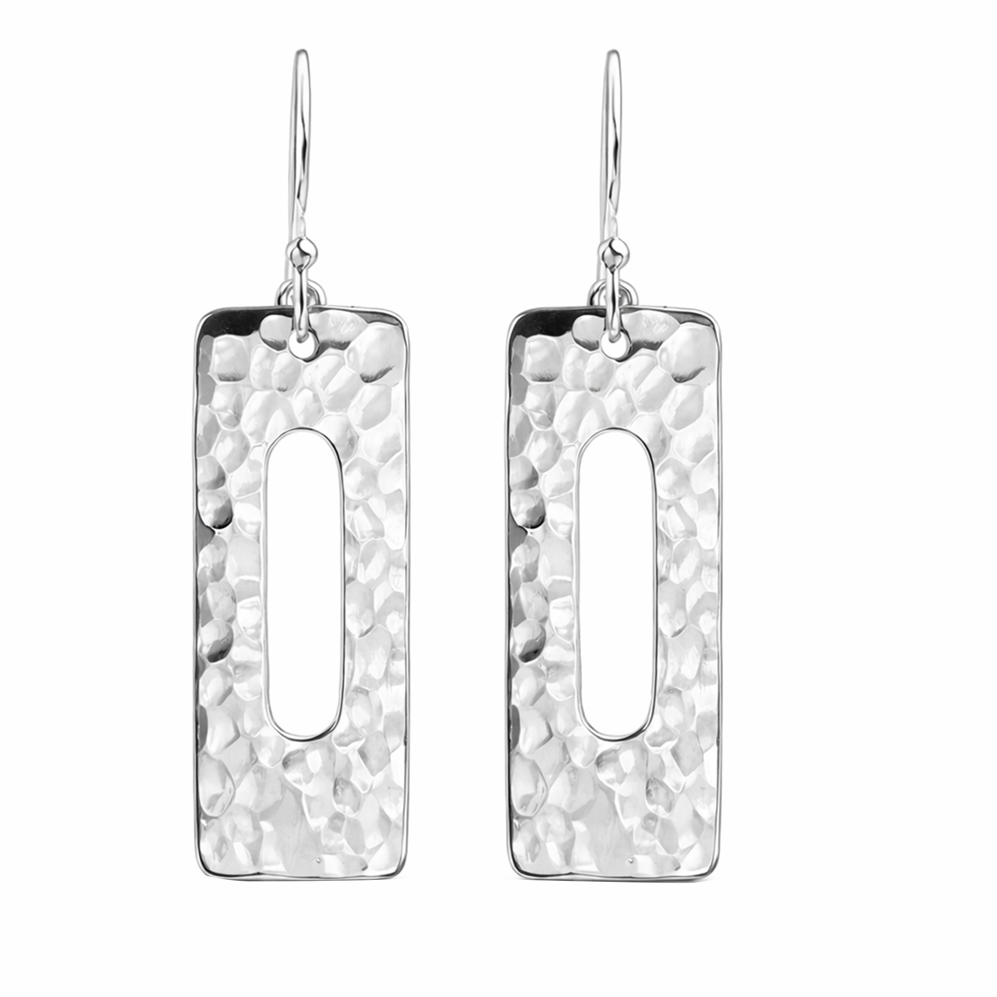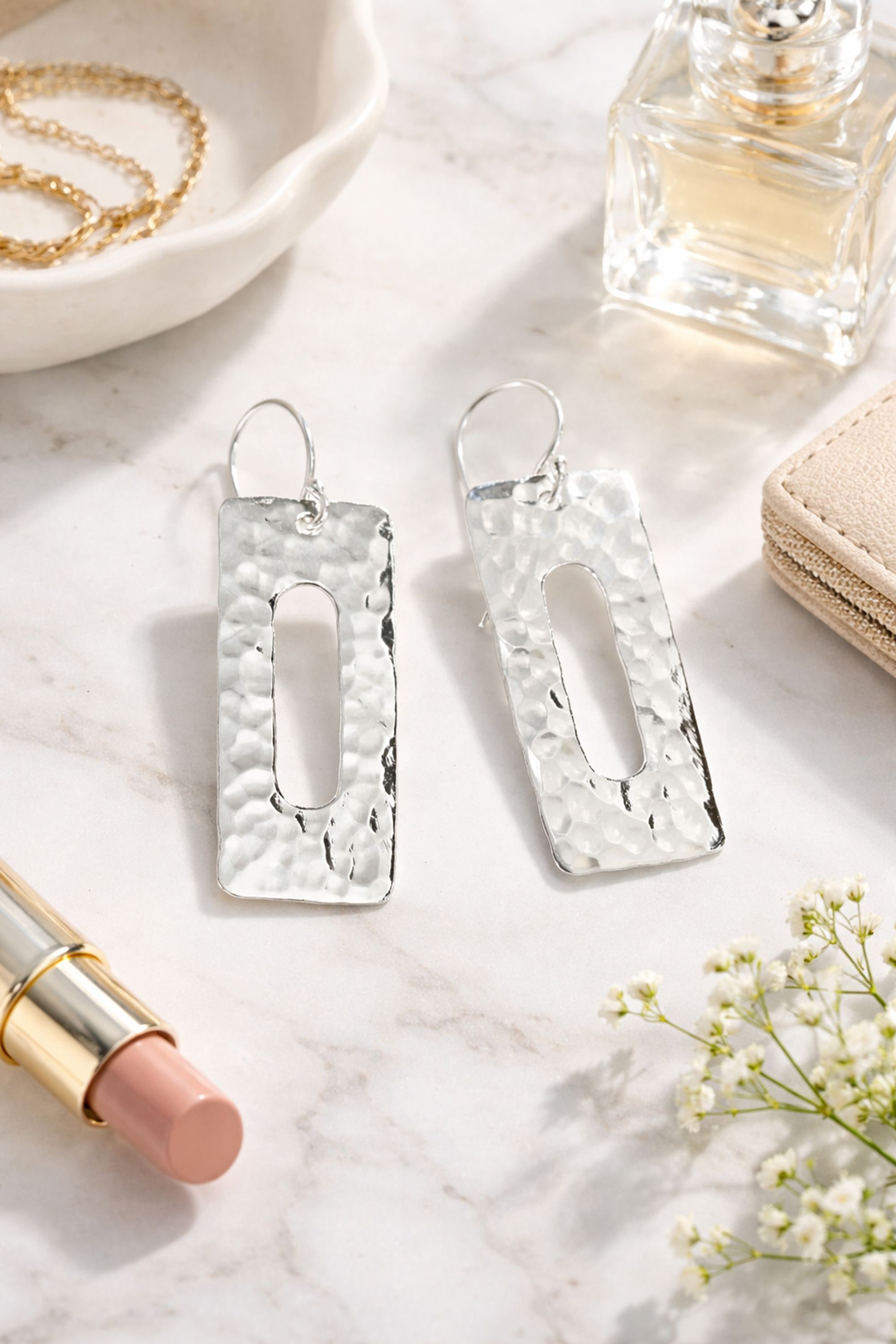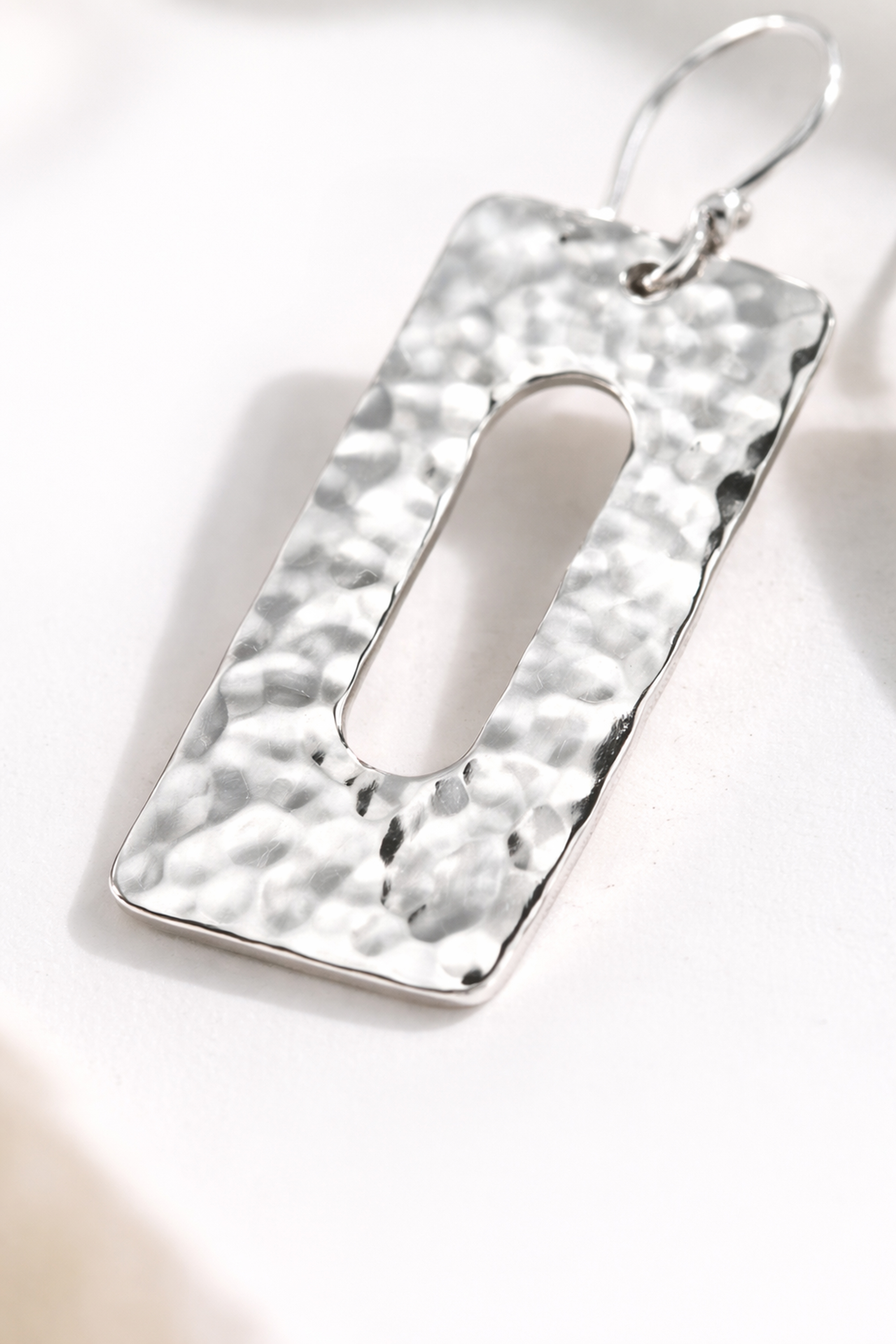 You will absolutely love wearing these stylish rectangle hollowed sterling silver earrings made by talented Thai artisan Khun Kung. A dimpled hammer texture is applied to add dimension and polished to a high reflective shine to catch the light from multiple angles. Full of movement and just the right amount of uniqueness, these are the perfect everyday style line-up.