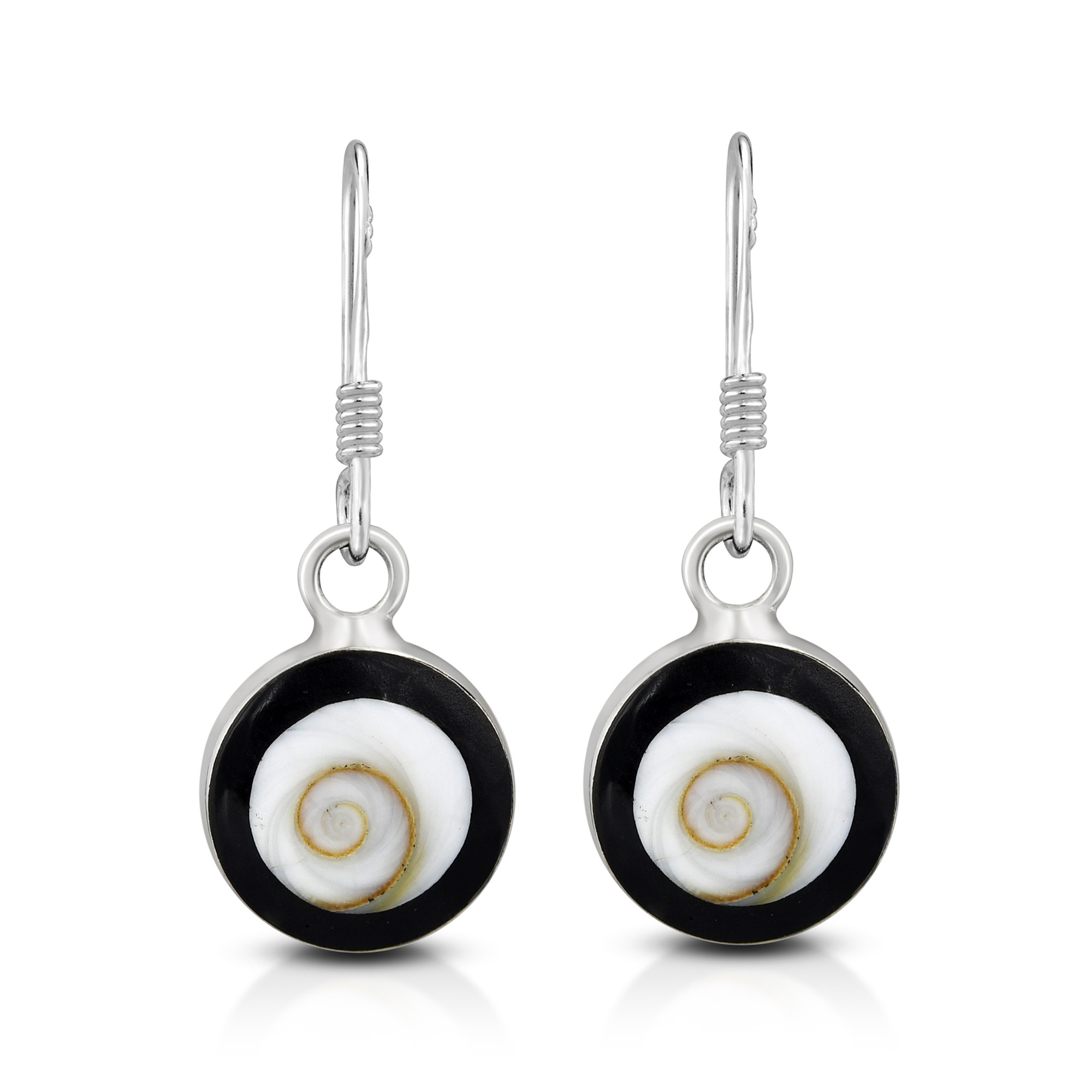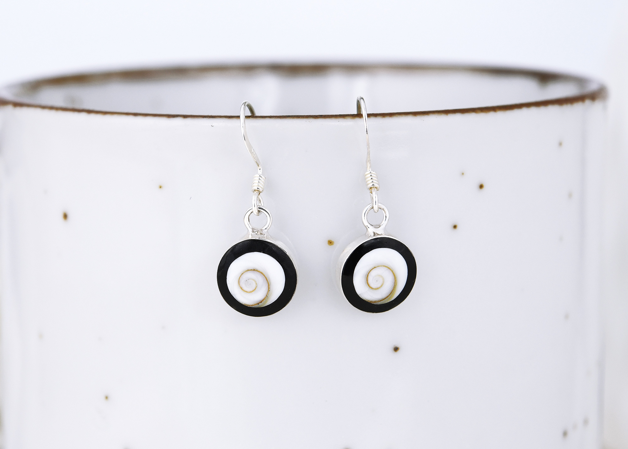 Accentuate any outfit and make a beautiful fashion statement with these amazing Shiva Shell earrings from Thailand. Shiva Shells are white seashells that form an elegant spiral, and in many cultures, are believed to open the Third Eye Chakra which transform and mute negative energy. It is said that the Third Eye of Shiva reflects negative energies and has a positive effect on an individual’s natural well-being. This has inspired Thai artisan Yuu to create these unique dangle earrings featuring round Shiva Shells that are surrounded by a black frame. All set on sterling silver discs that swing from sterling silver hooks, these handmade earrings are sure to look amazing on you.