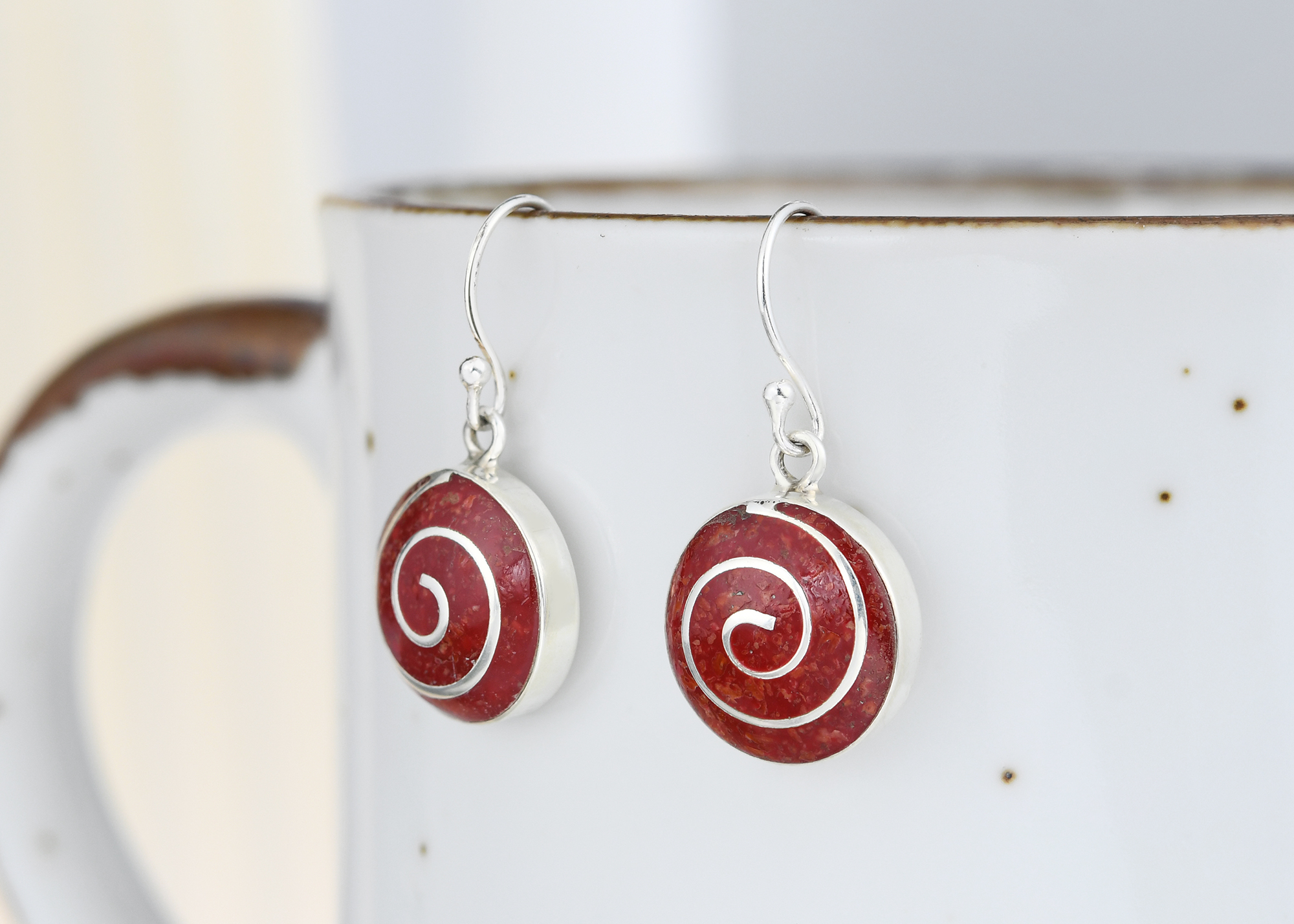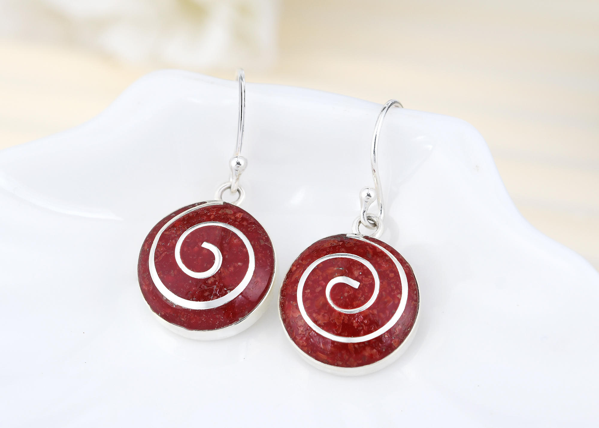 Elegant pieces of round depicted Shiva Shell mixed with sterling silver makes for a beautiful pair of dangle earrings. Shiva Shells form an elegant spiral, and in many cultures, are believed to open the Third Eye Chakra which transform and mute negative energy. It is said that the Third Eye of Shiva reflects negative energies and has a positive effect on an individual’s natural well-being. This has inspired Thai artisan Watsud to handcraft these earrings featuring round pieces of natural red coral set on discs of sterling silver. These unique dangle earrings swing from sterling silver hooks and are sure to look amazing with whatever you are wearing.