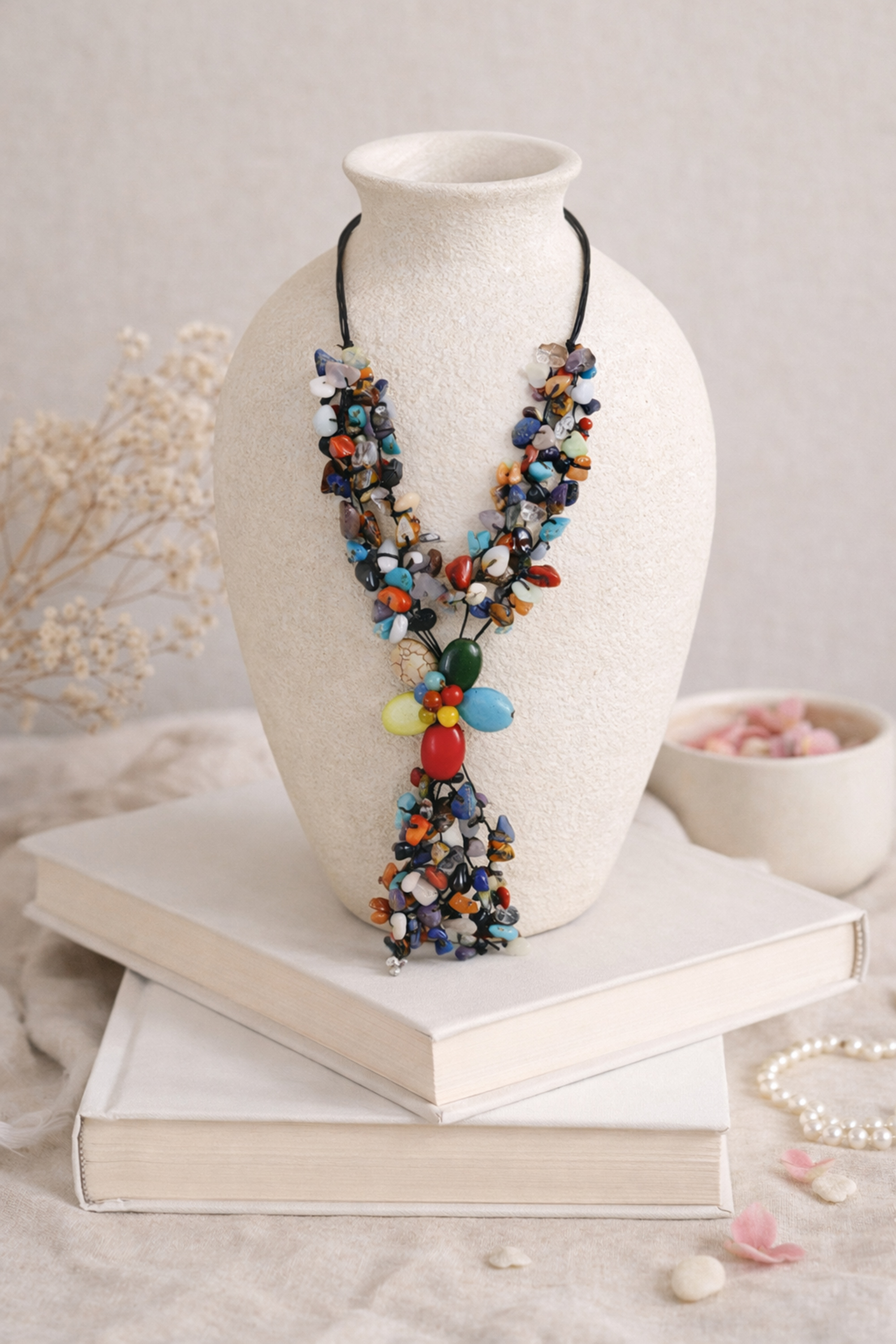 This gorgeous necklace, made of natural gemstones in a floral design, can add character to your outfit. This necklace was handmade in Thailand by artisan, Tor.