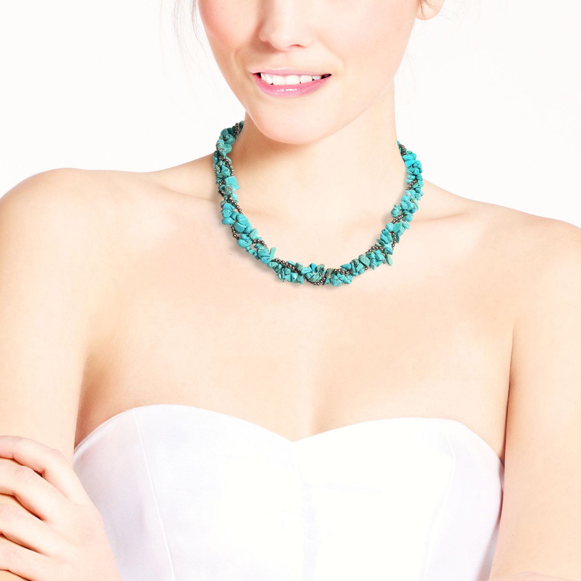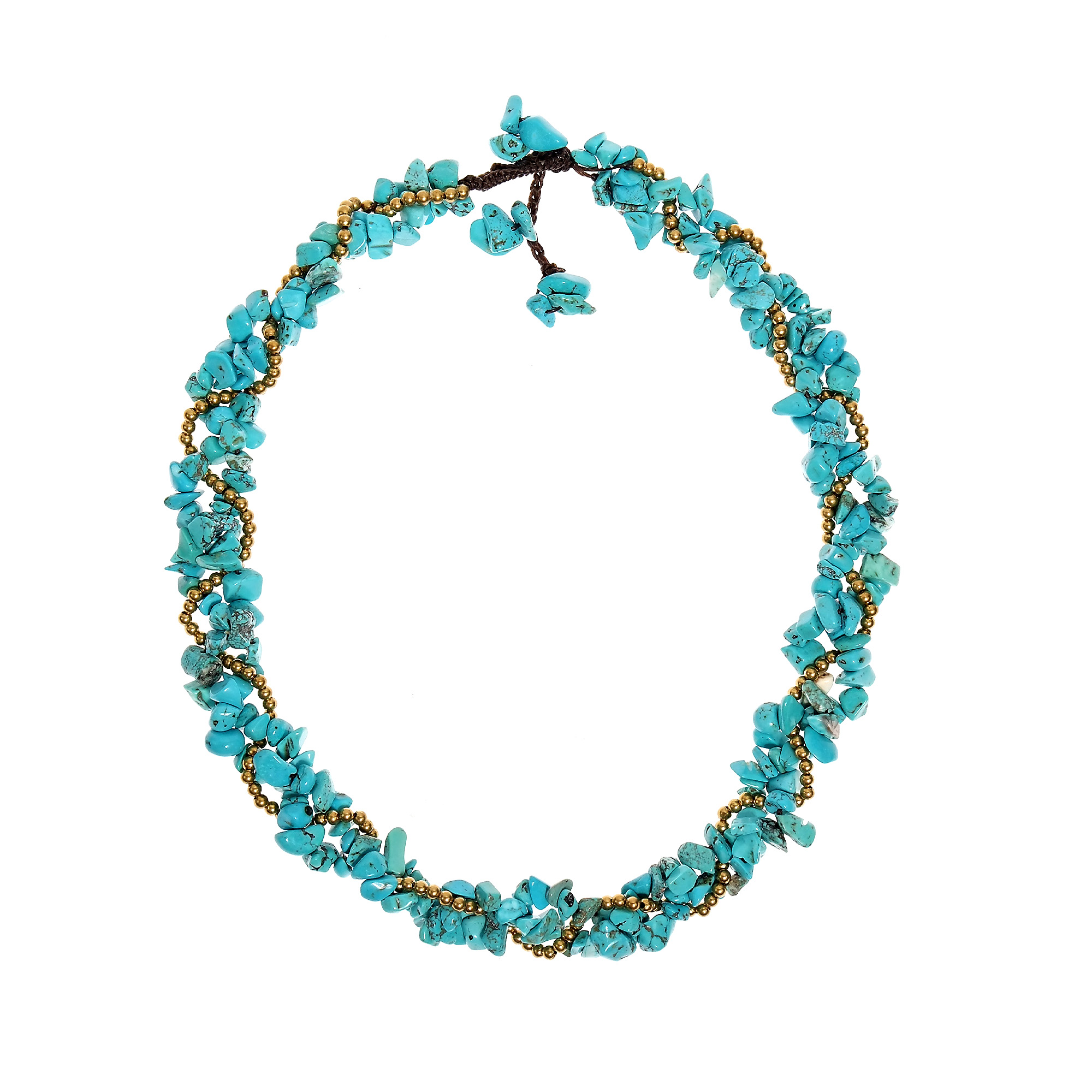 Handcrafted in Thailand by artisan, Jeab, this stylish necklace features a twist design accentuated with reconstructed turquoise gemstones on a cotton rope strand.