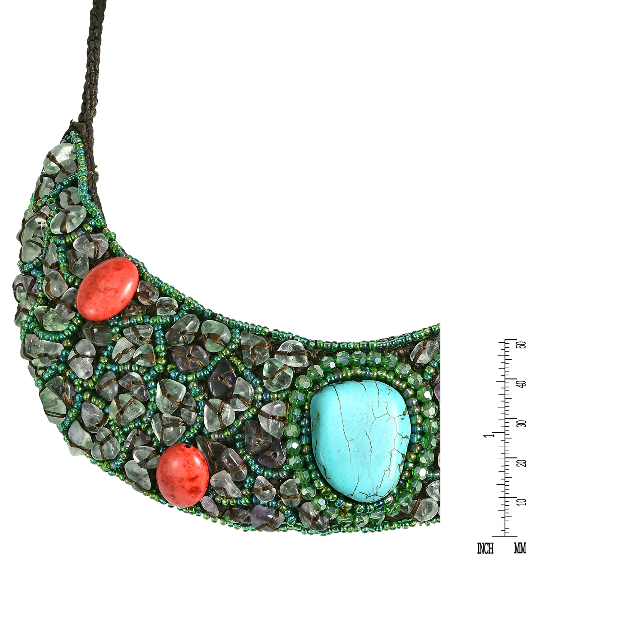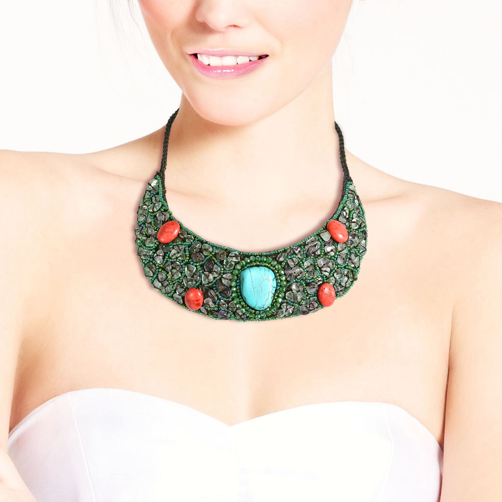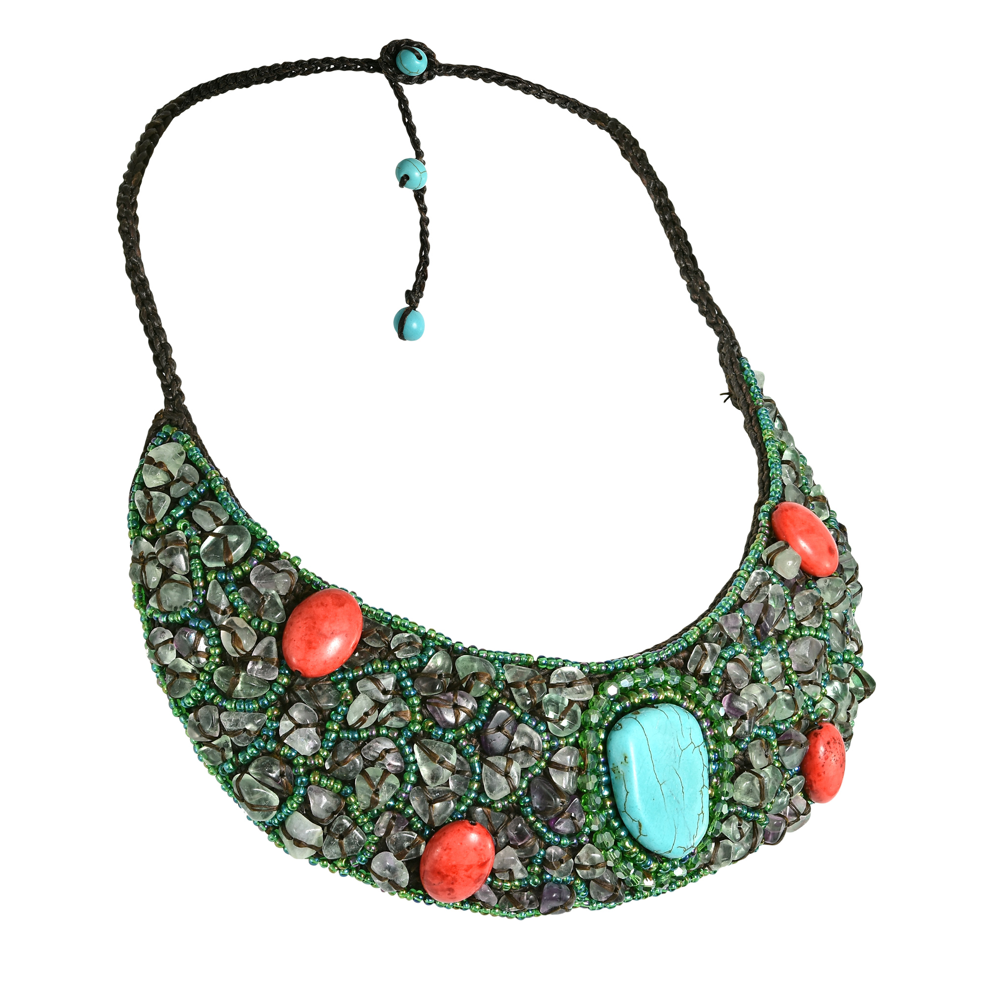 A mesmerizing ensemble of natural materials merge into this gorgeous multicolored bib necklace. A beautiful centerpiece of stone is accented with coral or shell (depending on style) and is then surrounded by amazing beadwork and stone. This particular piece comes in a variety of colors and materials for you to choose from. The necklace measures 17 inches in length with a 2-inch adjustable extension and finished off with a lobster claw clasp. This remarkable handmade necklace, from Thai designer Din, is an elegant yet sophisticated piece that is perfect for any occasion.