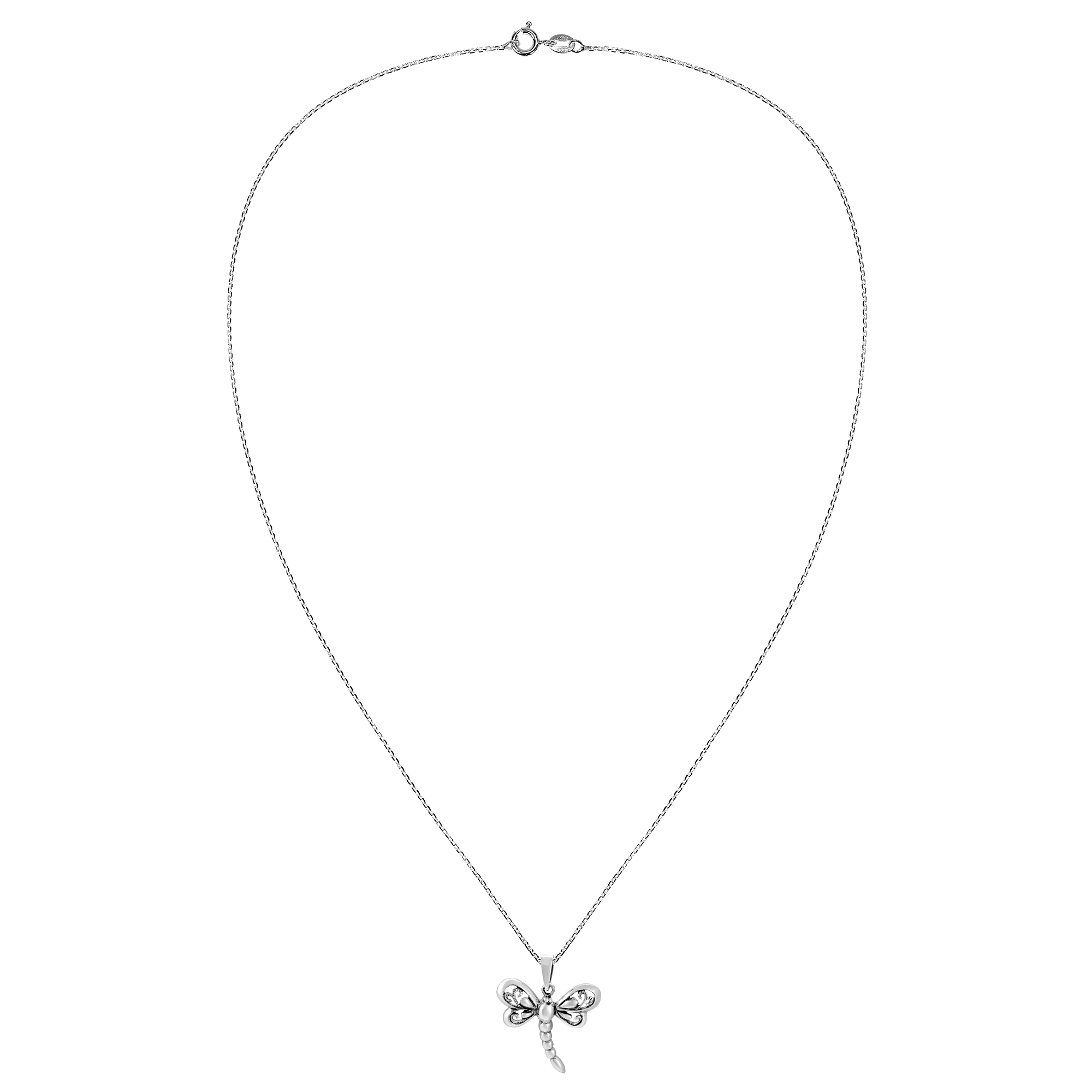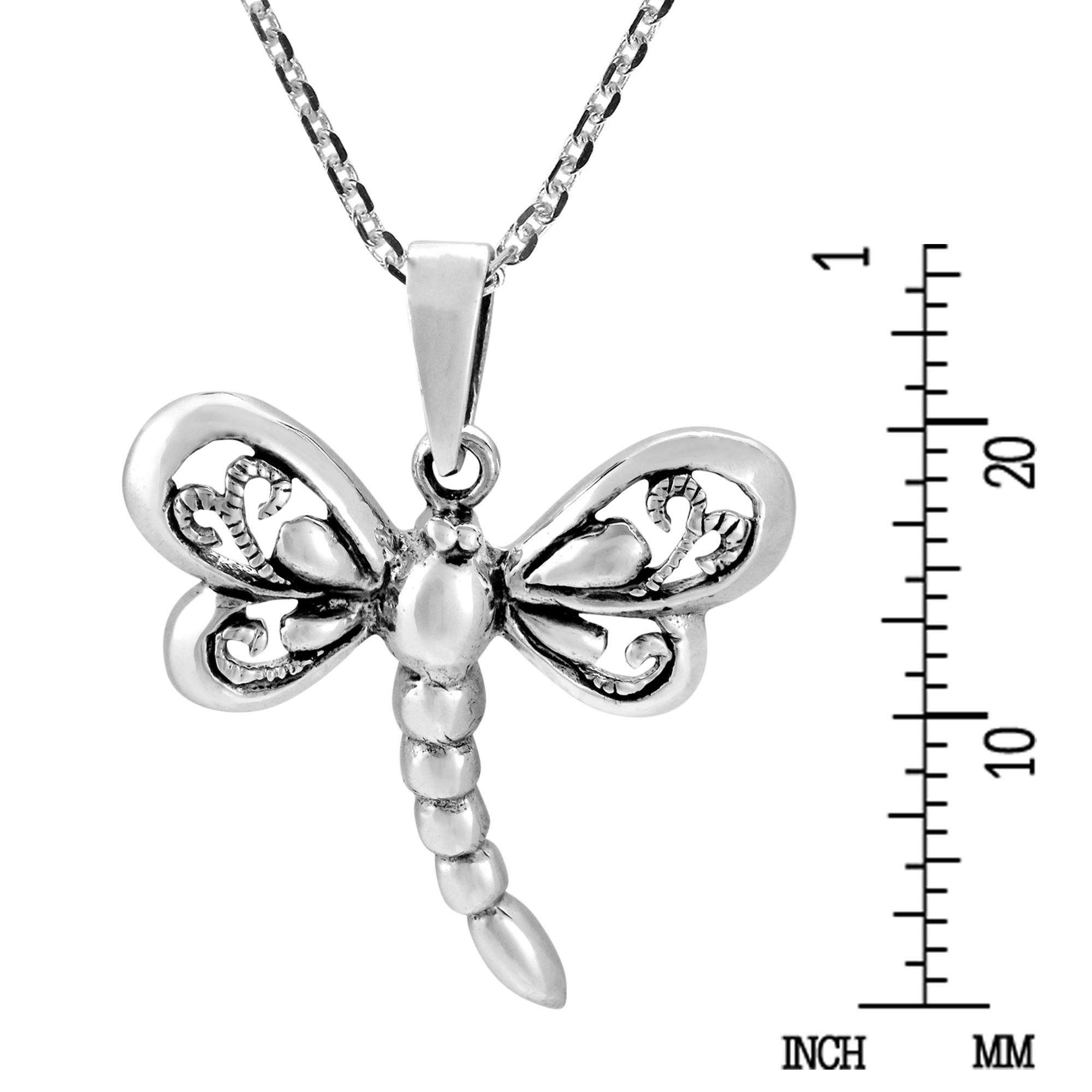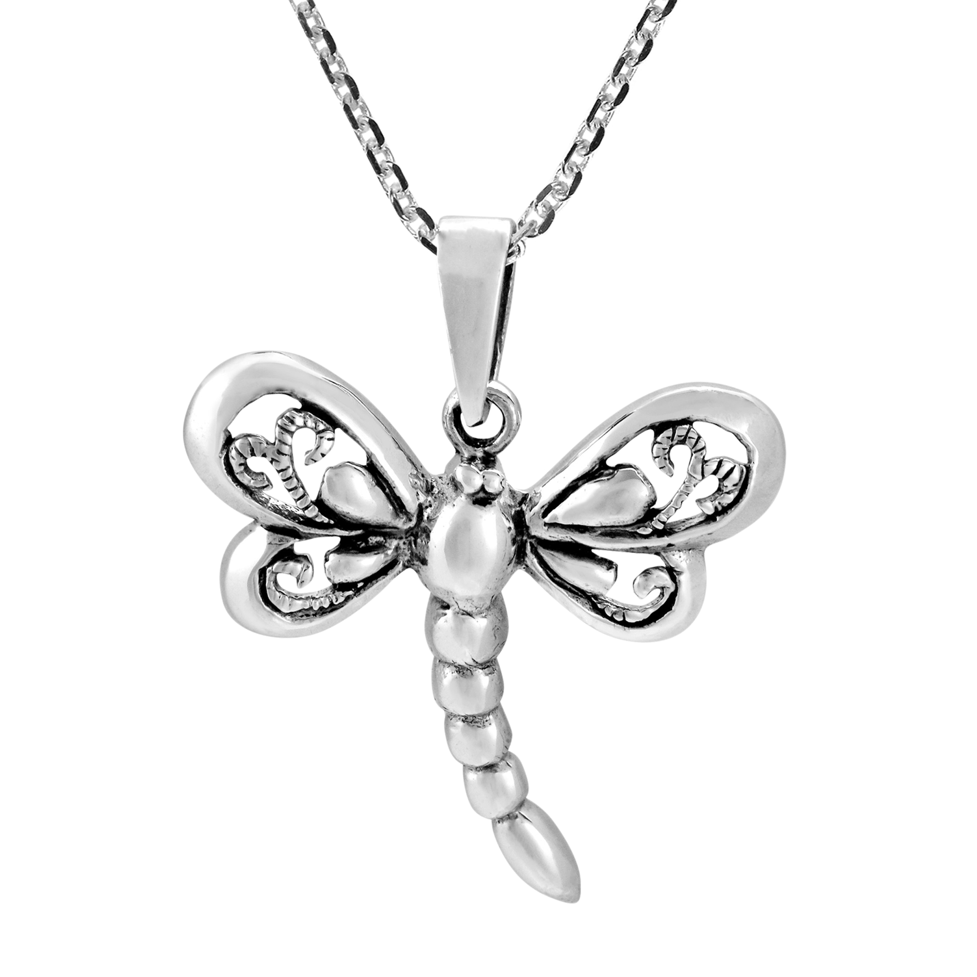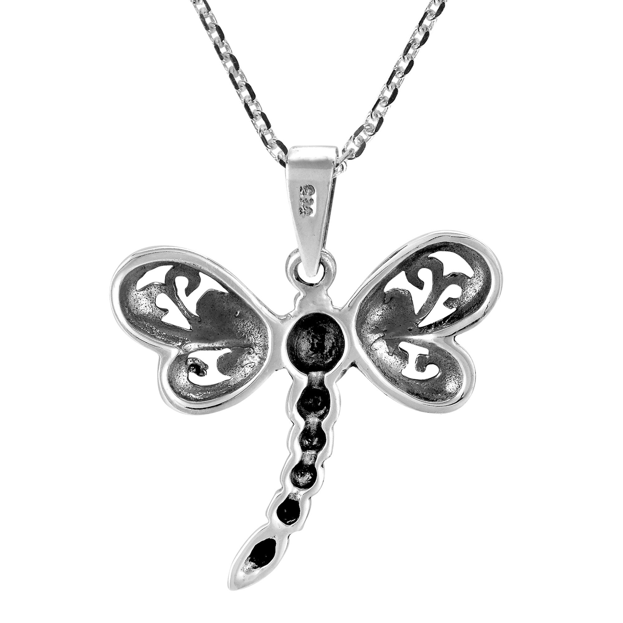 Fluttering its filigree wings, a dragonfly fashions the design of this piece which be crafted with sterling silver. Crafted by artisan Kung, the pendant hangs from an 18 inches chain that fastens with a spring ring clasp. This necklace is a great accent your outfit.