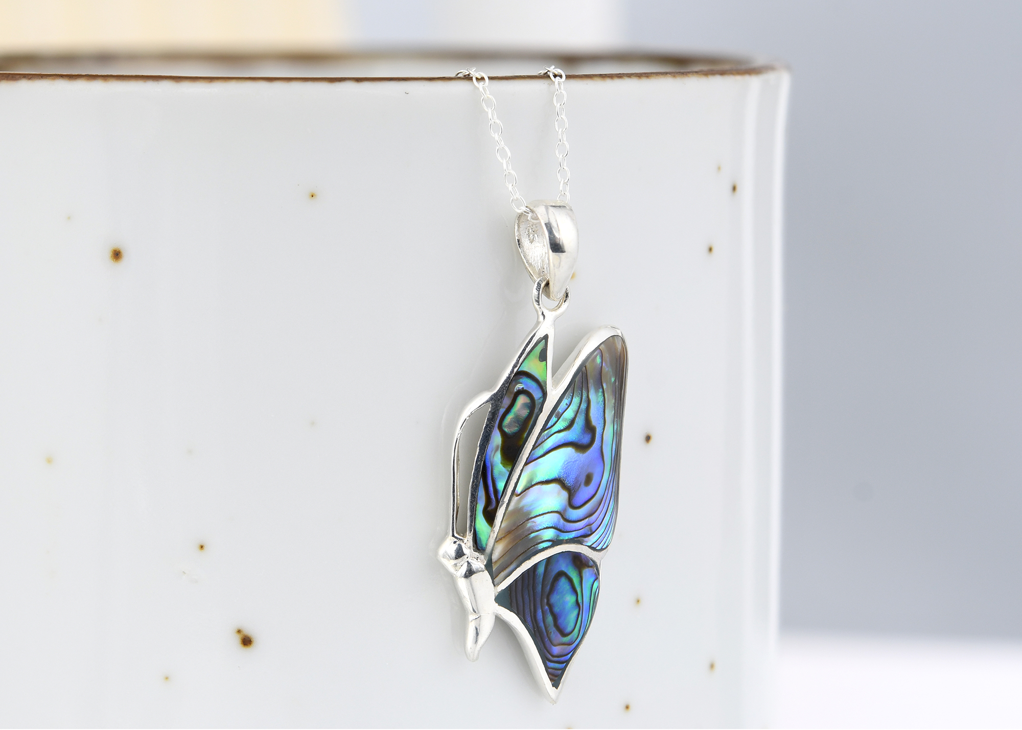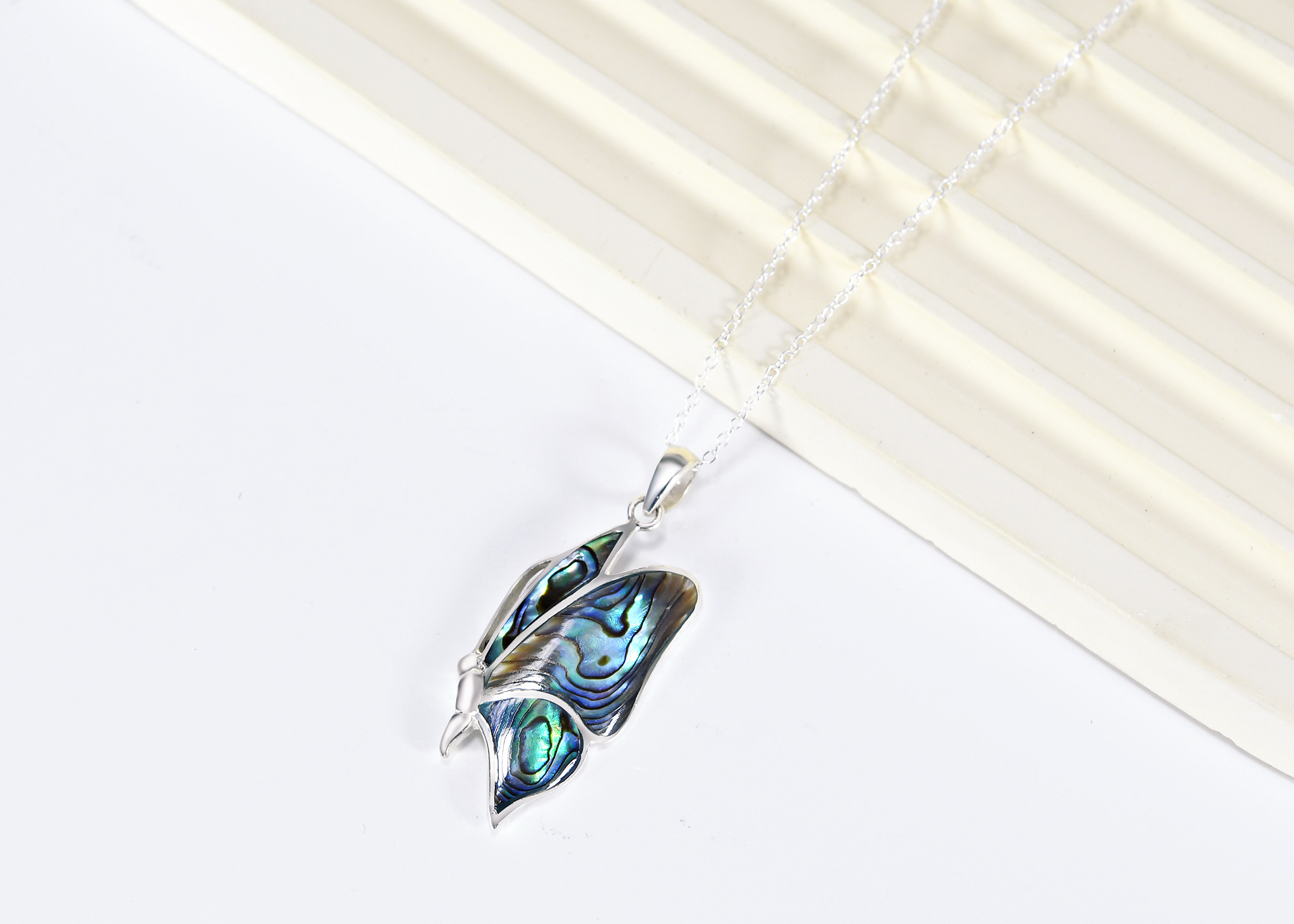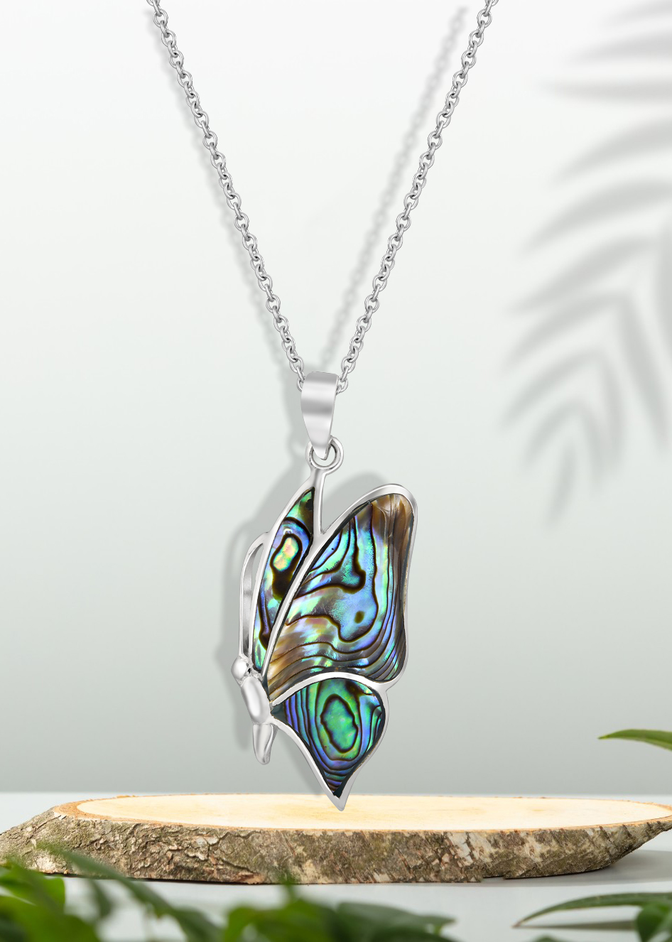 Depicted in all its glory, a sterling silver butterfly pendant featuring natural stone inlays alights on a silver cable chain. Thailand's artisan Goong crafts these pieces by hand and specializes in designing pieces incorporating natural stone materials and sterling silver .925. The natural wildlife style is ideal for women of all ages and is the perfect accessory for casual and outdoor attire.