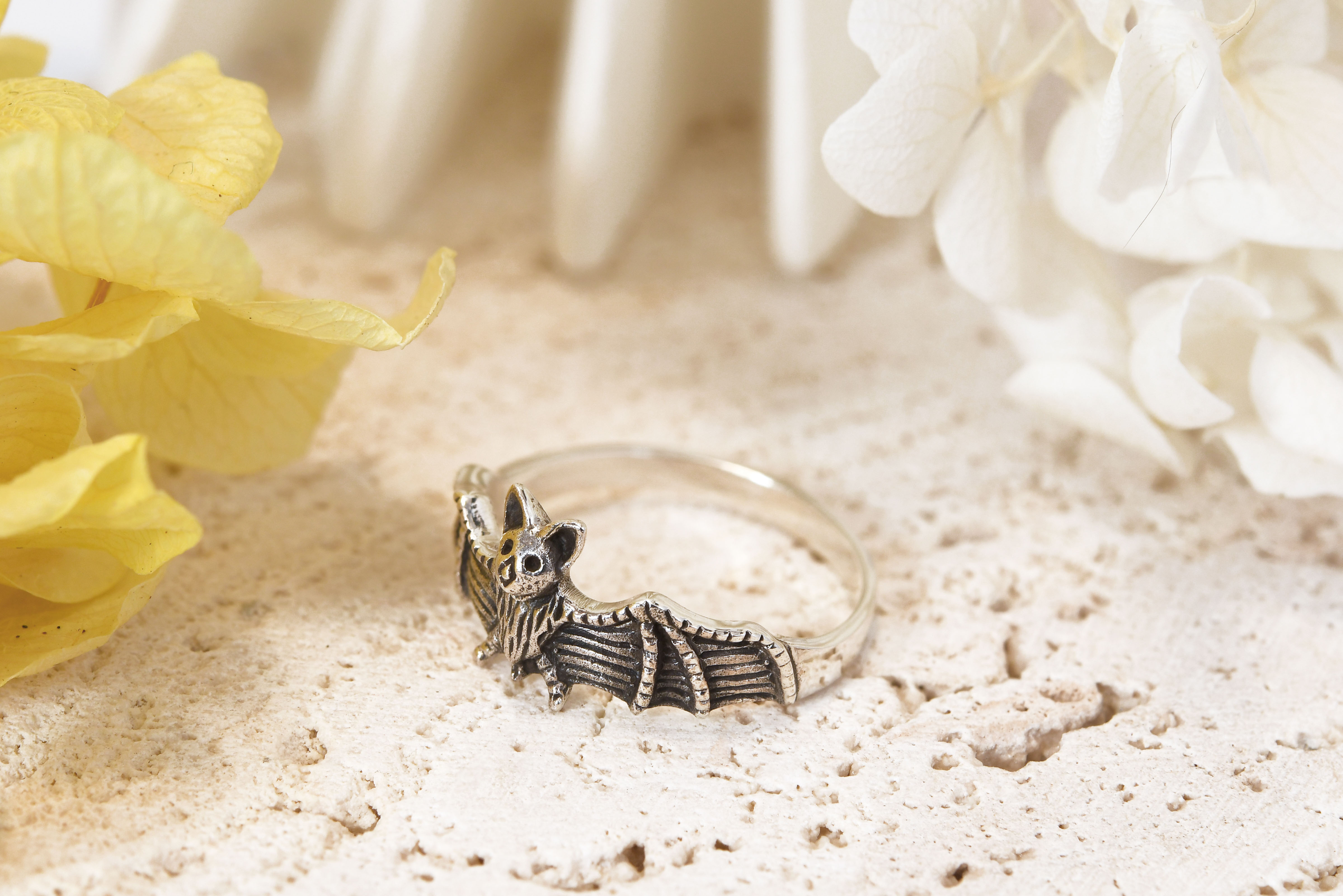 For this piece, sterling silver is expertly transformed into a nocturnal bat inspired ring by Thai artisan Pikun. Intricately detailed, this stylish bat ring will add a truly spooky vibe to your style. Dark and shiny sterling silver finishes help bring out the fine details of this ring, while showcasing the artisan’s skill with metalworking. Symbolic of the night and all things Halloween, this ring will look great with whatever you decide to pair with it. The perfect accent piece for any Halloween costume.