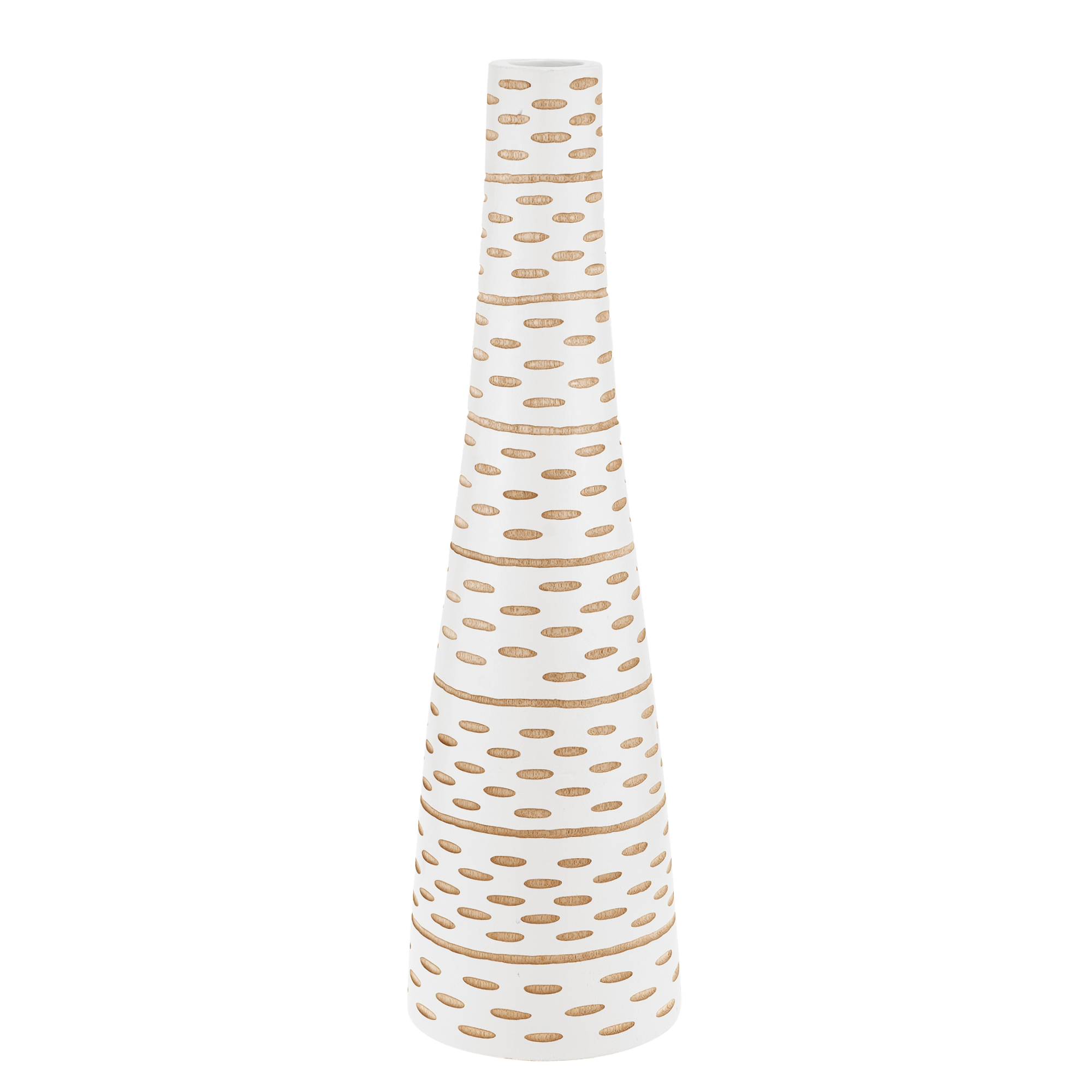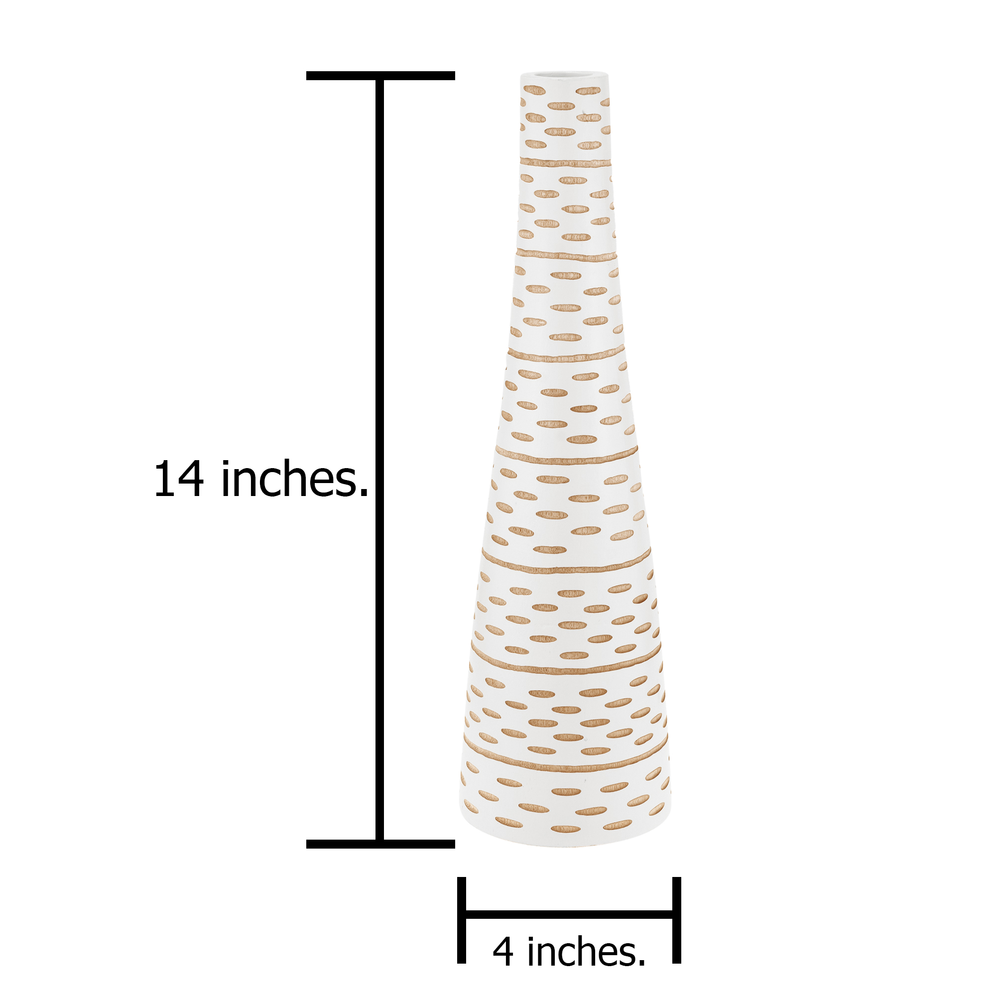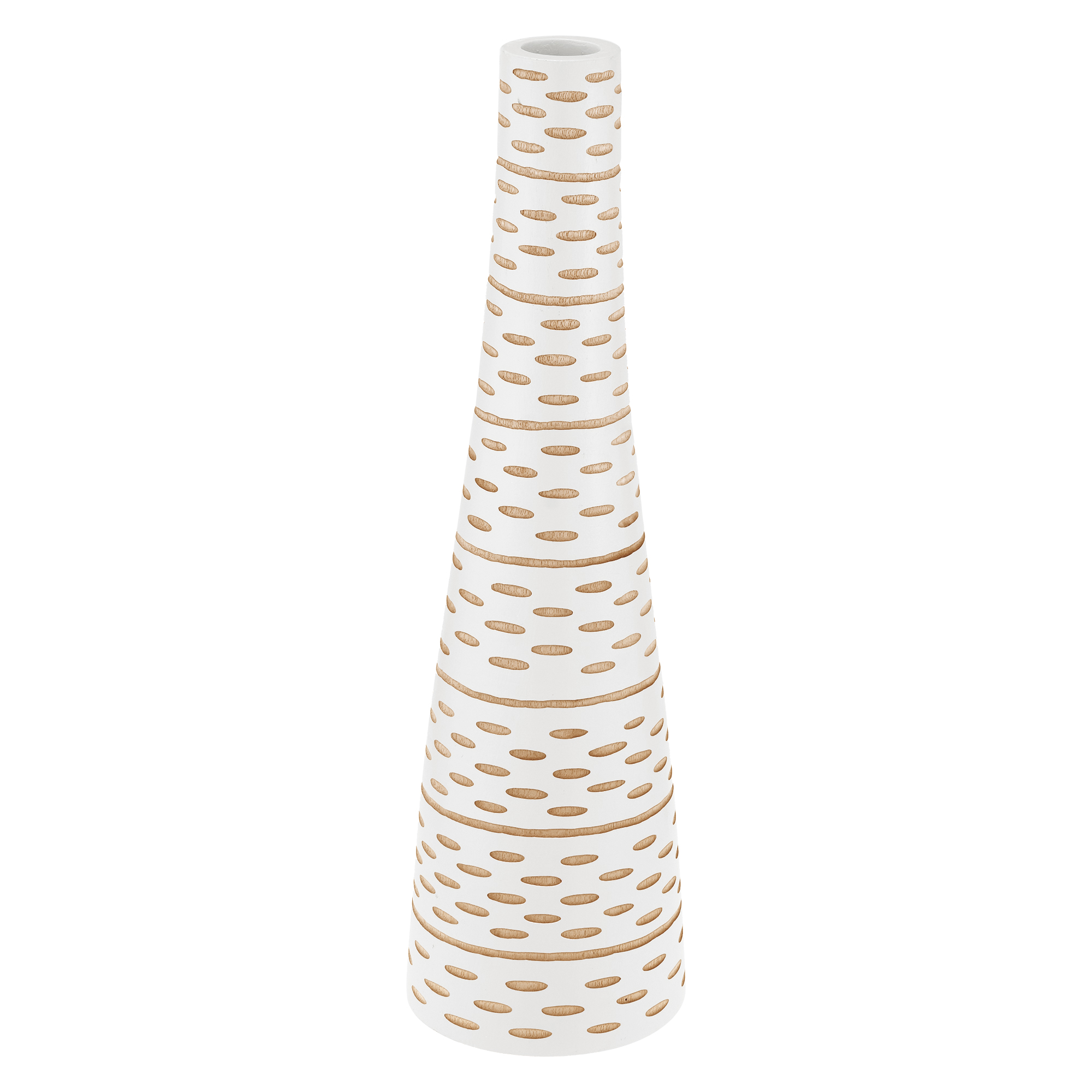 An absolute eye-catching home decorative vase is all you need. Working in Mango wood, Thai artisan Saranya meticulously crafts this stunning wooden vase with mesmerizing sensuous abstract oval zebra textures decorated in brown streaks on a white stained vase. This bottle-shaped piece is produced from a single piece of Mango wood and measures in with a height of 14 inches. Bring an accent of originality and an art of nature to your interior design that will definitely enhance your plants and flower arrangements.