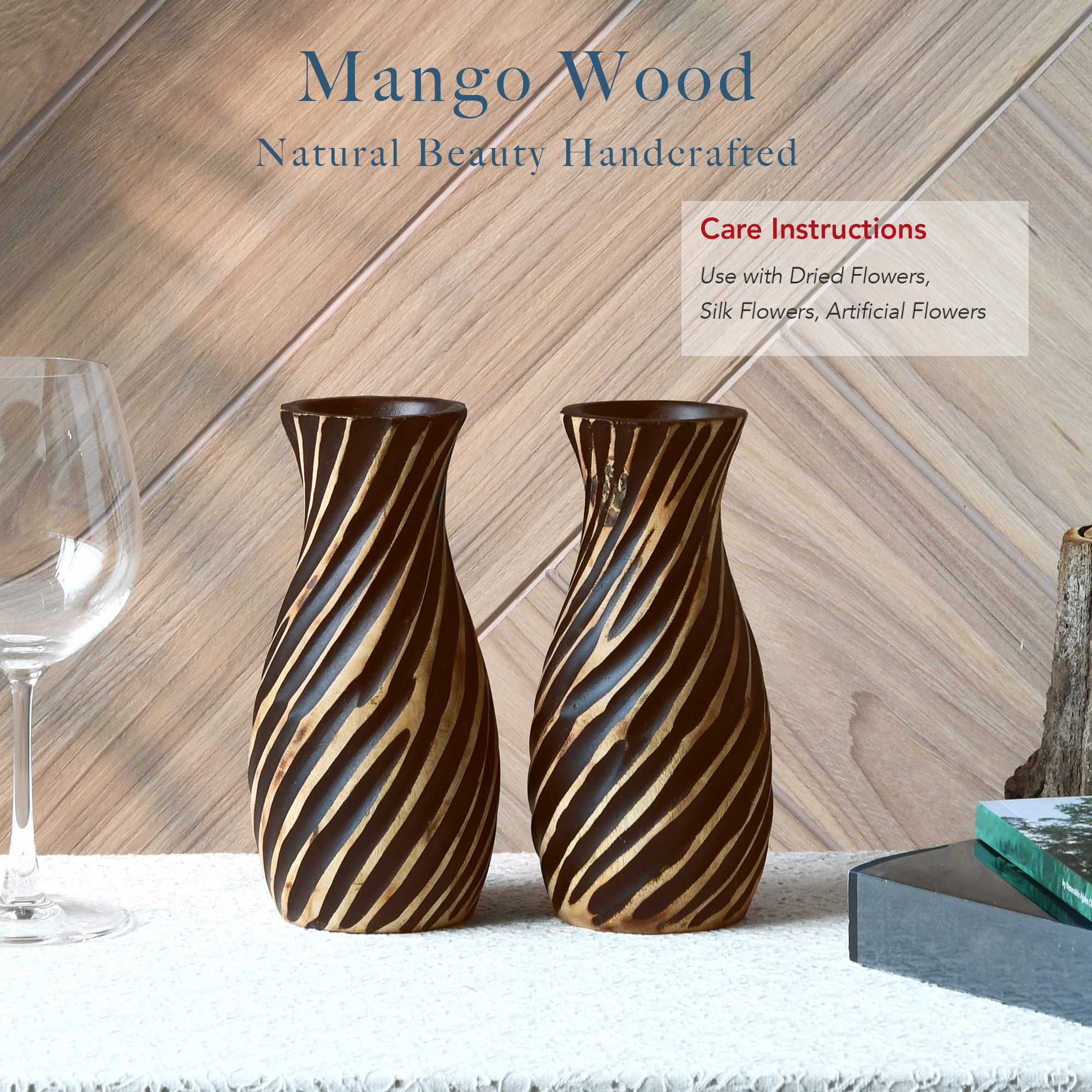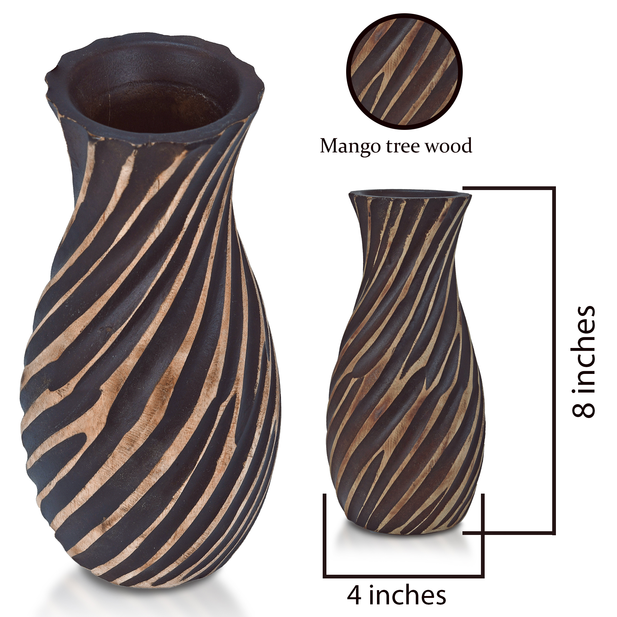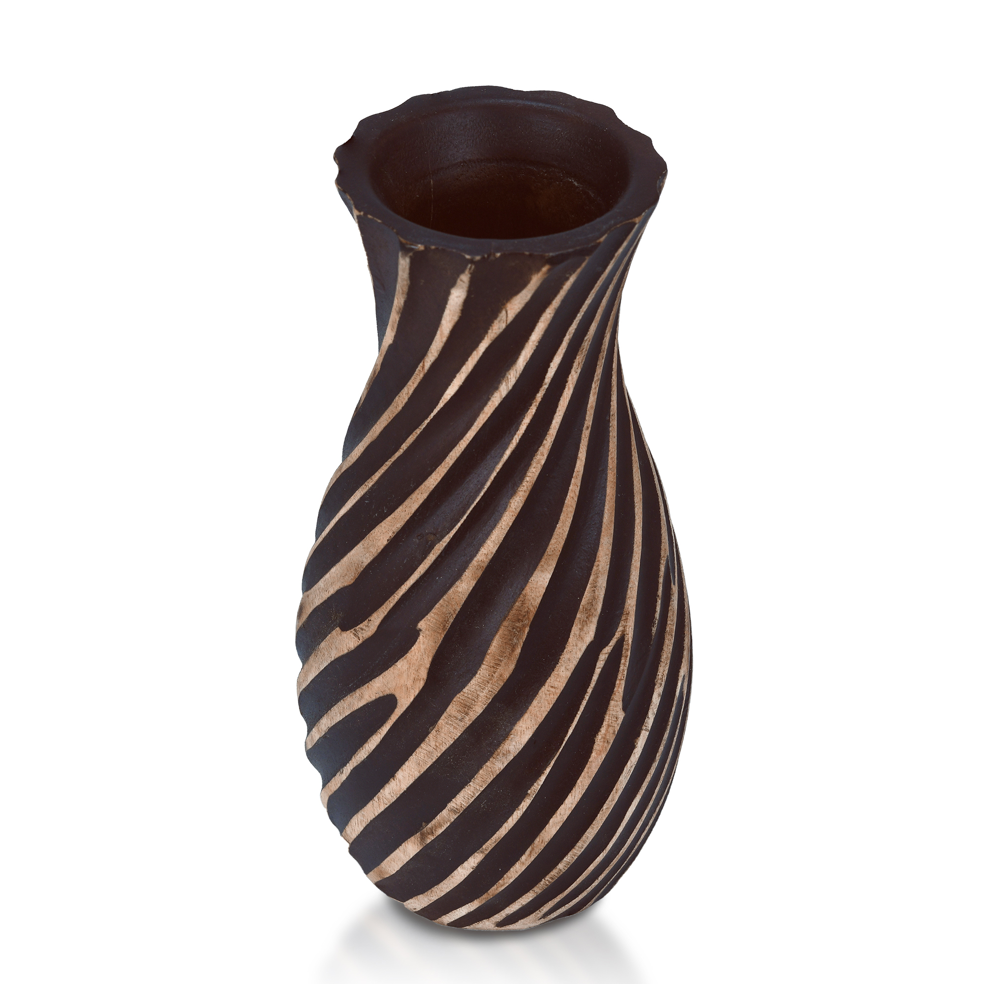 Bring a touch of nature indoors with this beautifully hand-carved spiral mango wood vase from AeraVida. Designed by skilled Thai artisans, this decorative vase showcases a unique stripe pattern created by alternating deep grooves and natural wood grain, offering both texture and visual interest. With its warm brown tones and rustic appeal, it makes a striking addition to any space, whether used as a standalone piece or paired with dried botanicals, faux florals, or pampas grass. NOTE: Due to the handcrafted nature of this product, differences in design, sizing, and weight will occur from piece to piece. The exact measurements may vary slightly. Pictures may not be true to scale; please check the dimensions for the actual size.
