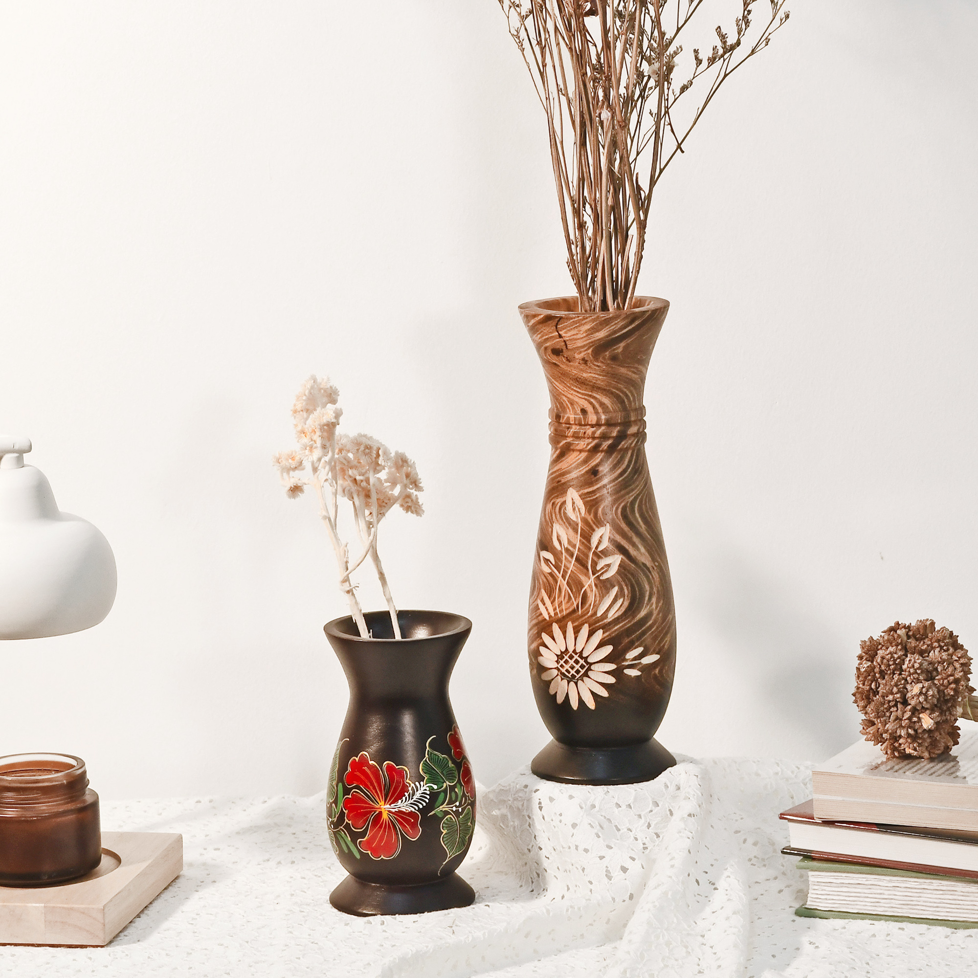 Beautifully Painted Hibiscus Flower Black Mango Tree 6-inch Wooden Bouquet Vase