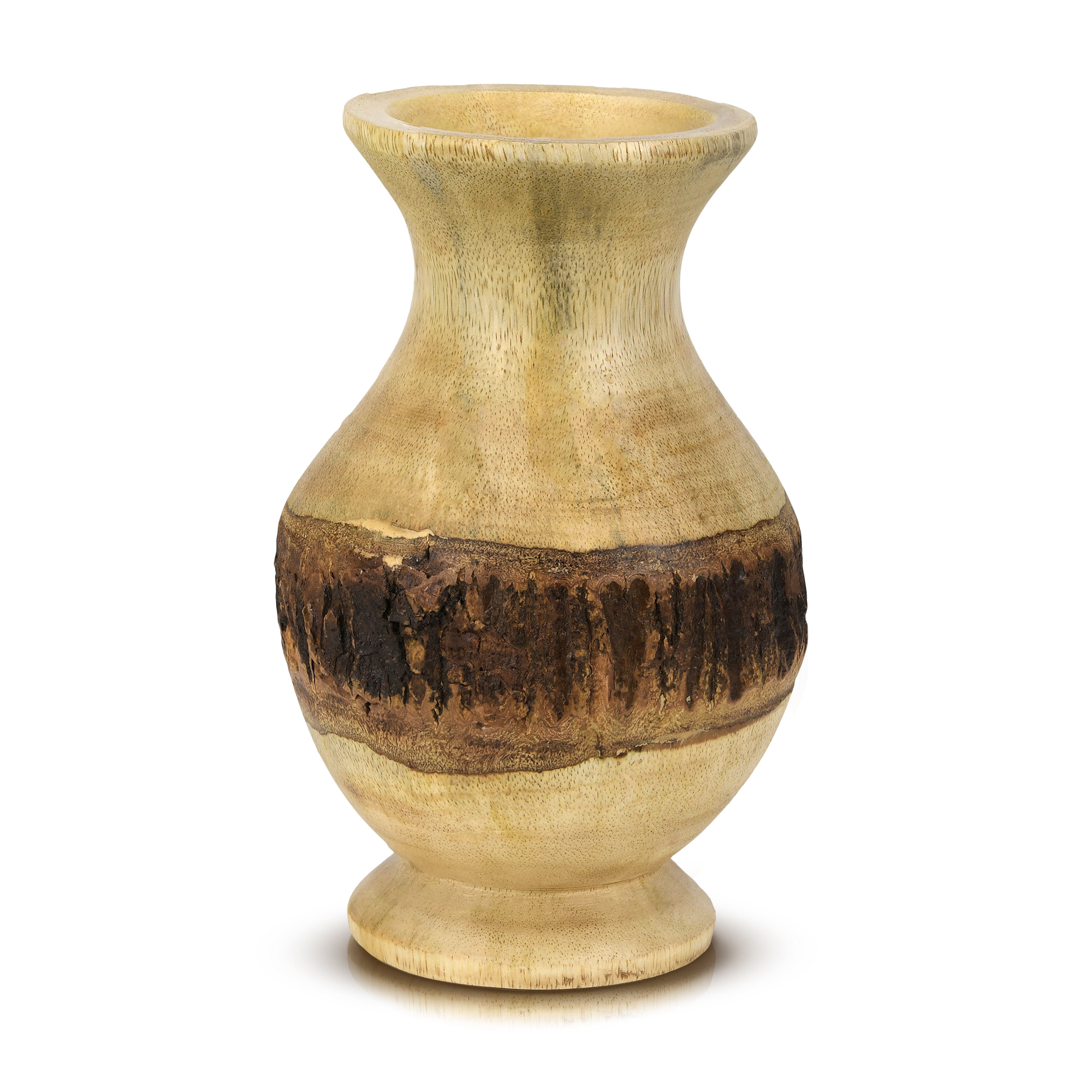 Bring rustic elegance to your farmhouse decor with this hand-carved natural bark mango wood vase. The textured bark adds authenticity and character, while the hand-carved details showcase artisanal craftsmanship. This vase is perfect for showcasing dried flowers, wheat stems, or as a standalone decorative piece on your mantel or shelf. Embrace the charm of farmhouse style with this unique and timeless vase. Feel free to check out more designs via our other listings. NOTE: Due to the handcrafted nature of this product, minor differences in design, sizing, and weight will occur from piece to piece. The exact measurements may vary slightly. Pictures may not be true to scale, please check the dimensions for the actual size.