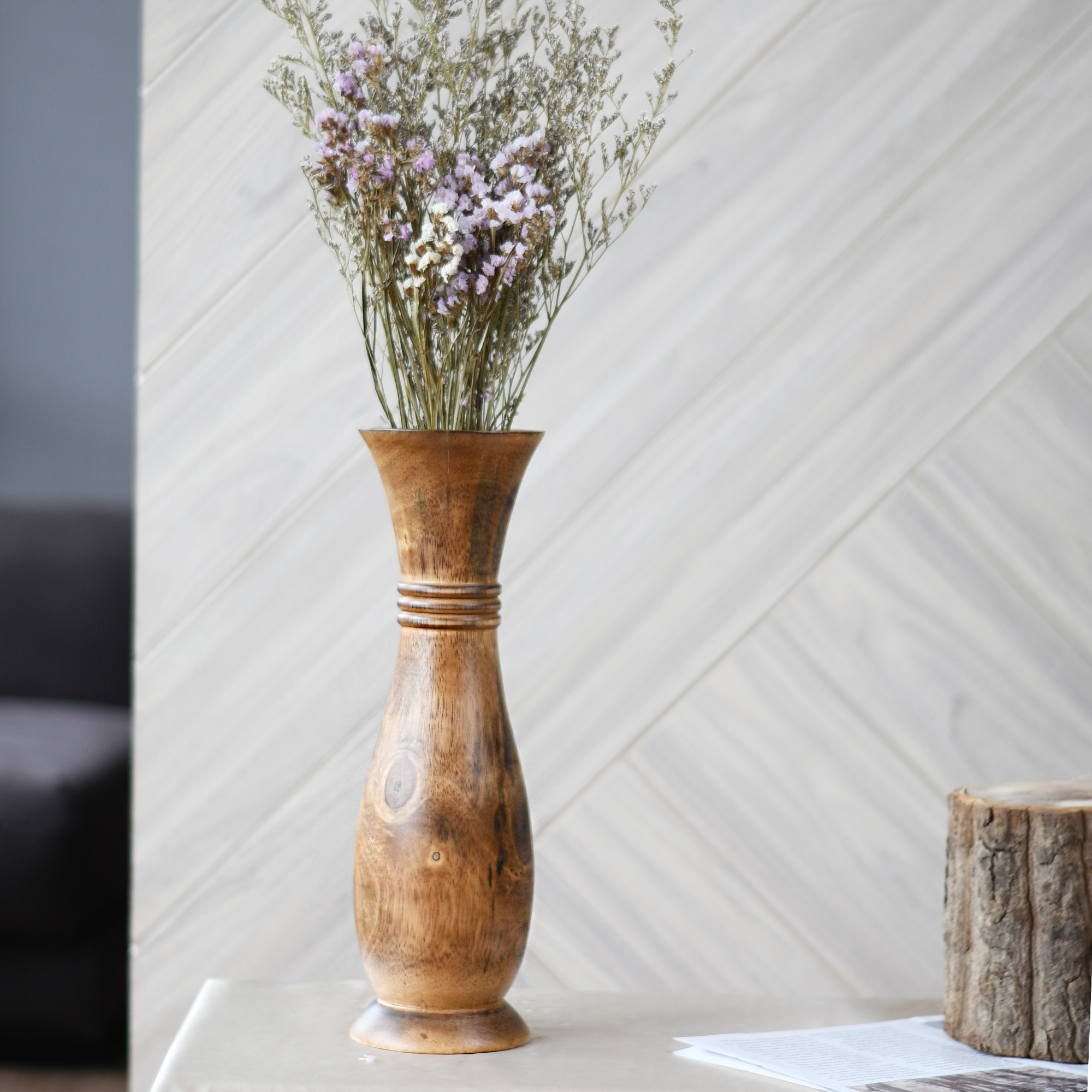 Boho Carved Stripes Brown and 14-inch Natural Mango Tree Wood Vase