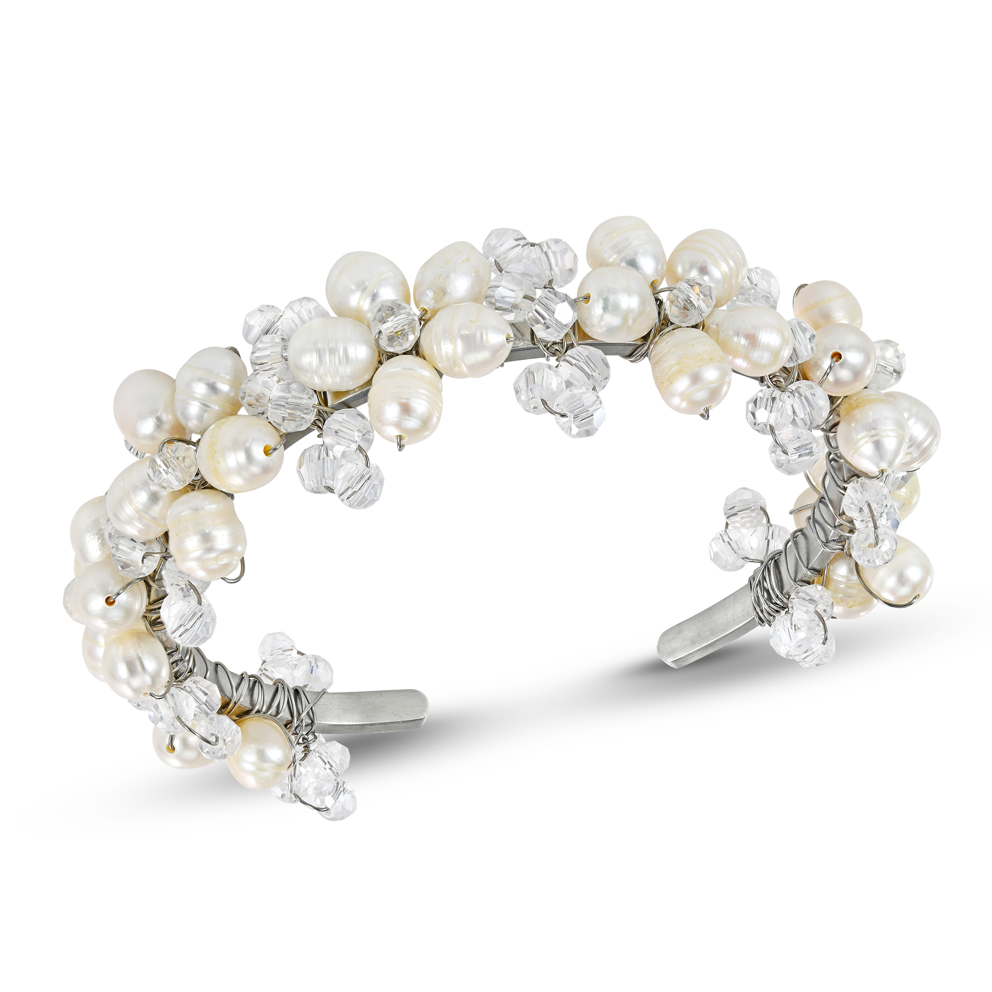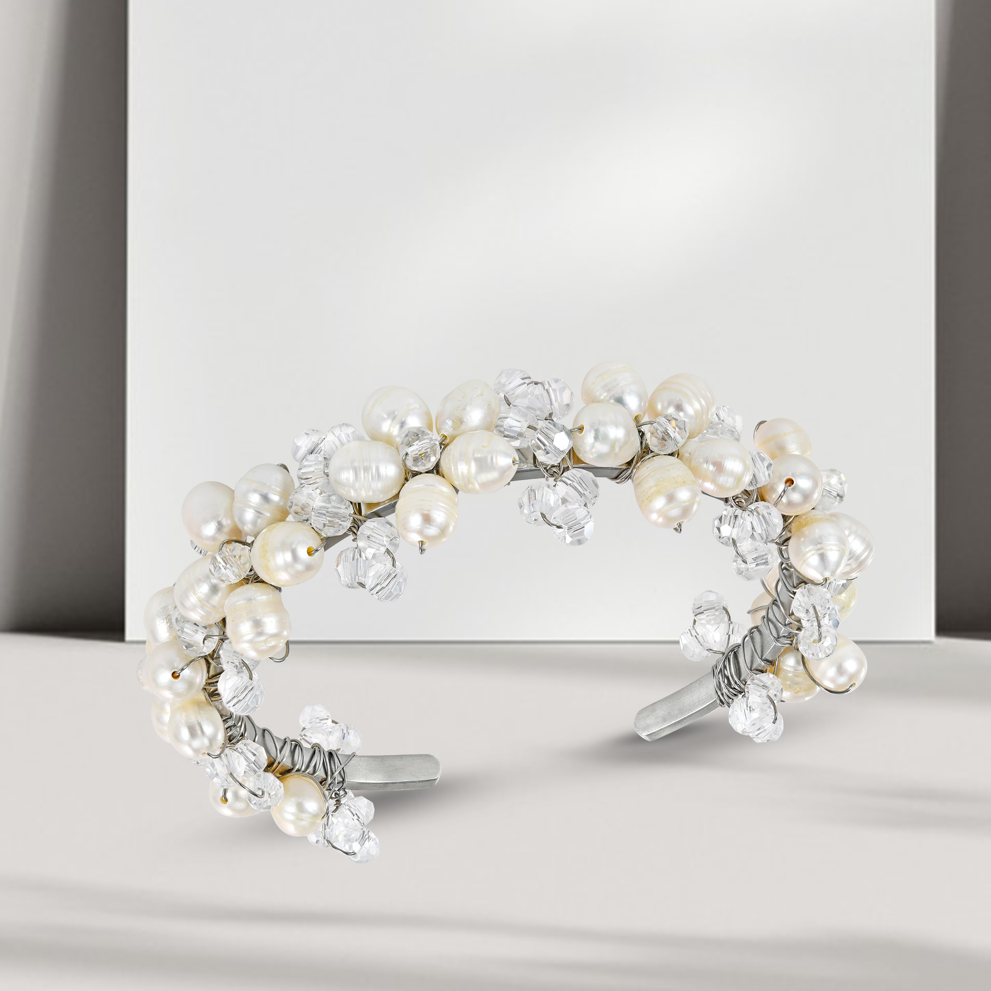 Elegantly Handcrafted White Pearl & Crystal Flowers Cuff Bracelet