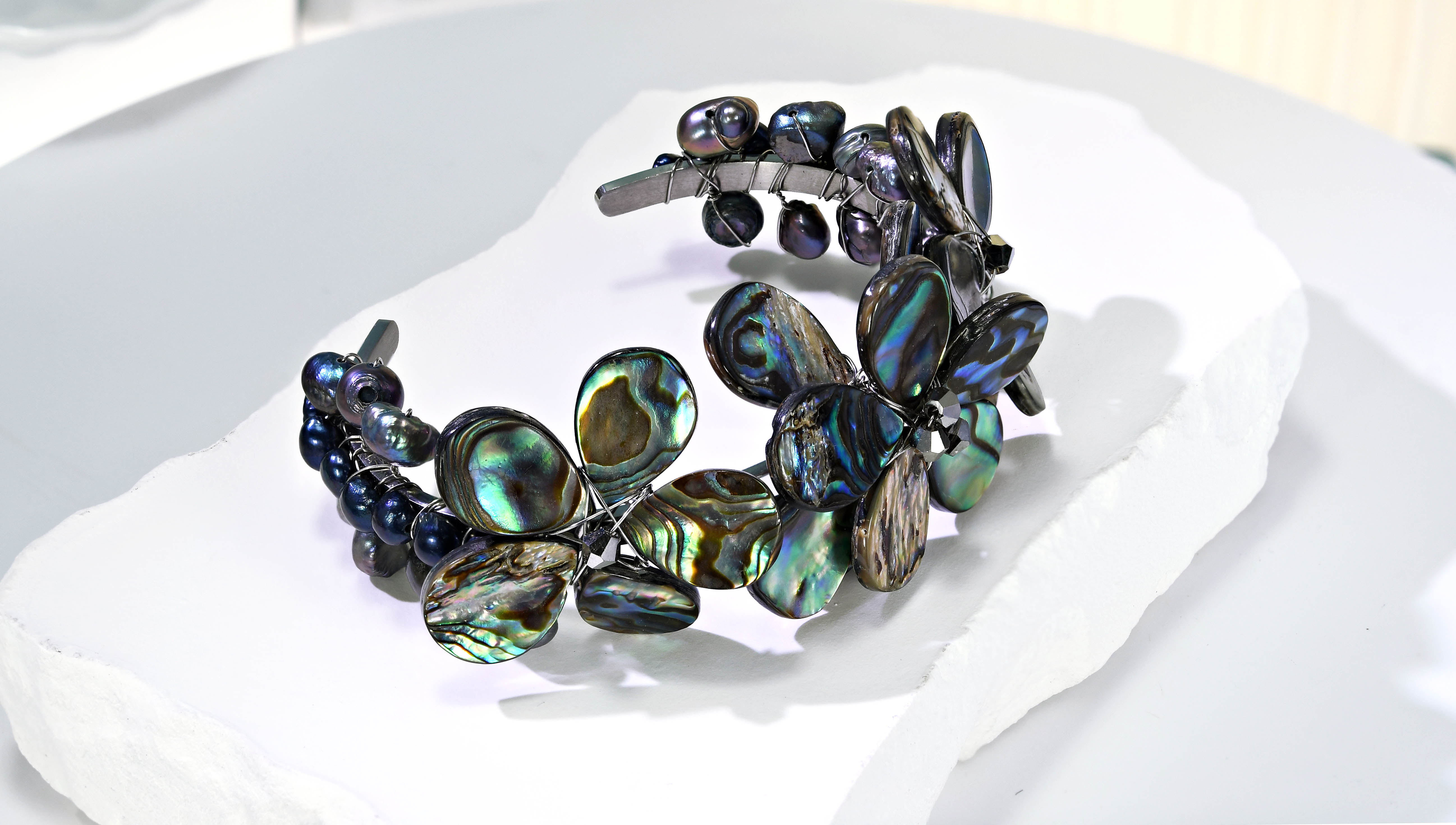 Gorgeous Mix of Abalone Shell Shell, Pearl, and Crystal Floral Cuff Bracelet