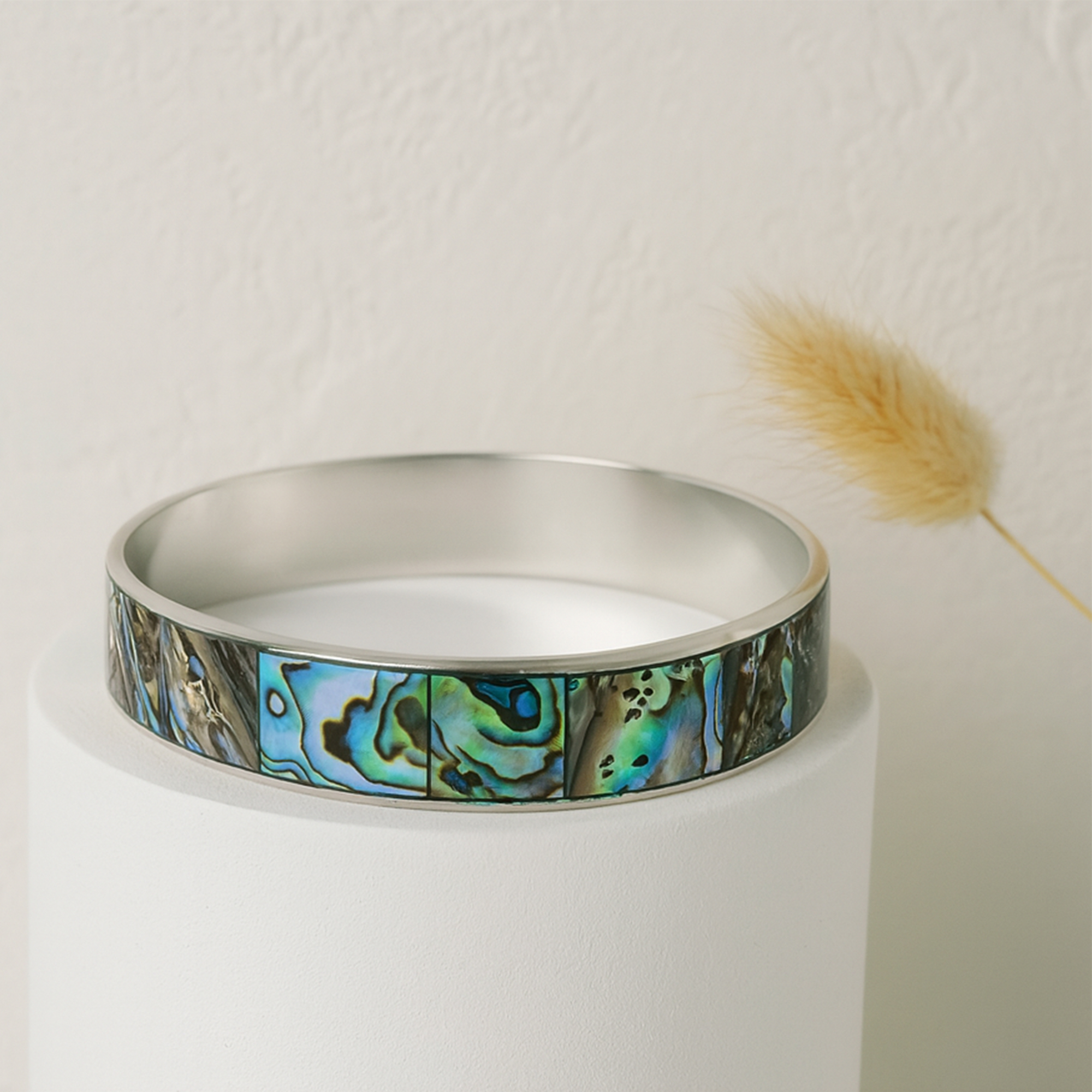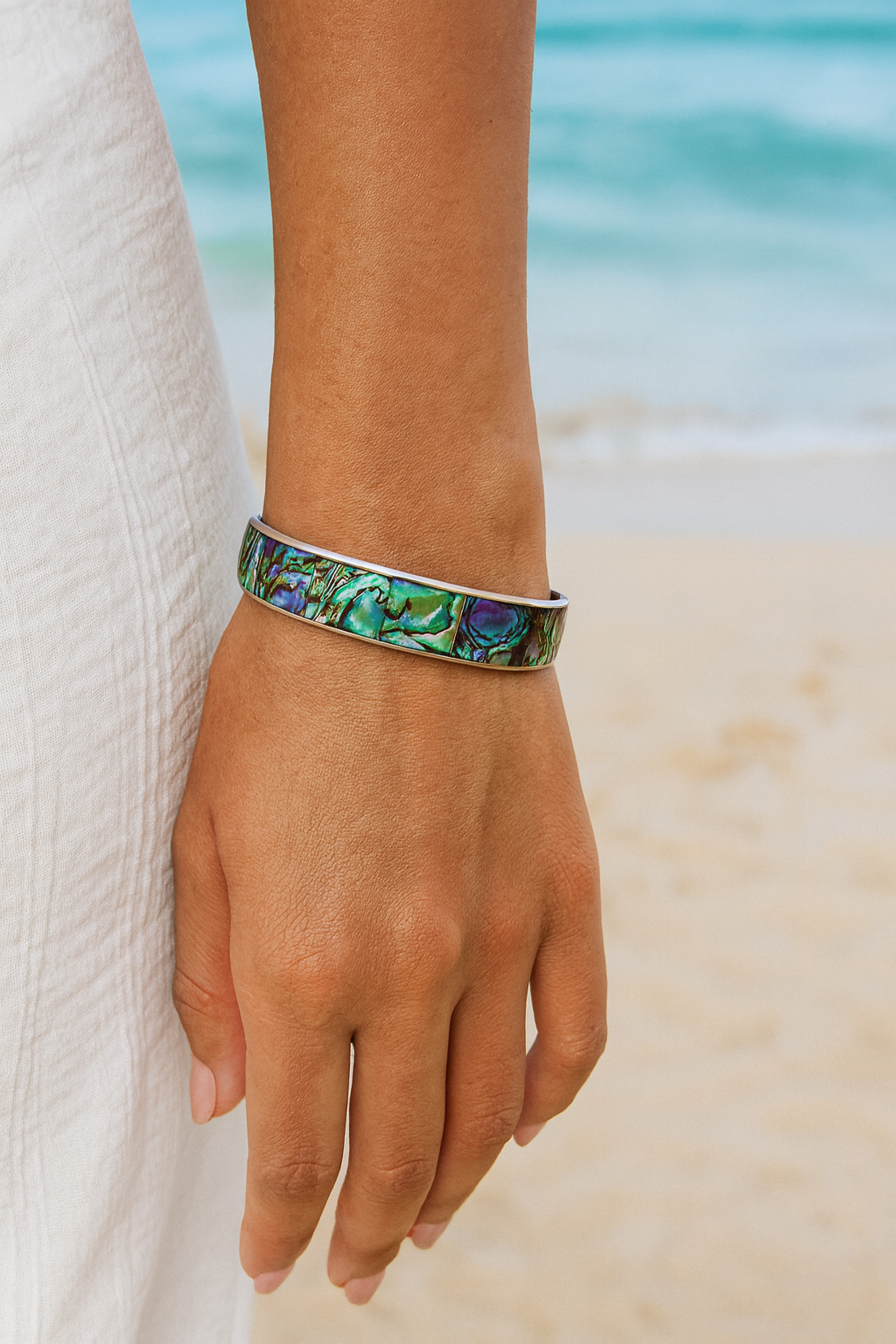 Inspired by the beauty found within the vast ocean, this stunning bracelet will add a tropical beach vibe to whatever you are wearing. Presented to us by artisan Mary Jane of the Philippine Islands, this stunning bracelet features genuine seashell set on a band of stainless-steel. The iridescent shine of the shell will display different colors and shades with every move you make. All coming together to form this stunning bracelet that is a must have piece for any jewelry collection.