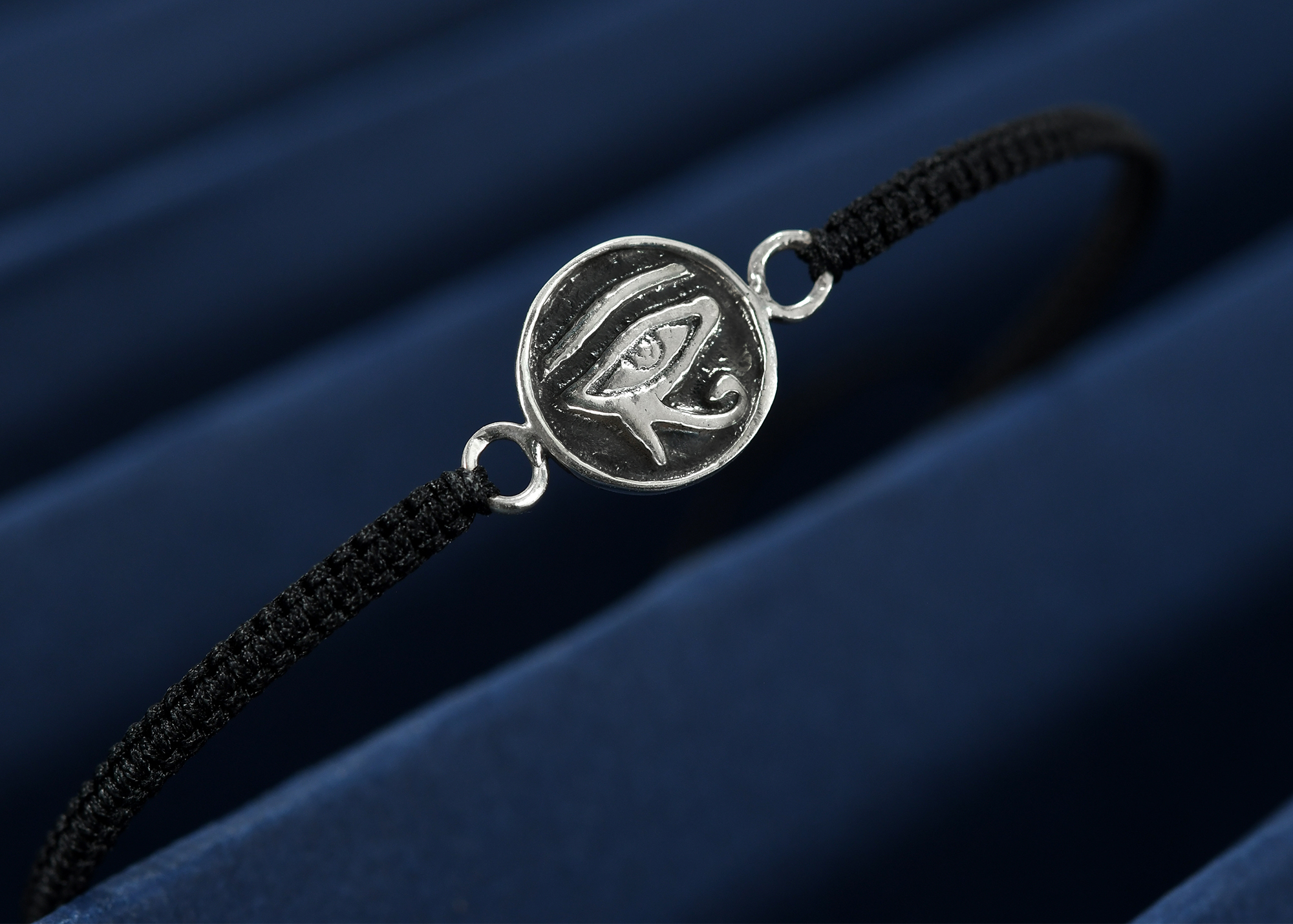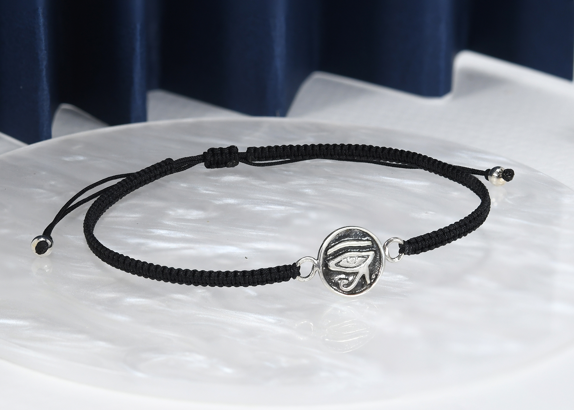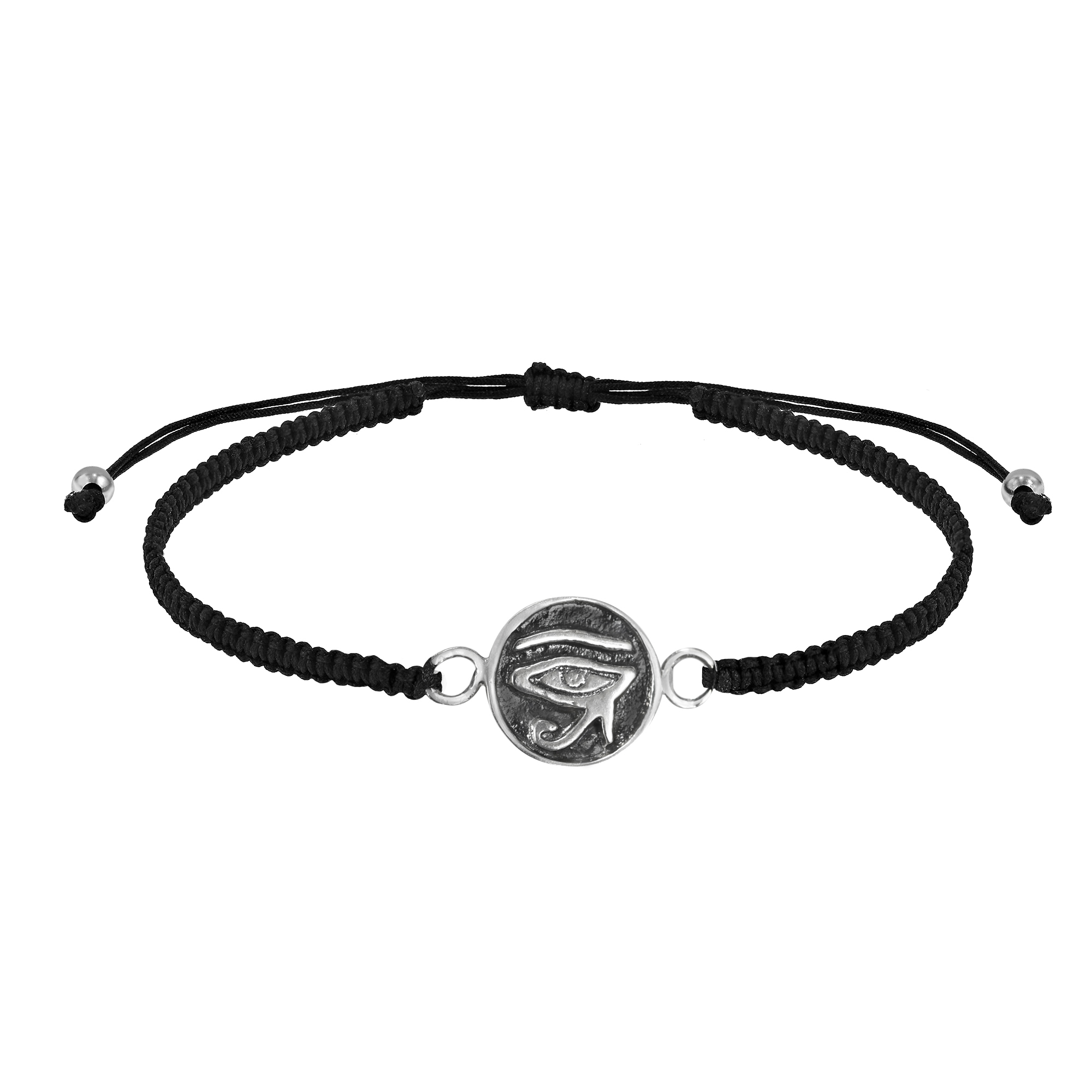 The Eye of Horus is an ancient Egyptian symbol of protection, royal power and good health. This piece features the Eye of Horus set in circle which is crafted from fine sterling silver. More Ancient Egyptian hieroglyphs create a stylish border while contrasting dark and shiny silver finishes highlight the intricate details. This meaningful charm is then set on a black silk rope and finished off with an adjustable pull slide, which ensures the perfect fit. Wear this macrame bracelet daily and add a touch of spiritual flair to any outfit.