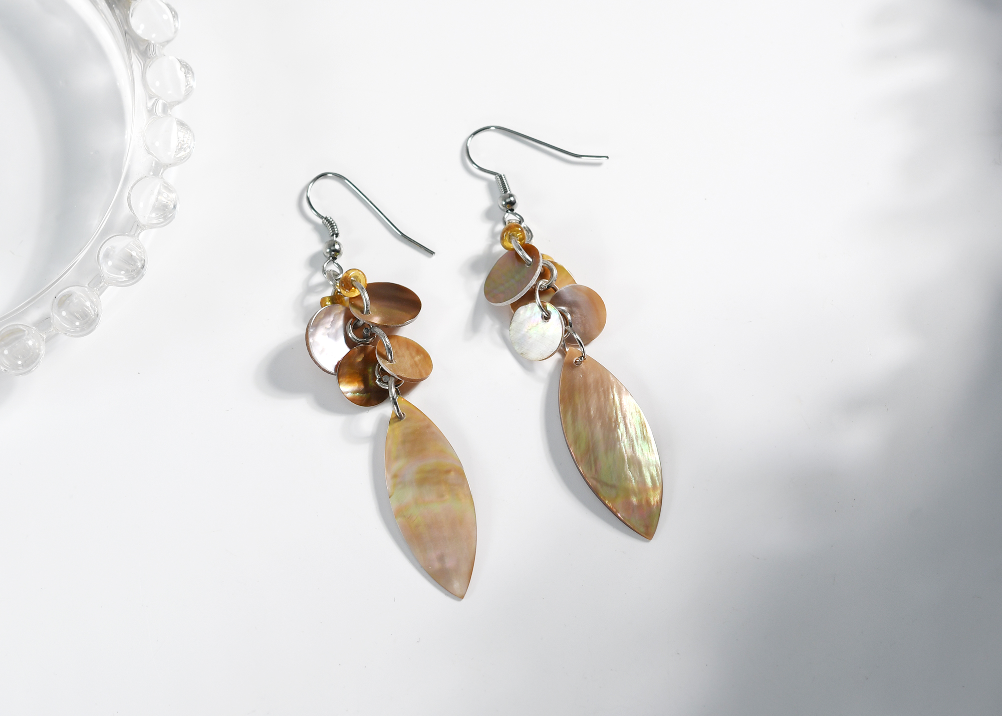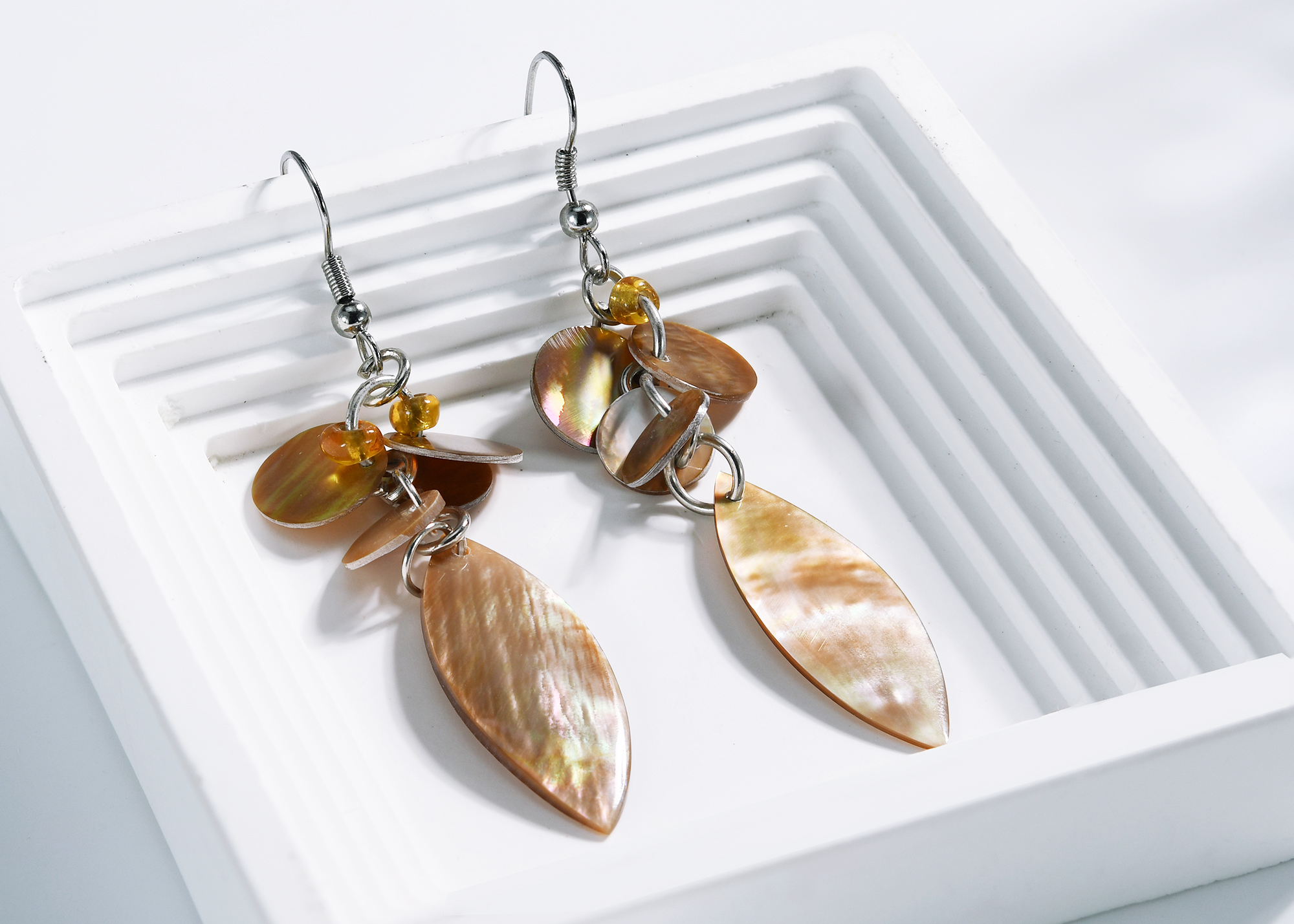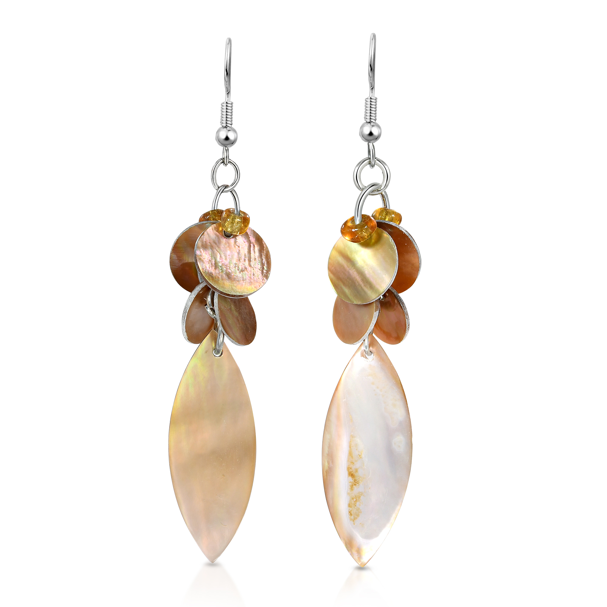 | Material: | Natural shell, beads, nickle free hooks |