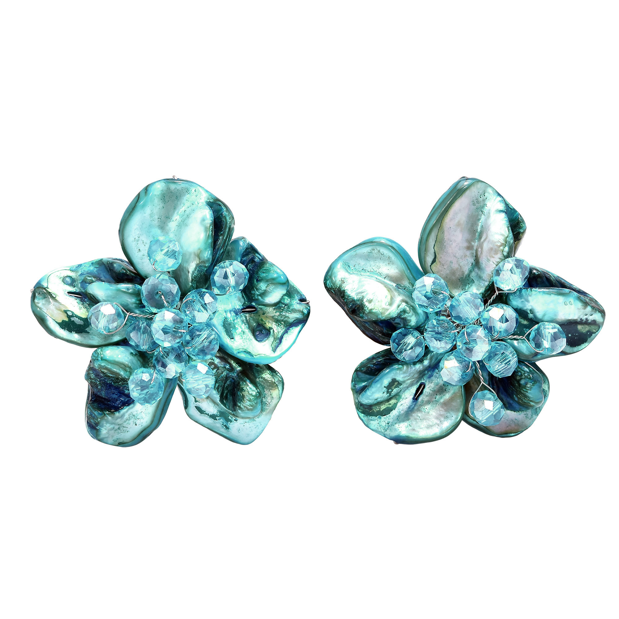 A stunning blossom is depicted with iridescent mother of pearl petals combined with natural stones and crystals in this stunning earring set designed and handmade by Khun [ARTISAN] from Thailand. This clip on earring set measures at nearly 2" in diameter and is great for women seeking a color accent to match their favorite outfits.
