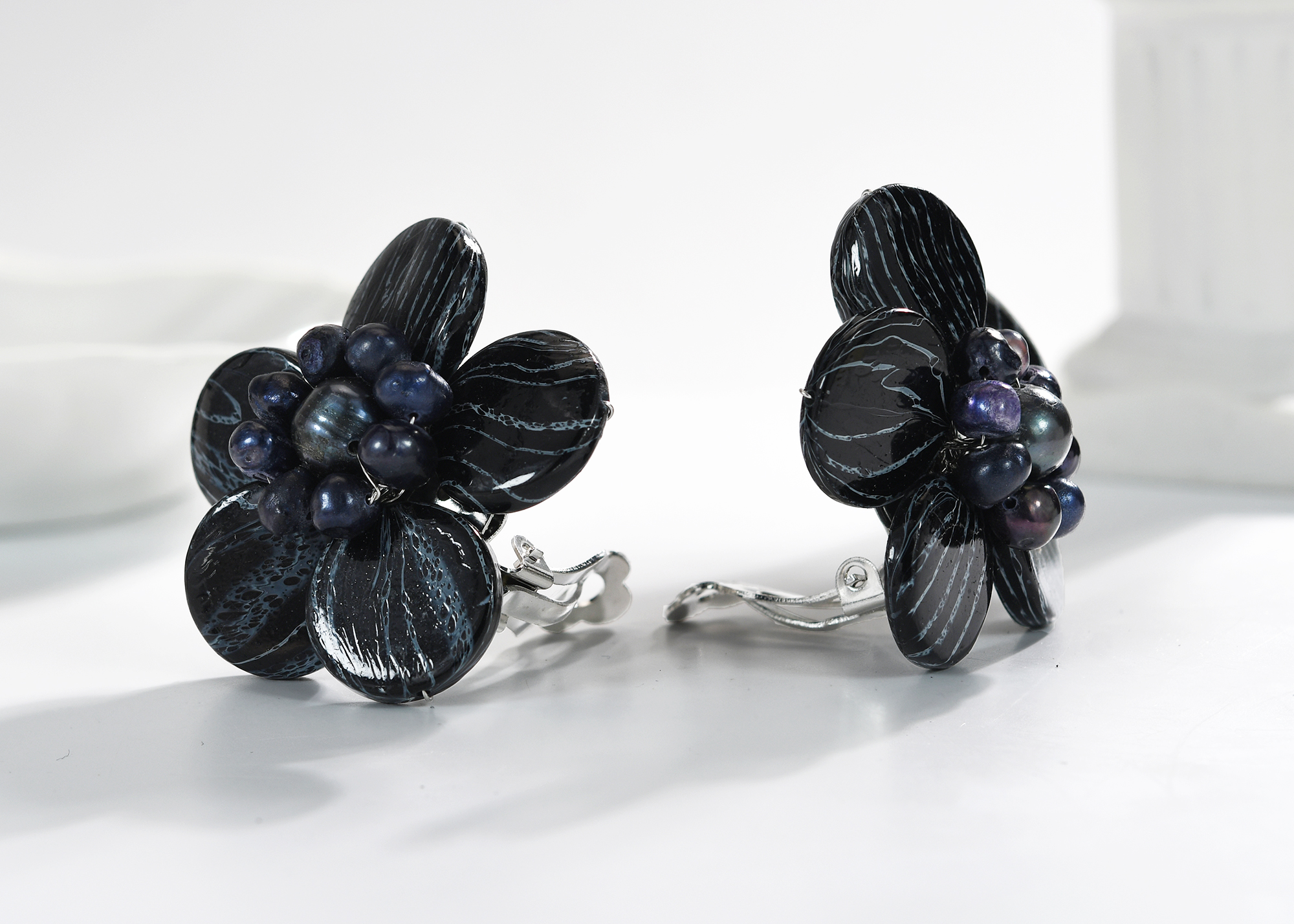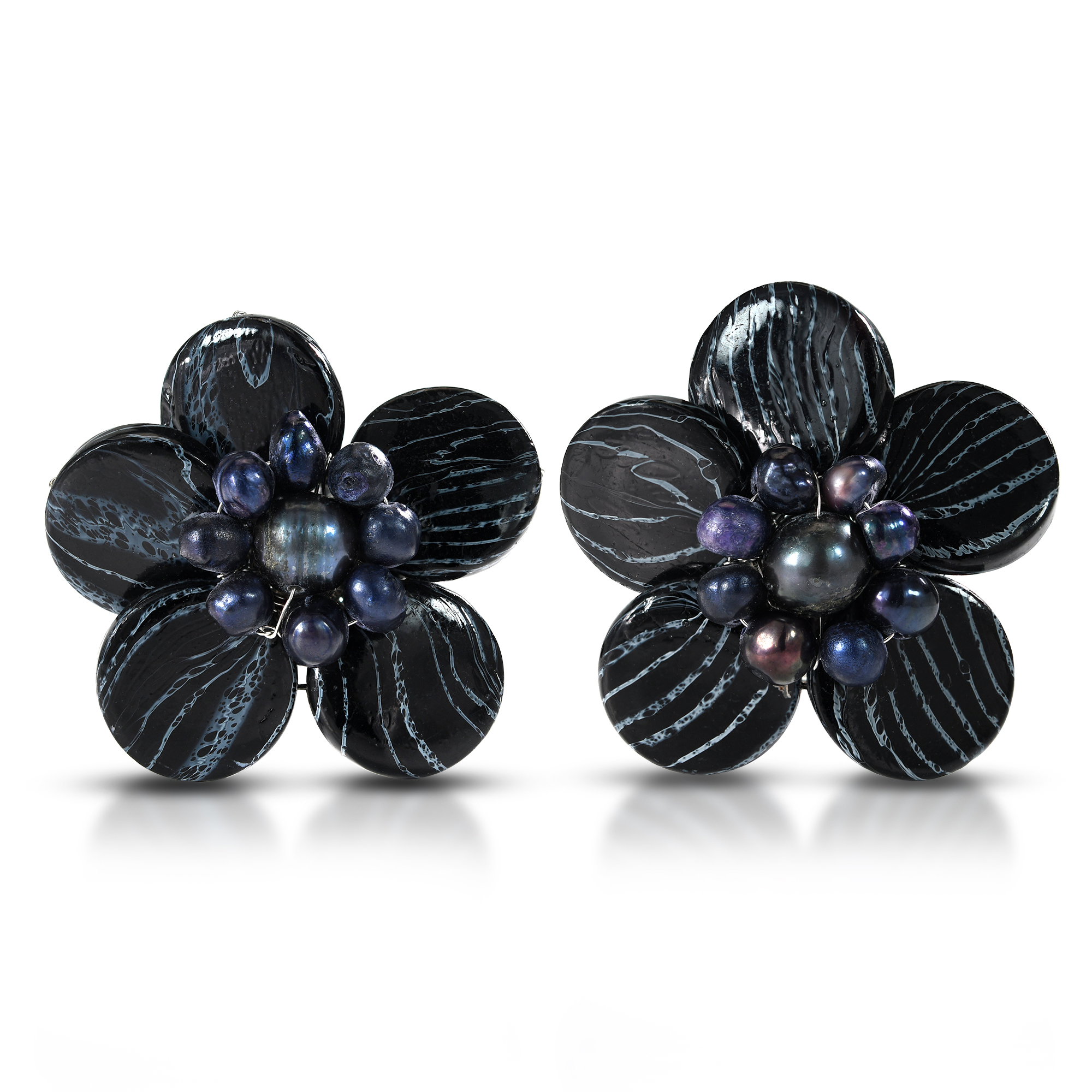 Dress up with these pair of handmade earrings from Thailand. These cute clip on earrings feature handpainted white mother of pearl in zebra pattern with crystal and freshwater pearl center.