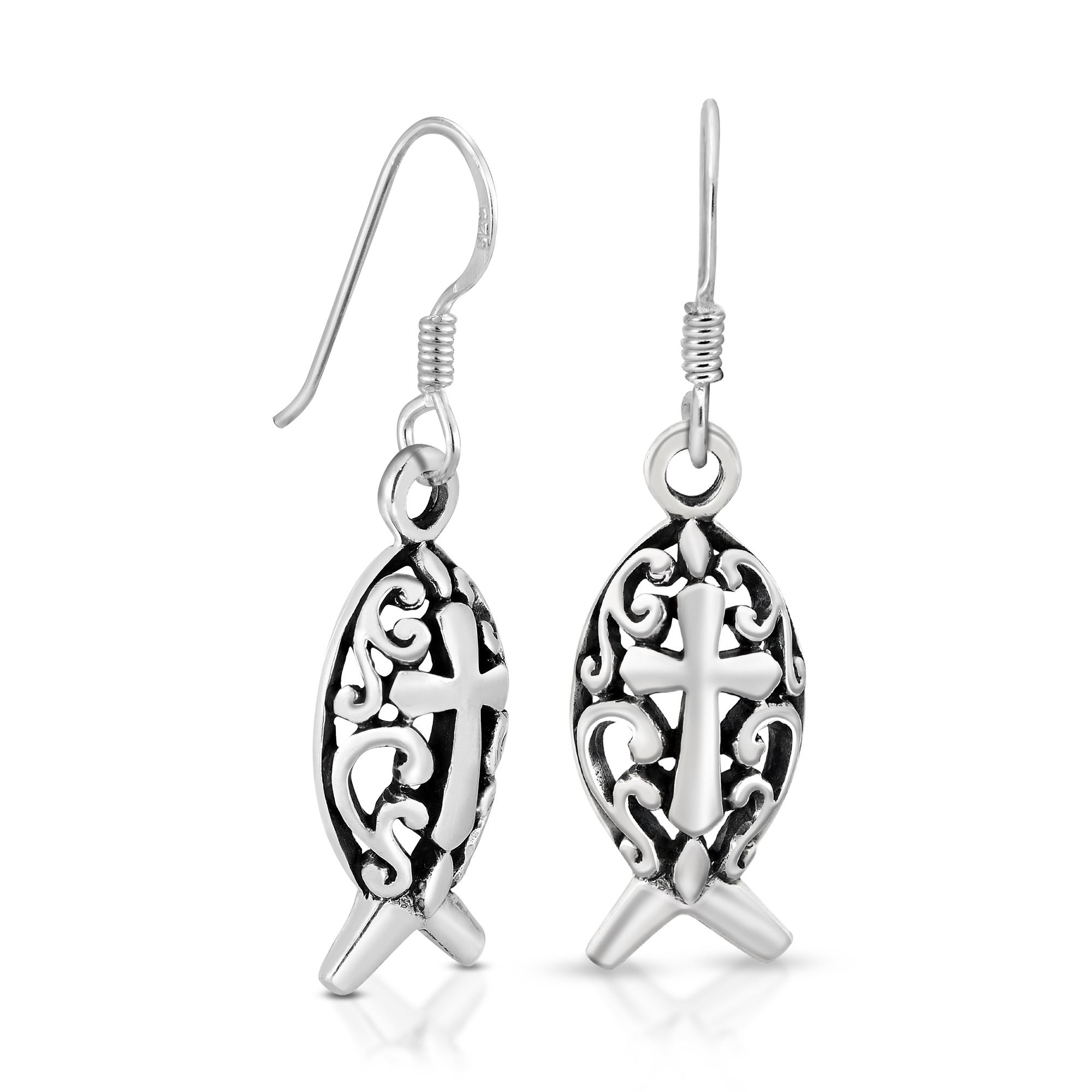 These earrings features a christian fish with a cross on its back, representing the symbol of faith. Crafted with sterling silver, these mystic earrings capture the essence of spirituality.