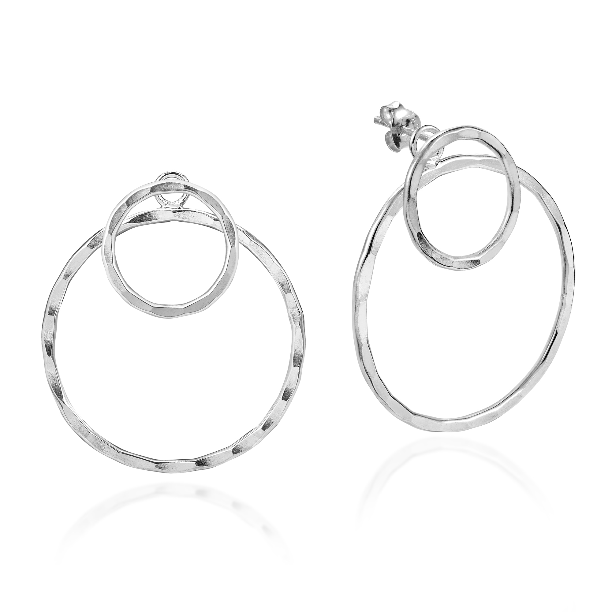 These fashionable and modern earrings will add a stylish and sleek accent to any ensemble meticulously crafted by Thai artisan Kai. For this piece, fine sterling silver is transformed into an overlapping pair of circles that feature a unique textured finish. The polished sterling silver combined with the textured finish catches the light on every angle beautifully. A simple yet contemporary design, these fashionable double circle earrings will look amazing with whatever you are wearing.