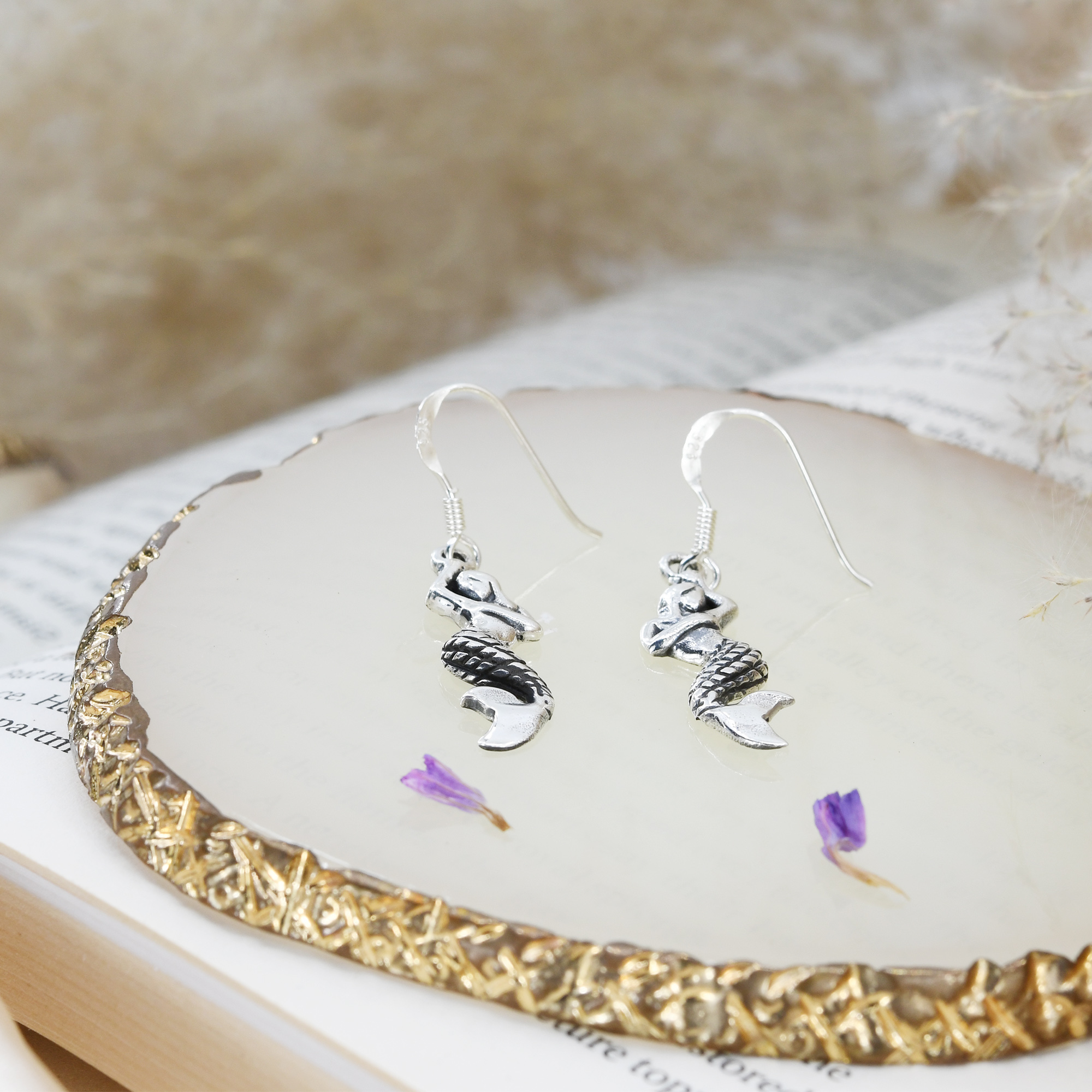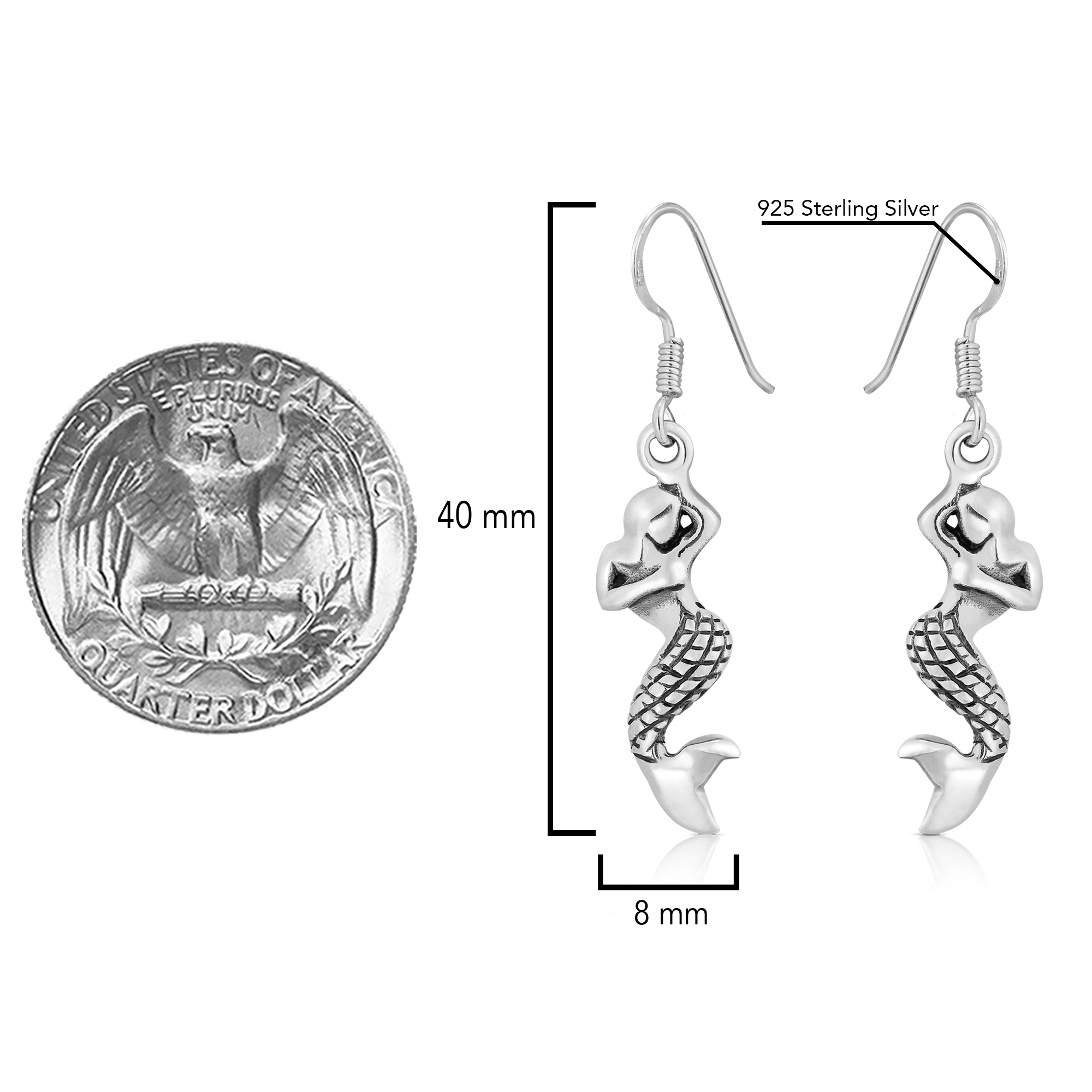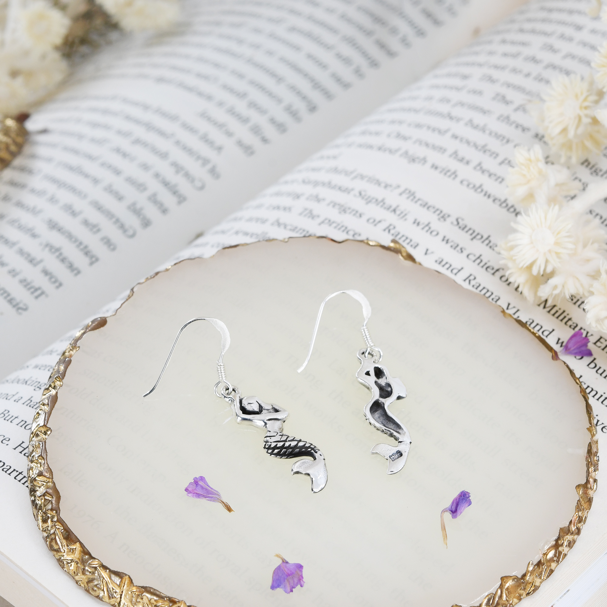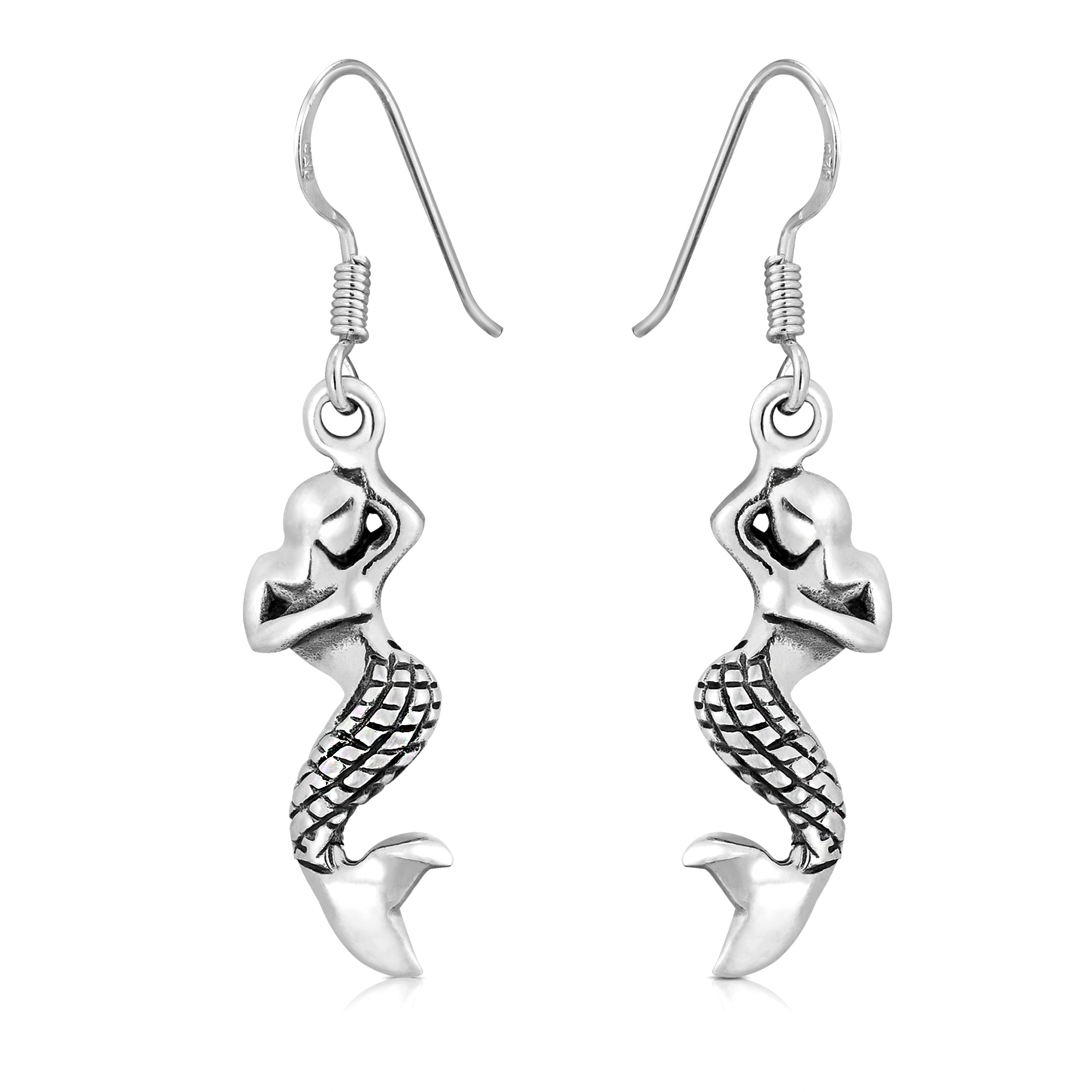Beautiful and stylish mermaids crafted from fine sterling silver make for a fun, ocean-inspired pair of earrings. Handcrafted by artisans Andy and Kathy of Thailand, these earrings feature beautiful detail with contrasting polished and oxidized silver finishes, which also showcases the artisans metalworking skill. All swinging from fishhook clasps, this playful fashion accessory is a must have for any jewelry collection. Dress them up or dress them down, either way, these earrings will look amazing with whatever you are wearing.