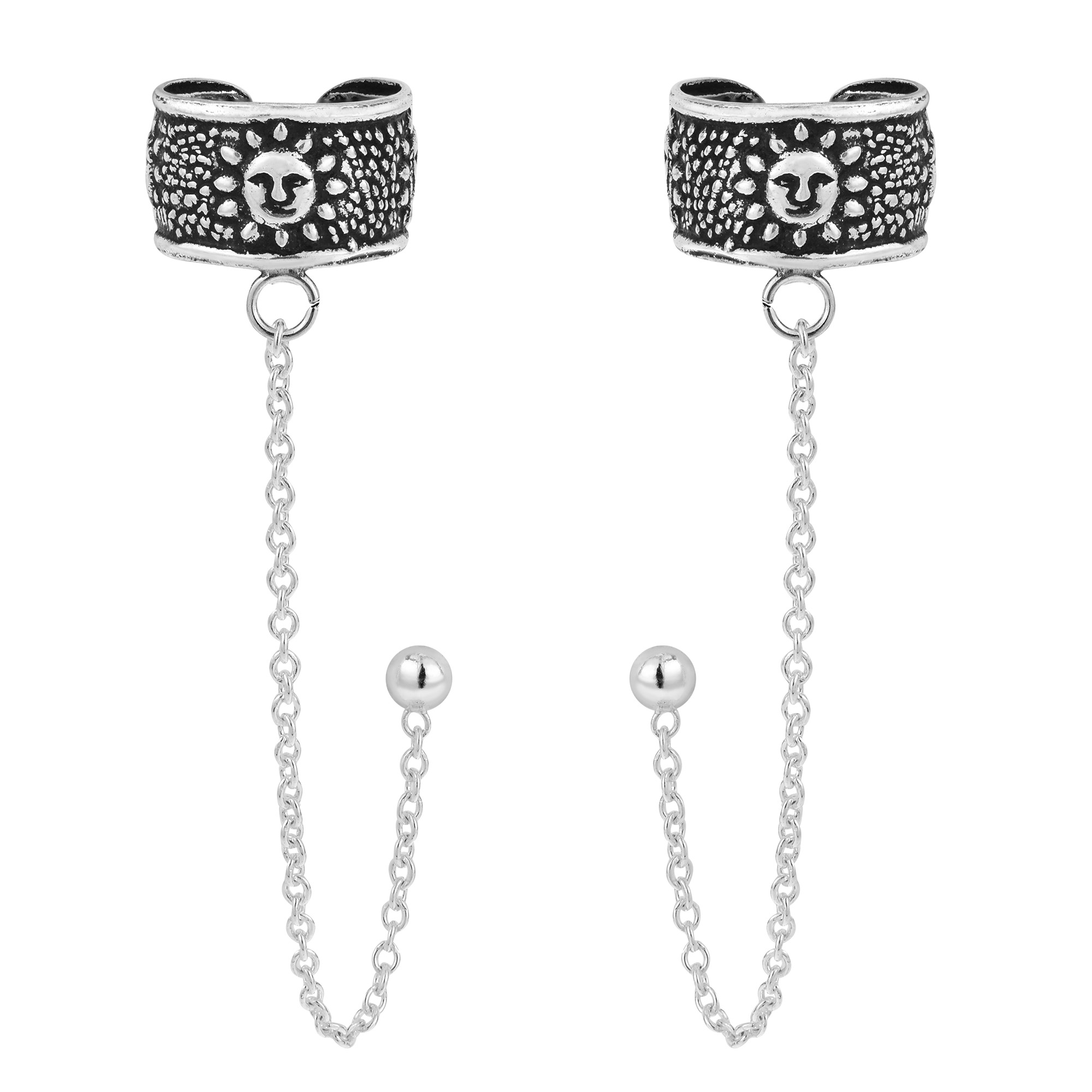 Turn up your fashion statement with these on-trend amazing piece of ear jewelry, which features a stylish ear cuff design that connects to a chain that is then attached to a stud earring. The ear cuff is embellished with an intricate blazing sun, which adds a vintage vibe to the piece. All handcrafted from sterling silver, this amazing piece of ear art will definitely get noticed hanging from your ear. A trendy and fashion forward accessory from Thai artisan Thip that will compliment any outfit.