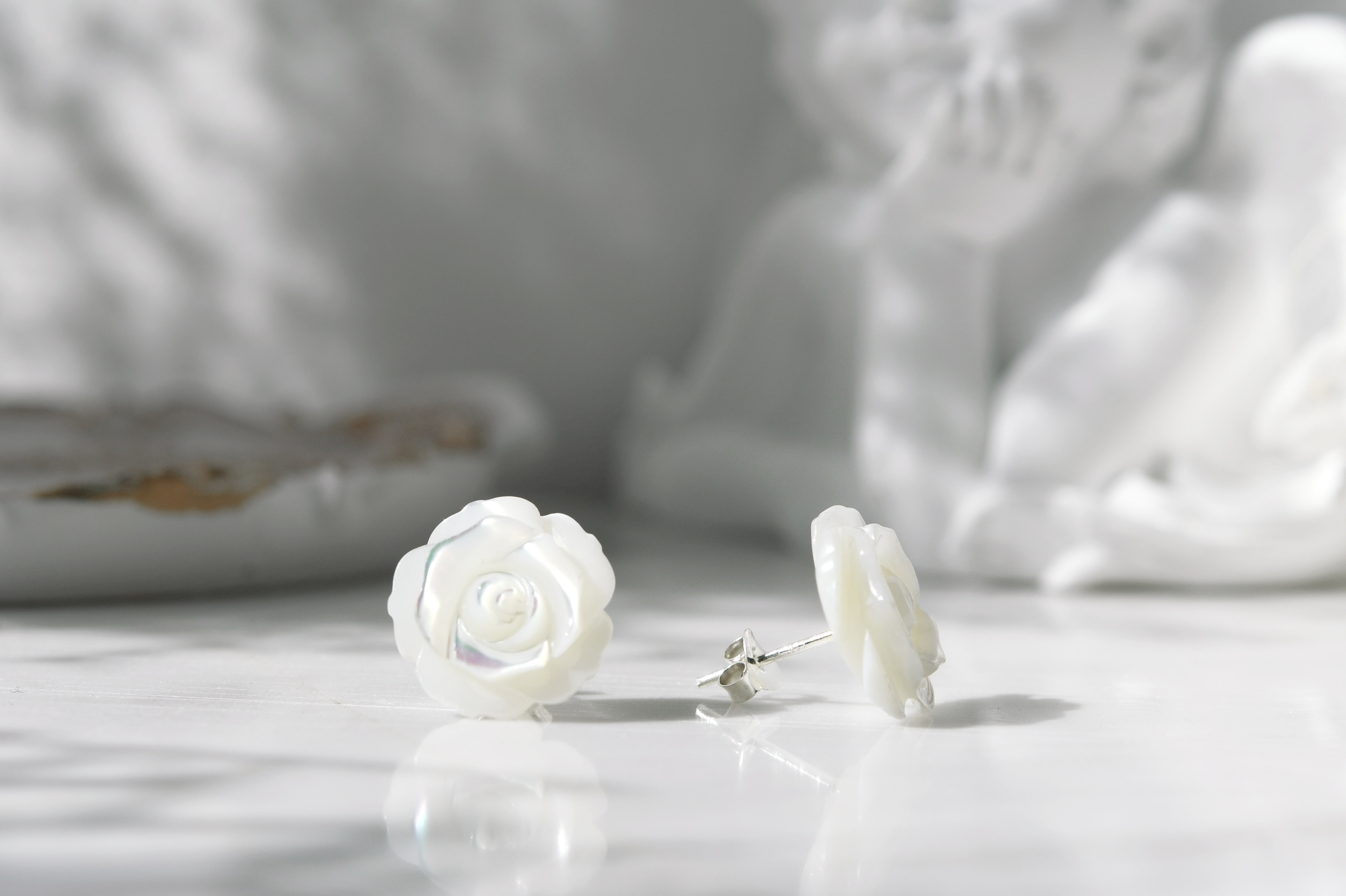 Artisan Naree captures the elegant beauty found within a rose blossom with these elegant earrings. Her design features a hand carved piece of Mother of Pearl shell that is transformed into a delicate white rose. This truly beautiful and stylish pair of earrings will compliment any outfit and would also be perfect for everyday wear.