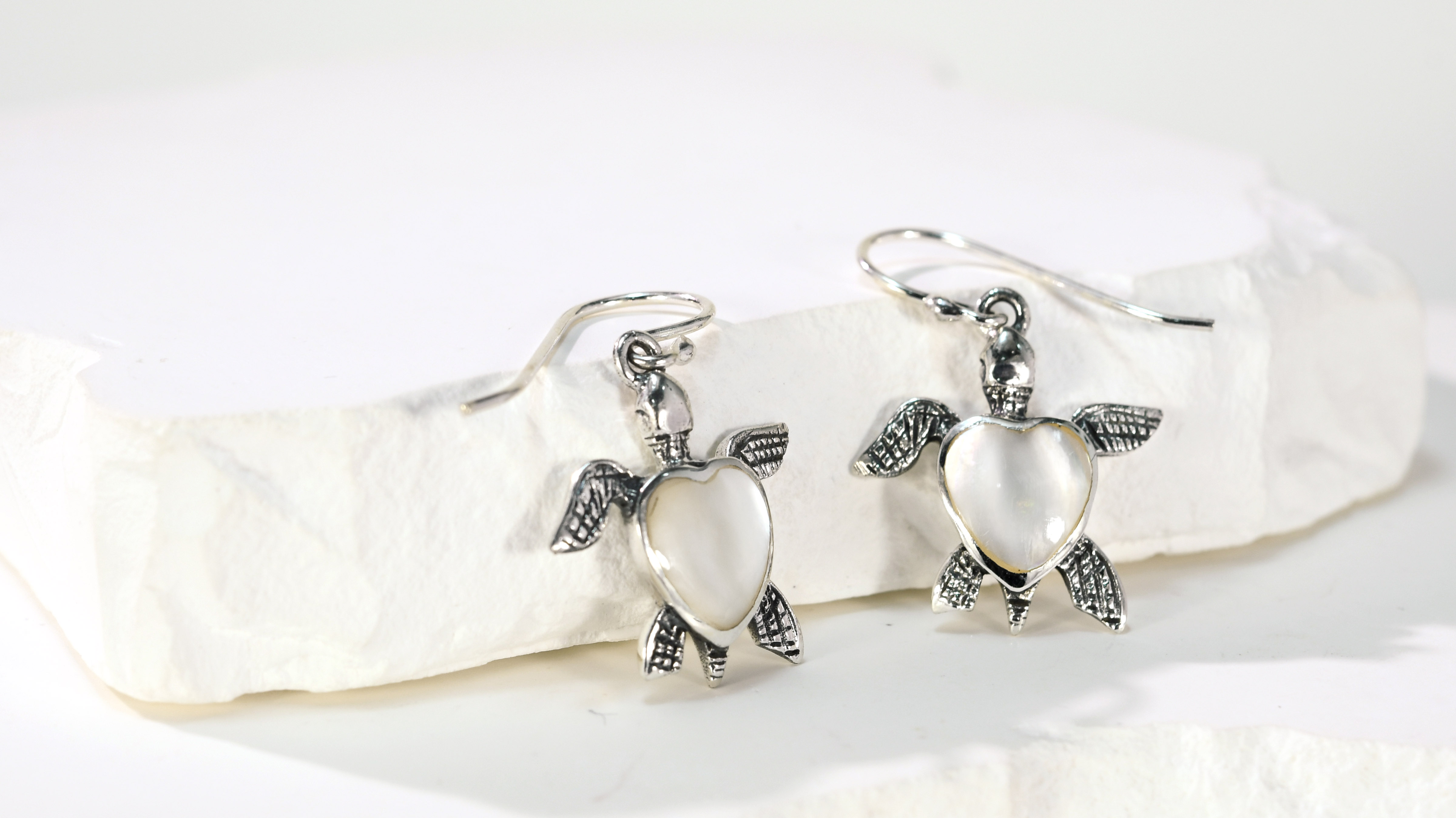 In many cultures around the world, the majestic sea turtle symbolizes creation, strength, and good fortune. With that in mind, artisan Watsud of Thailand creates these stunning earrings featuring a pair of sea turtles crafted from fine sterling silver. A beautiful stone or shell inlay is used for the shell, which adds both style and color to these earrings. These inlays are shaped into a heart, which symbolize a love of the ocean. All coming together to form a beautiful pair of earrings that you can wear with just about anything.