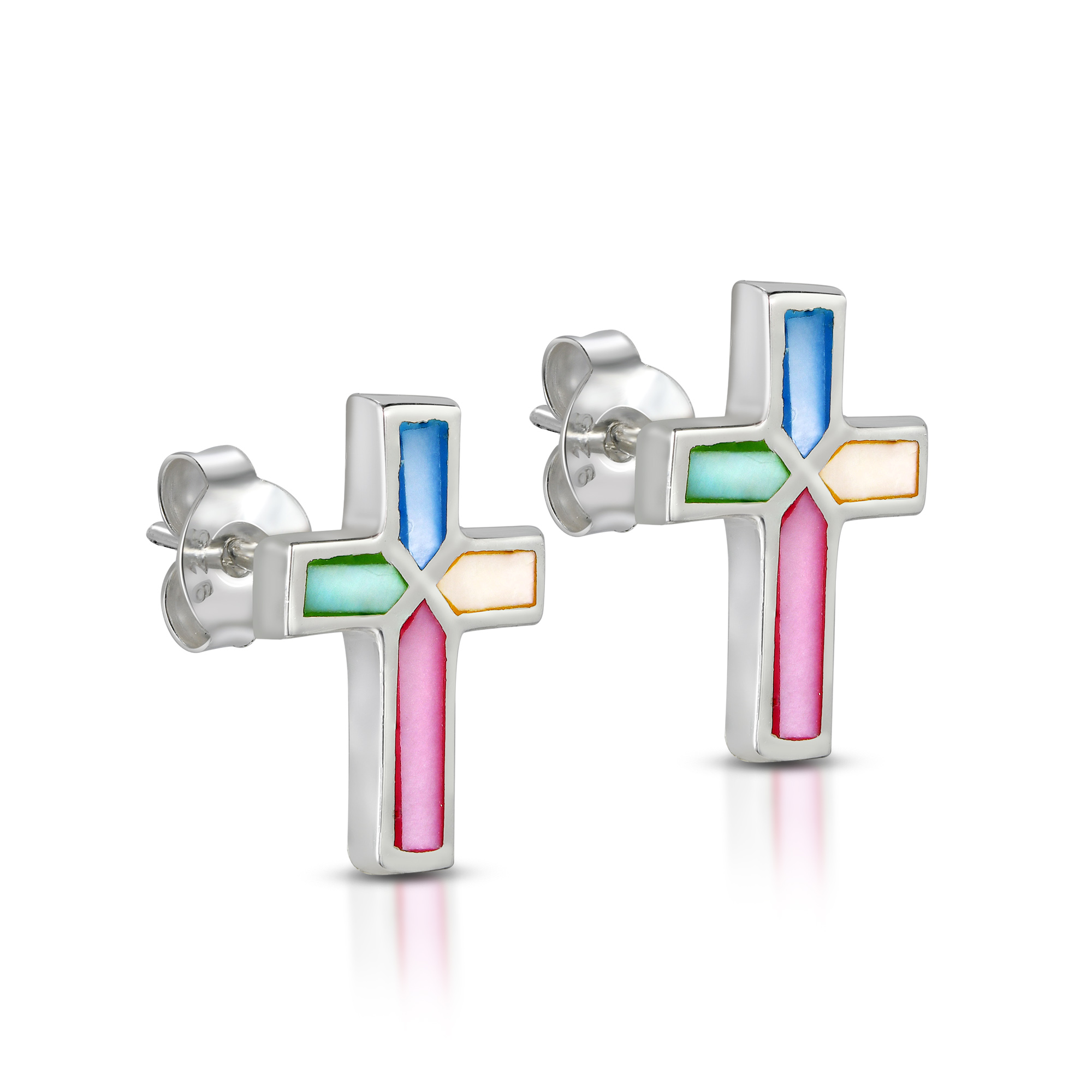 Stylishly Elegant Multi Colored Shell Inlaid Sterling Silver Cross Earrings