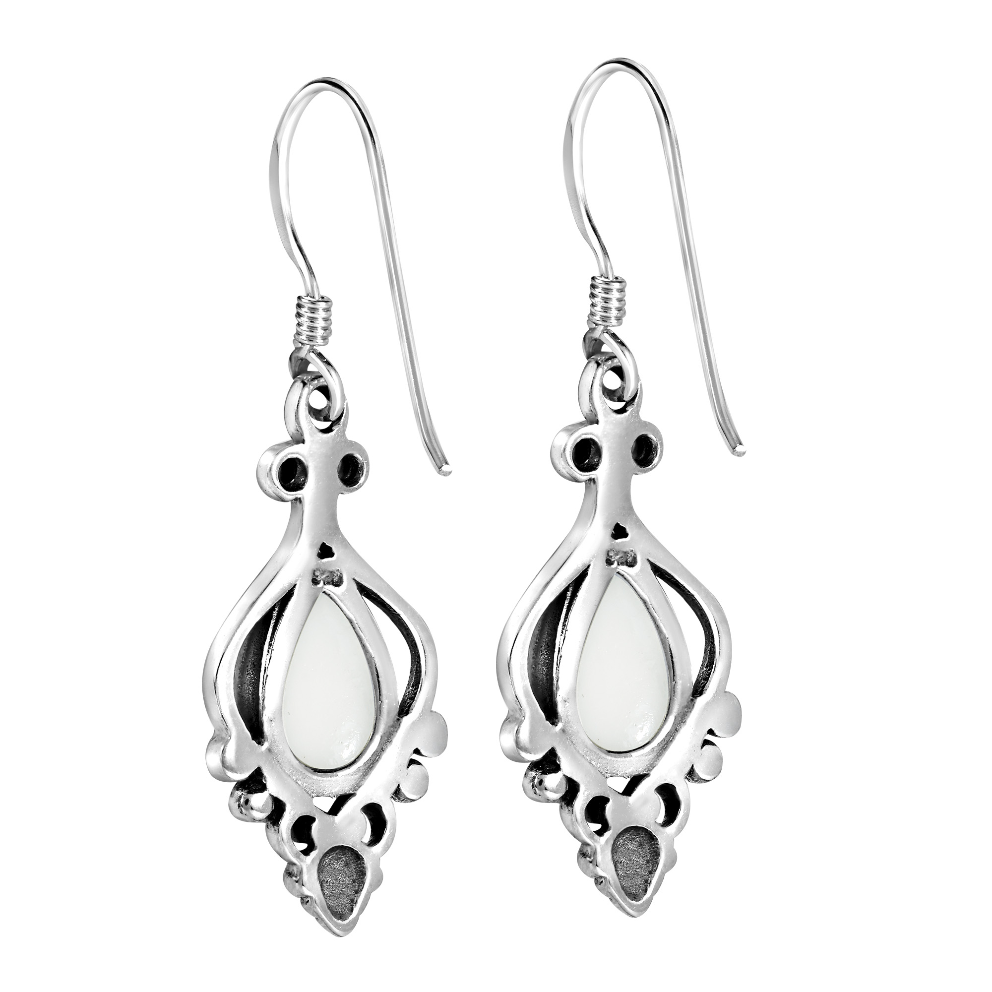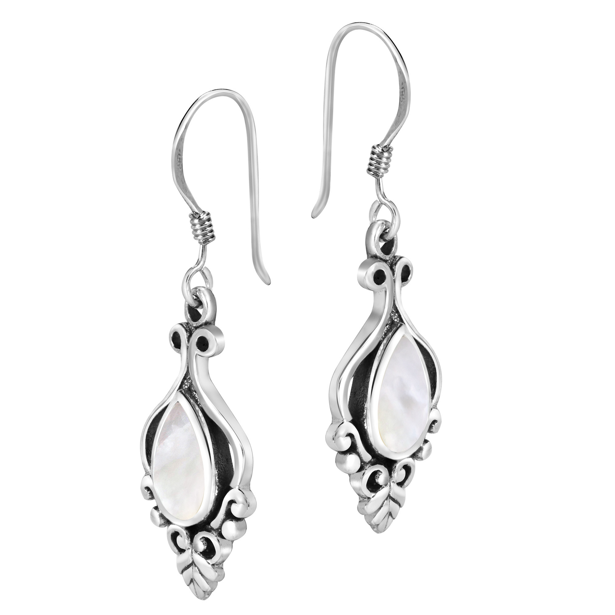 Designed by Thai Artisan Tuey, these striking earrings showcase a Victorian inspired design using polished sterling silver. A teardrop shaped and iridescent seashell inlay is added for a gorgeous centerpiece. These dangle earrings are decorated with intricately elegant swirls, which showcases the artisan’s experience and metalworking skill. Versatile enough for a wide variety of outfits, these earrings are sure to give your style a sophisticated touch of elegance that will look amazing with whatever you pair them with.
