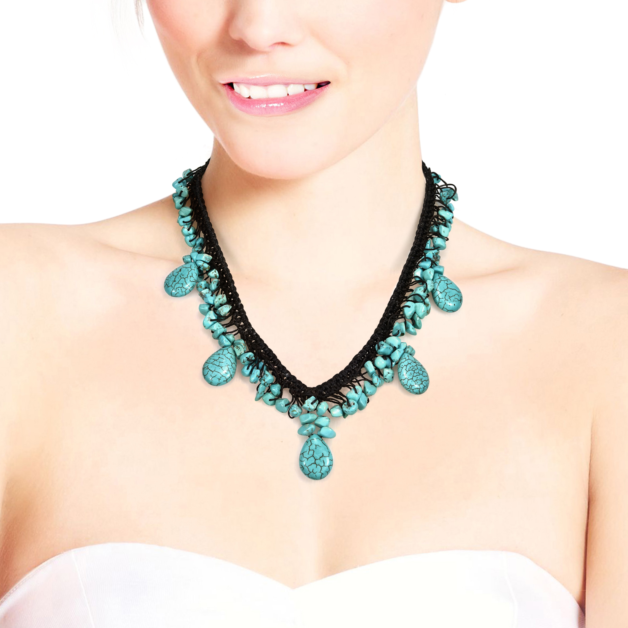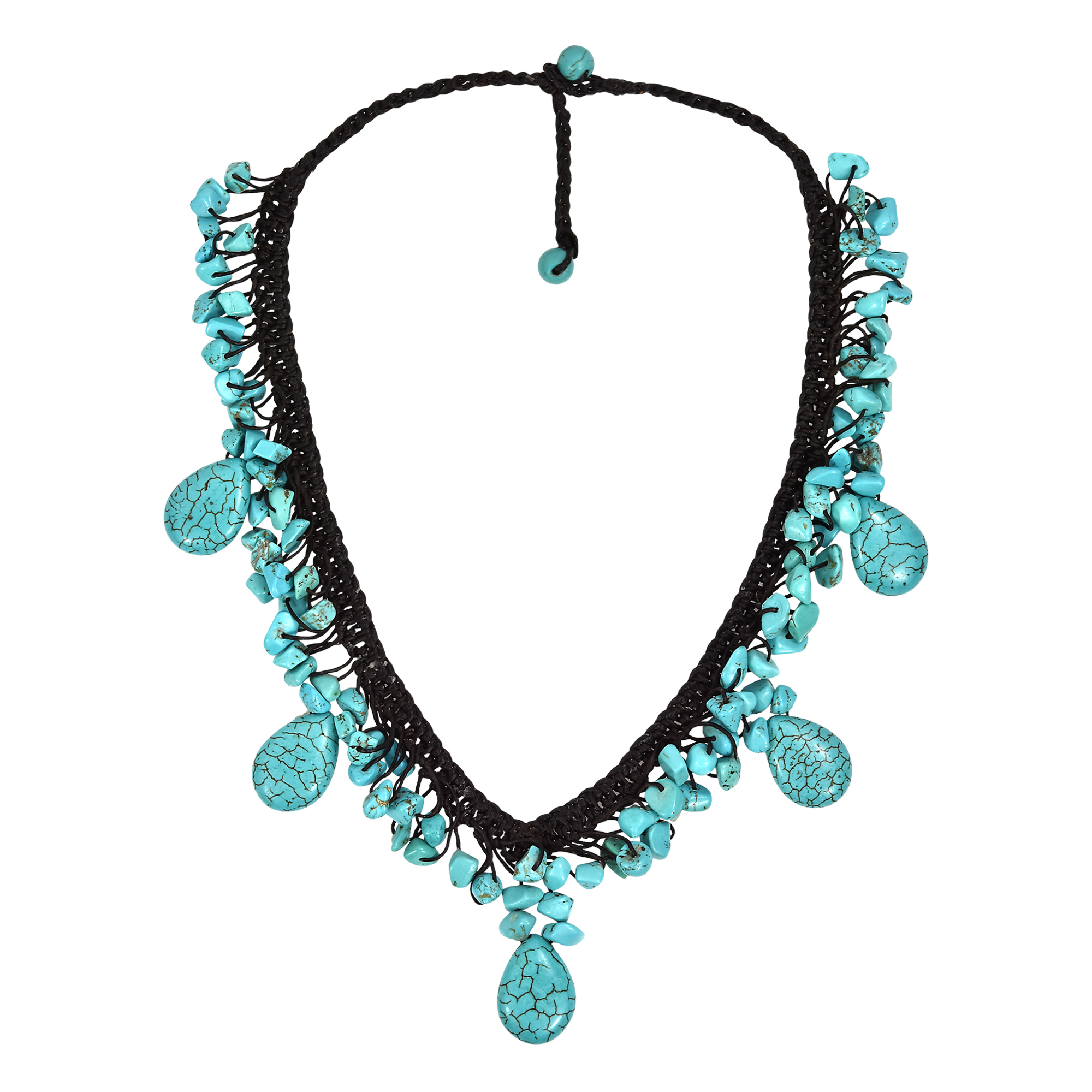 Upgrade your style options with this amazing necklace from Thai artisan Tor, whose unique sense of style is perfect for making bold fashion statements. This design features reconstructed turquoise stones which hang from cotton wax rope, the addition of wax adds durability to the chord and an adjustable toggle clasp ensures a great fit. The stones are a unique combination of both teardrop and rough-cut pieces. The contrast between the colorful turquoise and the dark brown rope creates an elegant color combination. All coming together in a truly beautiful handcrafted necklace that will look great with whatever you pair it with.