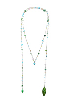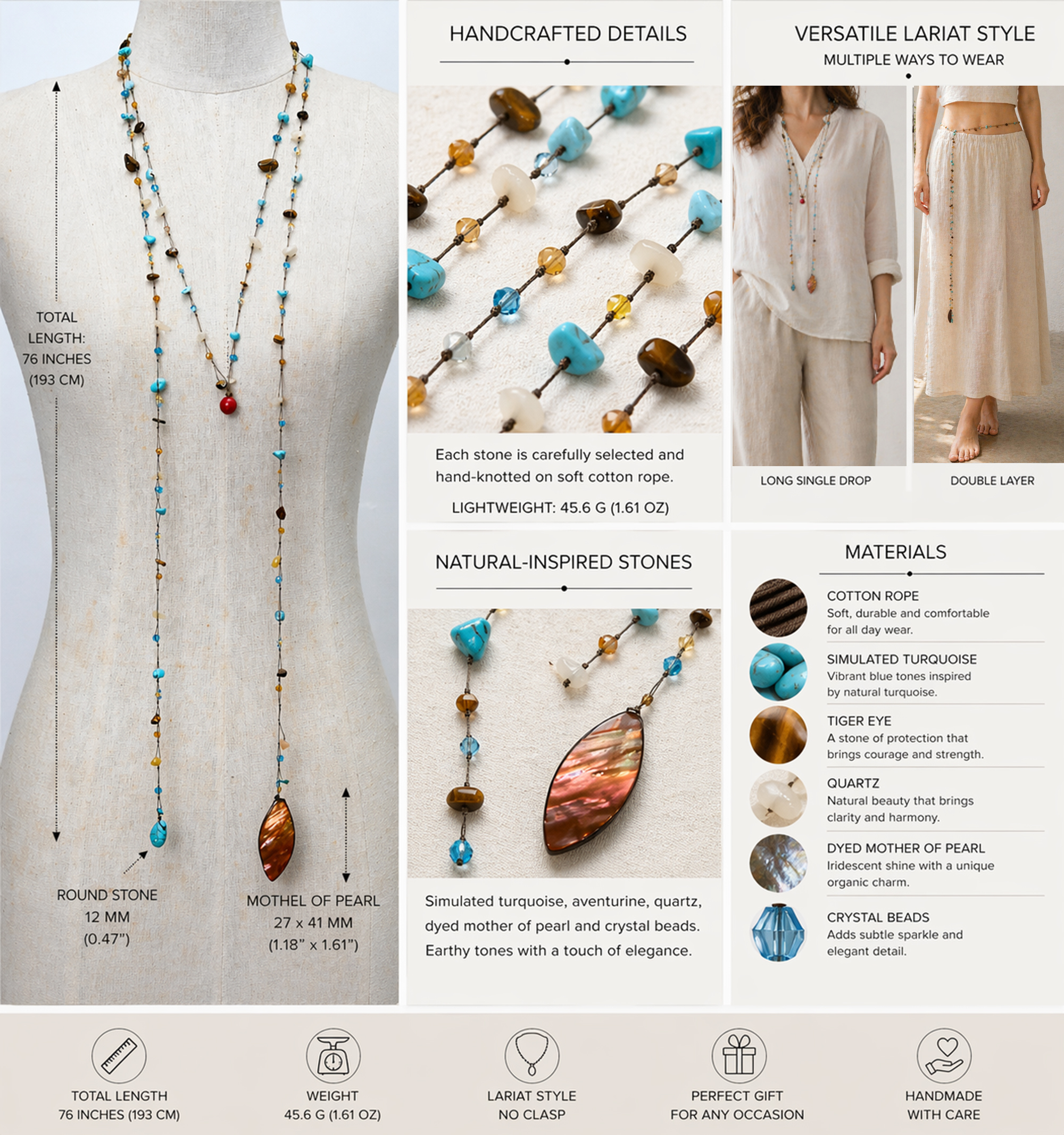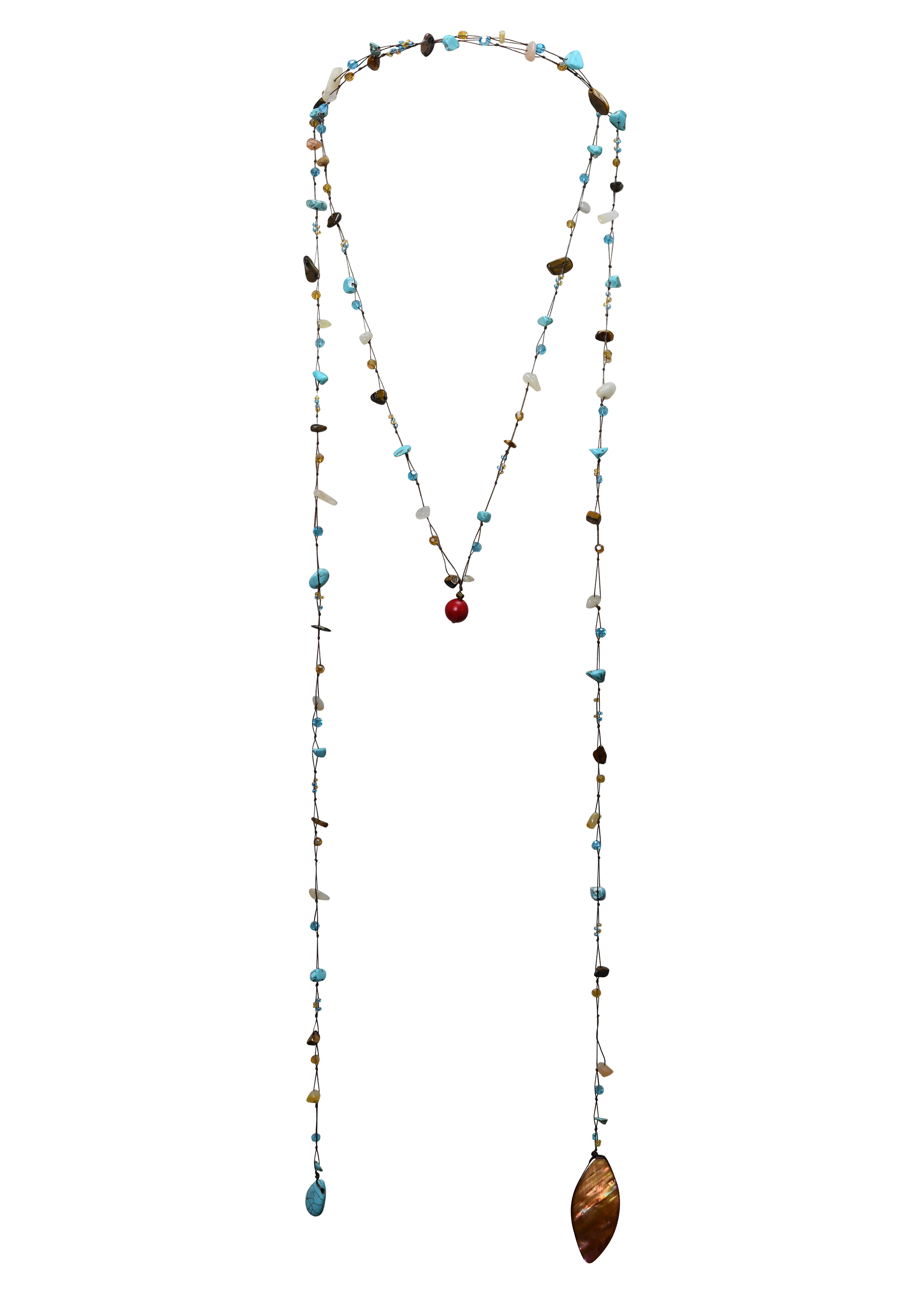 Look to Thai artisan Nom for her unique sense of style and you will be amazed by the beautiful handcrafted pieces in her latest collection. This amazing piece features a beautiful and colorful mix of stones on a chord of cotton rope. A large accent piece is set at the center of this long necklace that can be worn in a multitude of different ways. (This piece comes in a variety of stone and color combinations to choose from). A pair of large accent pieces hang on each end creating a unique finish. Add this elegant lariat wrap around necklace to your collection and you will not be disappointed.