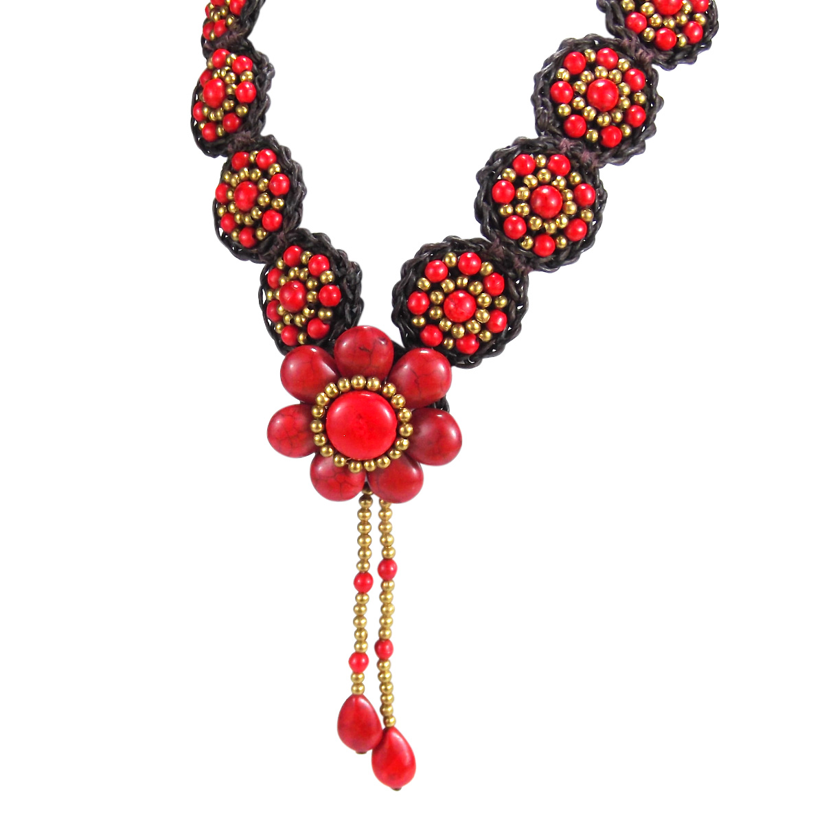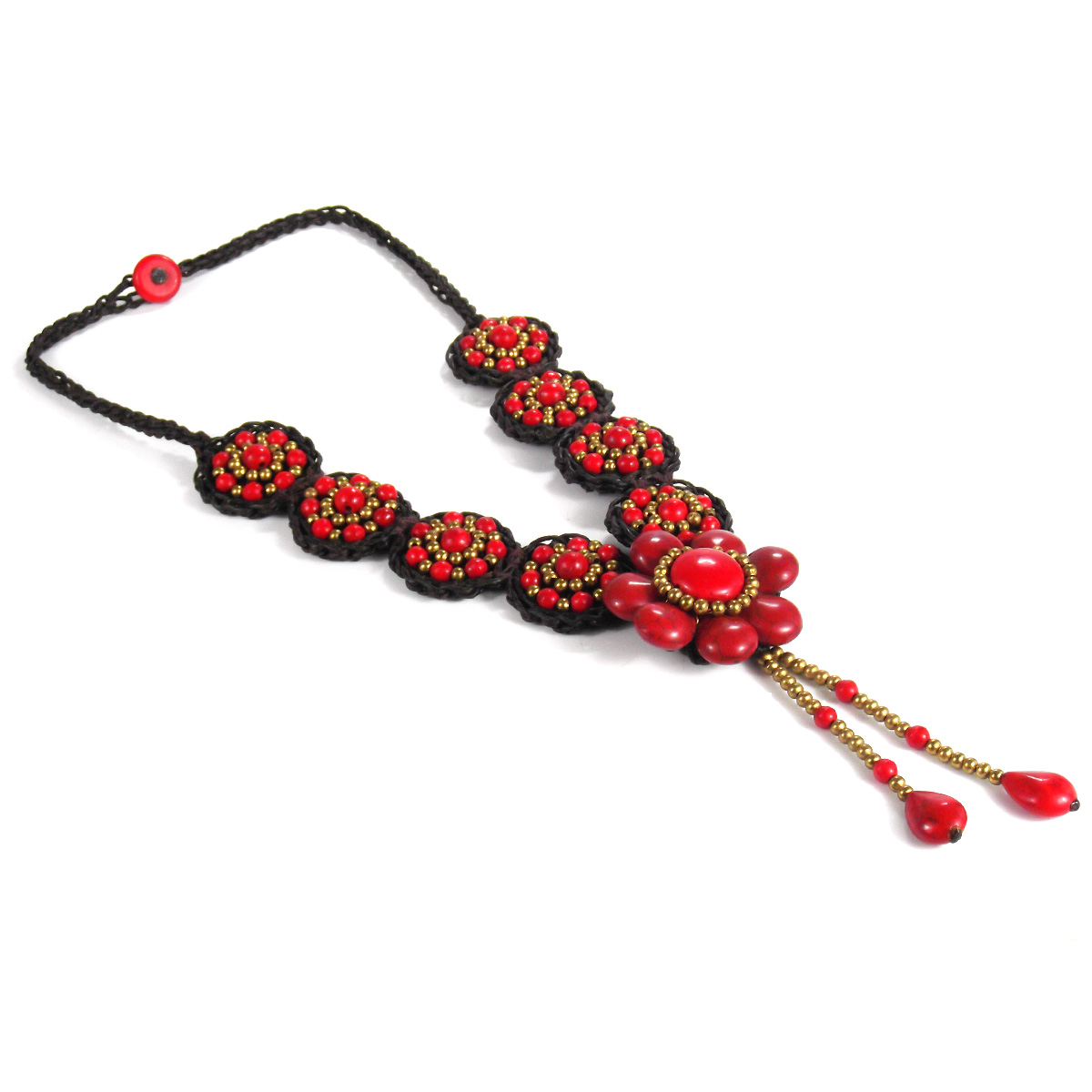 Beautiful flowers blossom with natural stones on crocheted waxed cotton rope. A unique and charming addition to your natural style.